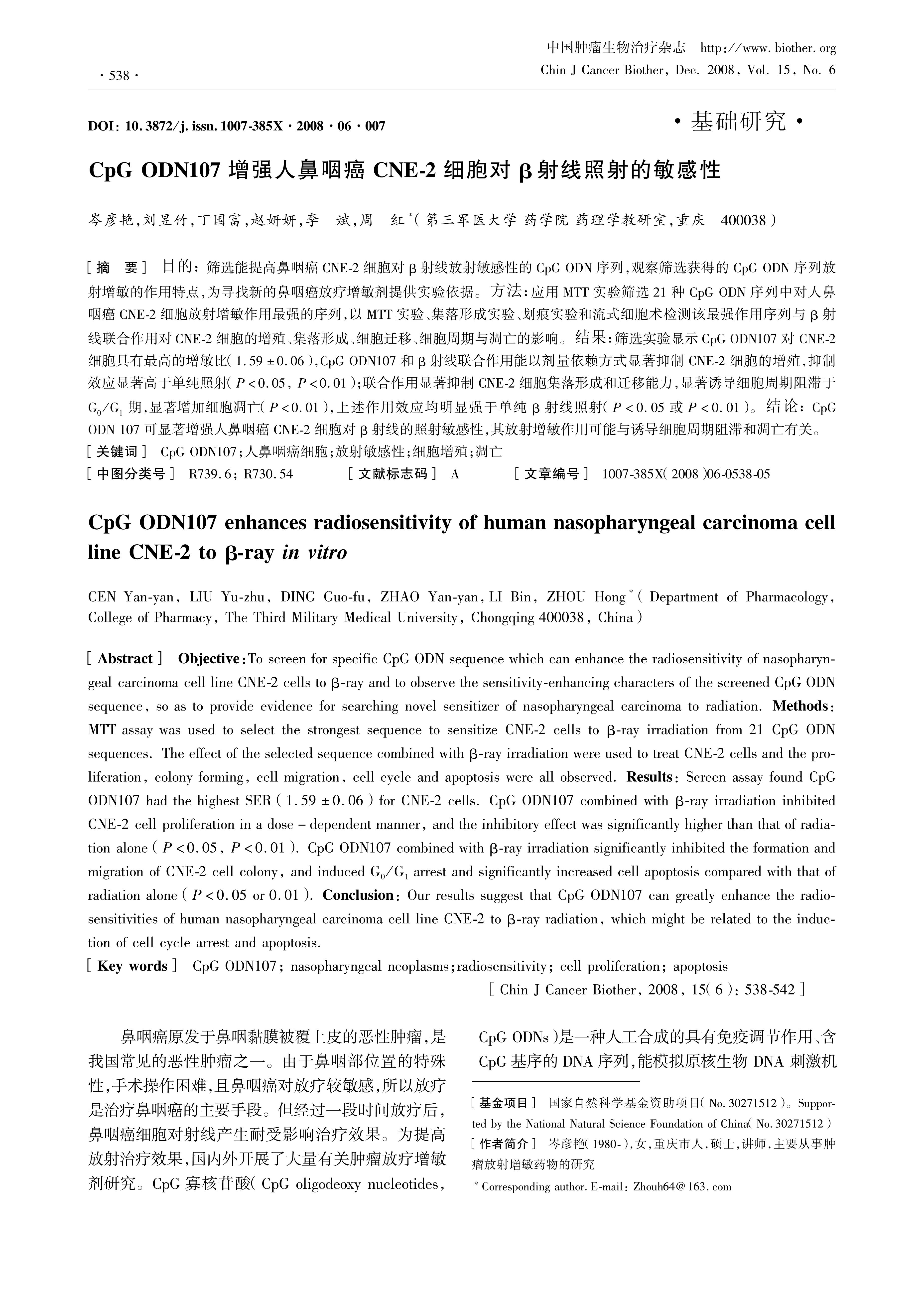 Objective:To screen for specific CpG ODN sequence which can enhance the radiosensitivity of nasopharyngeal carcinoma cell line CNE2 cells to βray and to observe the sensitivityenhancing characters of the screened CpG ODN sequence, so as to provide evidence for searching novel sensitizer of nasopharyngeal carcinoma to radiation. Methods: MTT assay was used to select the strongest sequence to sensitize CNE2 cells to βray irradiation from 21 CpG ODN sequences. The effect of the selected sequence combined with βray irradiation were used to treat CNE2 cells and the proliferation, colony forming, cell migration, cell cycle and apoptosis were all observed. Results: Screen assay found CpG ODN107 had the highest SER (1.59±0.06) for CNE2 cells. CpG ODN107 combined with βray irradiation inhibited CNE2 cell proliferation in a dose-dependent manner, and the inhibitory effect was significantly higher than that of radiation alone (P<0.05, P<0.01). CpG ODN107 combined with βray irradiation significantly inhibited the formation and migration of CNE2 cell colony, and induced G0/G1 arrest and significantly increased cell apoptosis compared with that of radiation alone (P<0.05 or 0.01). Conclusion:Our results suggest that CpG ODN107 can greatly enhance the radiosensitivities of human nasopharyngeal carcinoma cell line CNE2 to βray radiation, which might be related to the induction of cell cycle arrest and apoptosis.