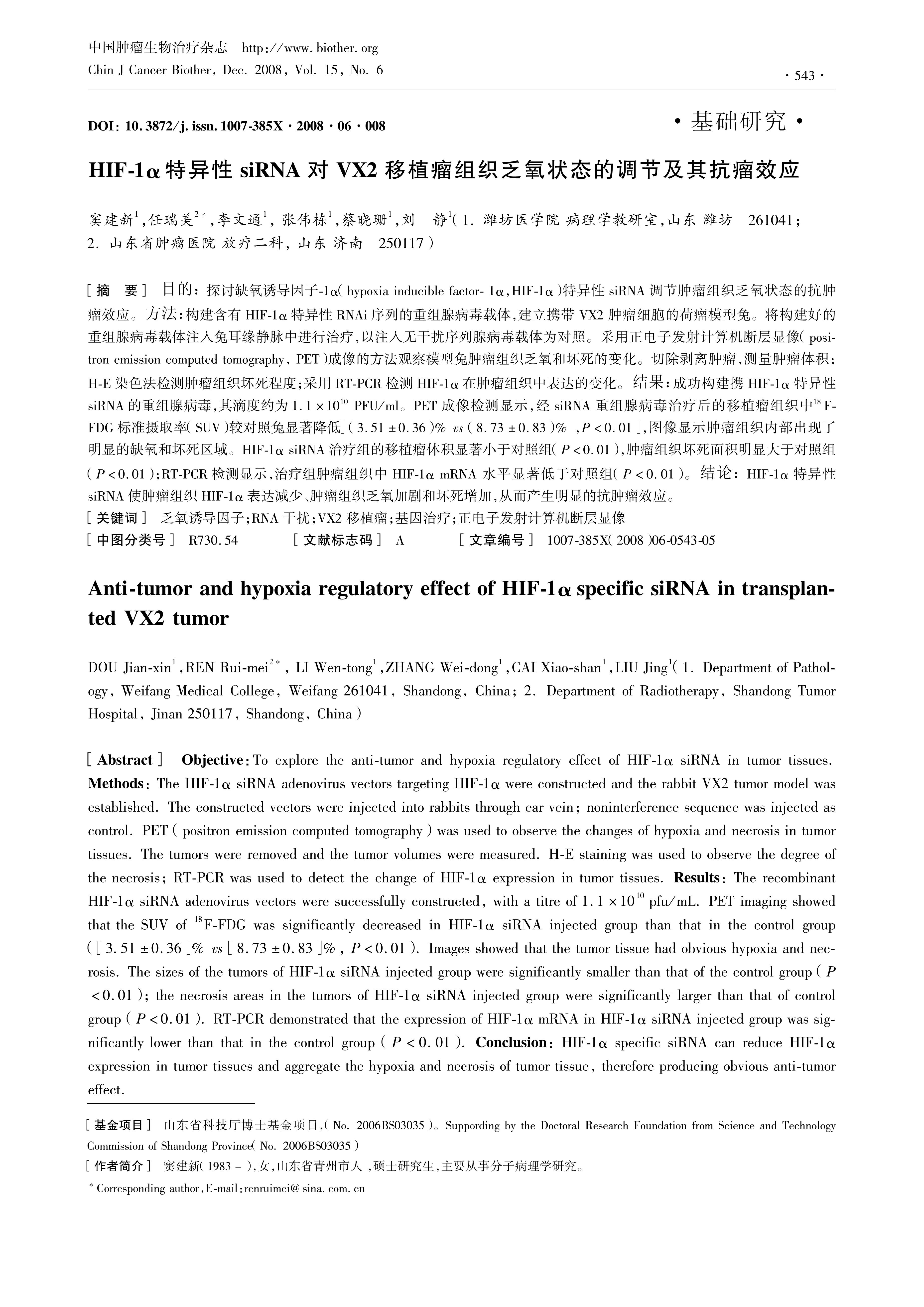 Objective:To explore the antitumor and hypoxia regulatory effect of HIF1α siRNA in tumor tissues. Methods:The HIF1α siRNA adenovirus vectors targeting HIF1α were constructed and the rabbit VX2 tumor model was established. The constructed vectors were injected into rabbits through ear vein; noninterference sequence was injected as control. PET (positron emission computed tomography) was used to observe the changes of hypoxia and necrosis in tumor tissues. The tumors were removed and the tumor volumes were measured. HE staining was used to observe the degree of the necrosis; RTPCR was used to detect the change of HIF1α expression in tumor tissues. Results: The recombinant HIF1α siRNA adenovirus vectors were successfully constructed, with a titre of 1.1×1010 pfu/mL. PET imaging showed that the SUV of 18FFDG was significantly decreased in HIF1α siRNA injected group than that in the control group (\[351±0.36\]% vs \[8.73±0.83\]%, P<0.01). Images showed that the tumor tissue had obvious hypoxia and necrosis. The sizes of the tumors of HIF1α siRNA injected group were significantly smaller than that of the control group (P<0.01); the necrosis areas in the tumors of HIF1α siRNA injected group were significantly larger than that of control group (P<0.01). RTPCR demonstrated that the expression of HIF1α mRNA in HIF1α siRNA injected group was significantly lower than that in the control group (P<0.01). Conclusion: HIF1α specific siRNA can reduce HIF1α expression in tumor tissues and aggregate the hypoxia and necrosis of tumor tissue, therefore producing obvious antitumor effect.