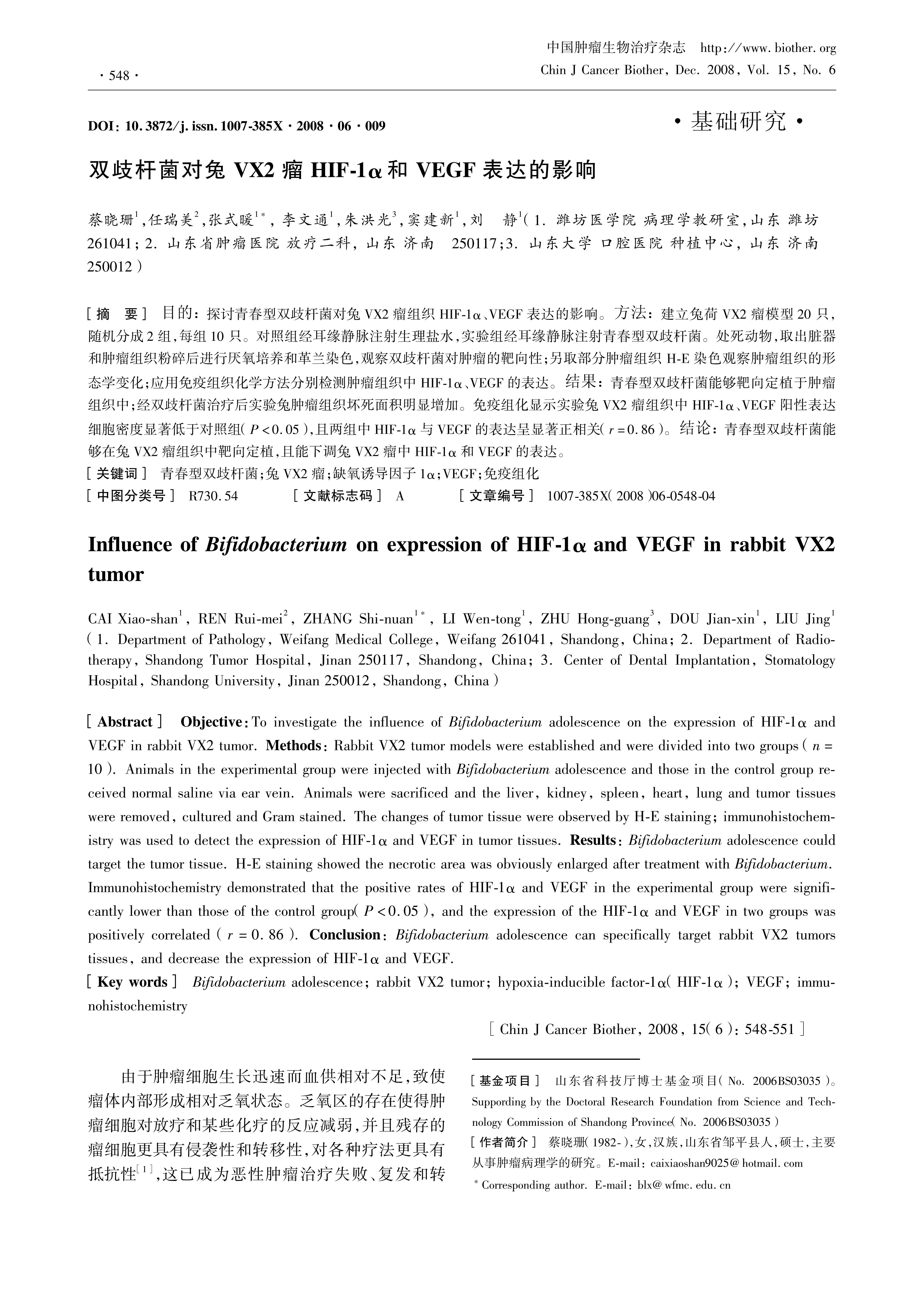 目的: 探讨青春型双歧杆菌对兔VX2瘤组织HIF1α、VEGF表达的影响。方法: 建立兔荷VX2瘤模型20只,随机分成2组,每组10只。对照组经耳缘静脉注射生理盐水,实验组经耳缘静脉注射青春型双歧杆菌。处死动物,取出脏器和肿瘤组织粉碎后进行厌氧培养和革兰染色,观察双歧杆菌对肿瘤的靶向性;另取部分肿瘤组织HE染色观察肿瘤组织的形态学变化;应用免疫组织化学方法分别检测肿瘤组织中HIF1α、VEGF的表达。结果: 青春型双歧杆菌能够靶向定植于肿瘤组织中;经双歧杆菌治疗后实验兔肿瘤组织坏死面积明显增加。免疫组化显示实验兔VX2瘤组织中HIF1α、VEGF阳性表达细胞密度显著低于对照组(P<0.05),且两组中HIF1α与VEGF的表达呈显著正相关(r=0.86)。结论: 青春型双歧杆菌能够在兔VX2瘤组织中靶向定植,且能下调兔VX2瘤中HIF1α和VEGF的表达