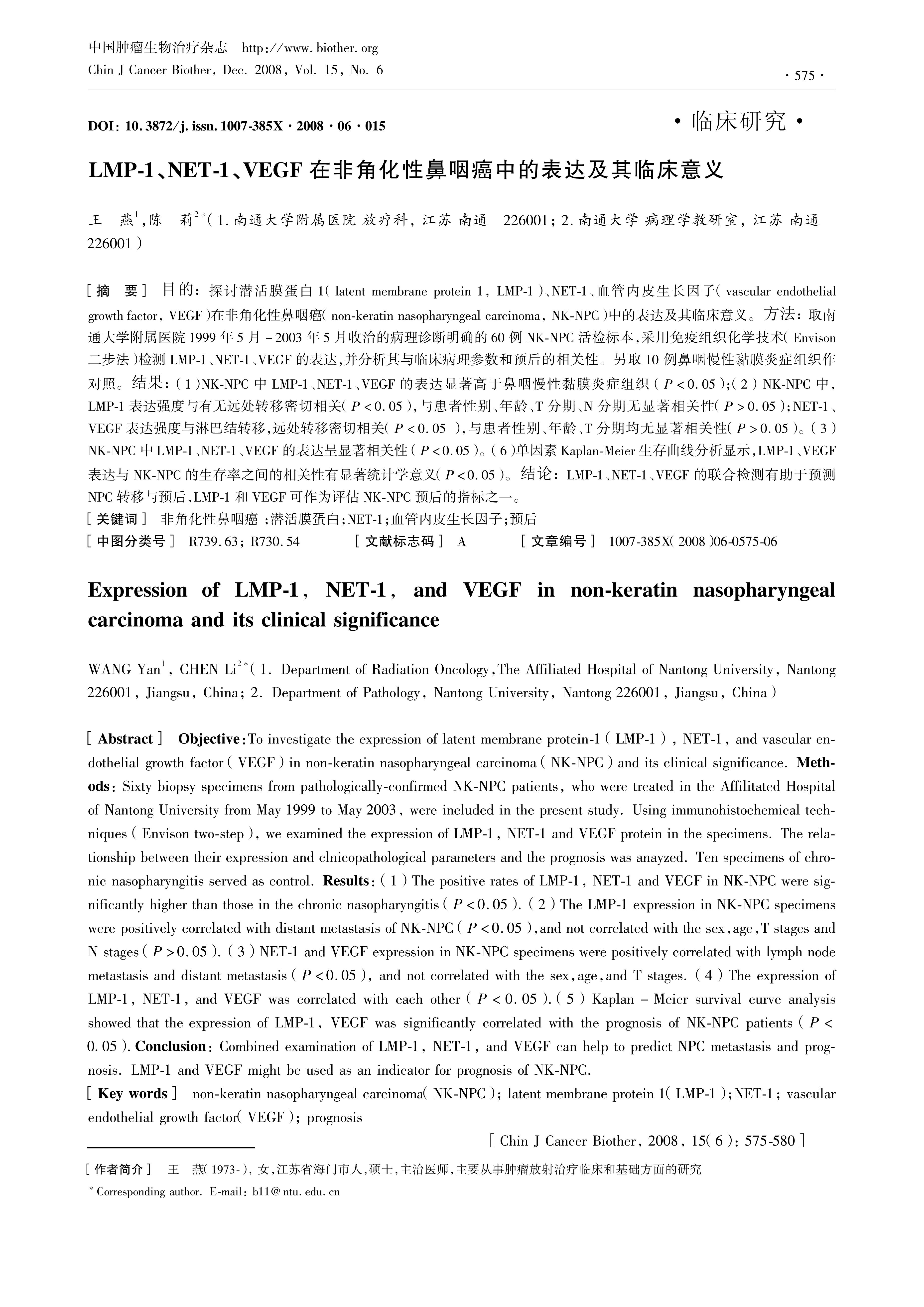 目的: 探讨潜活膜蛋白1(latent membrane protein 1, LMP1)、NET1、血管内皮生长因子(vascular endothelial growth factor, VEGF)在非角化性鼻咽癌(nonkeratin nasopharyngeal carcinoma, NKNPC)中的表达及其临床意义。方法: 取南通大学附属医院1999年5月-2003年5月收治的病理诊断明确的60例NKNPC活检标本,采用免疫组织化学技术(Envison二步法)检测LMP1、NET1、VEGF的表达,并分析其与临床病理参数和预后的相关性。另取10例鼻咽慢性黏膜炎症组织作对照。结果: (1)NKNPC中LMP1、NET1、VEGF的表达显著高于鼻咽慢性黏膜炎症组织 (P<0.05);(2) NKNPC中,LMP1表达强度与有无远处转移密切相关(P<0.05),与患者性别、年龄、T分期、N分期无显著相关性(P>0.05);NET1、VEGF表达强度与淋巴结转移,远处转移密切相关(P<0.05 ),与患者性别、年龄、T分期均无显著相关性(P>0.05)。(3)NKNPC中LMP1、NET1、VEGF的表达呈显著相关性 (P<0.05)。(6)单因素KaplanMeier生存曲线分析显示,LMP1、VEGF表达与NKNPC的生存率之间的相关性有显著统计学意义(P<0.05)。结论: LMP1、NET1、VEGF的联合检测有助于预测NPC转移与预后,LMP1和VEGF可作为评估NKNPC预后的指标之一。