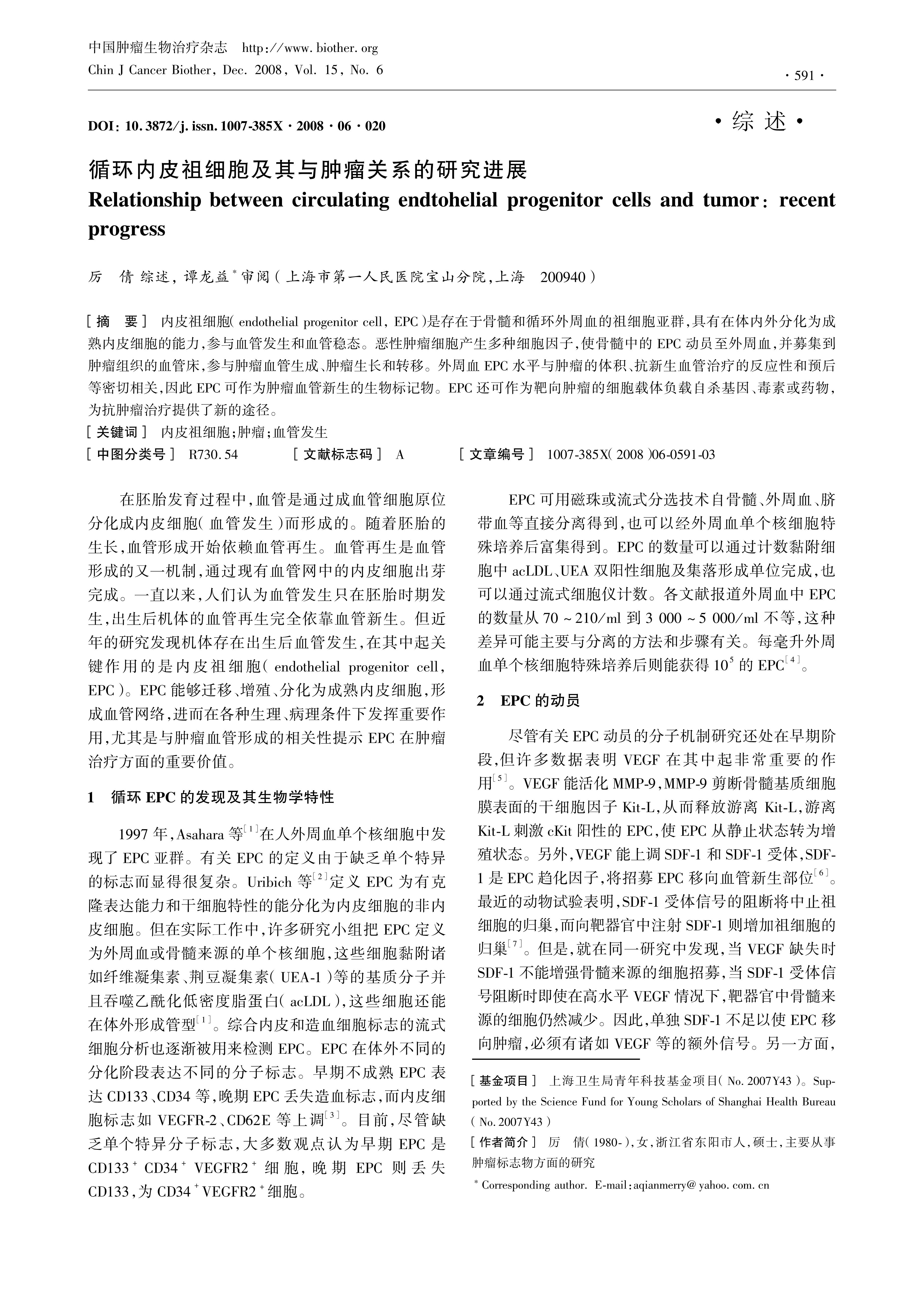 内皮祖细胞(endothelial progenitor cell, EPC)是存在于骨髓和循环外周血的祖细胞亚群,具有在体内外分化为成熟内皮细胞的能力,参与血管发生和血管稳态。恶性肿瘤细胞产生多种细胞因子,使骨髓中的EPC动员至外周血,并募集到肿瘤组织的血管床,参与肿瘤血管生成、肿瘤生长和转移。外周血EPC水平与肿瘤的体积、抗新生血管治疗的反应性和预后等密切相关,因此EPC可作为肿瘤血管新生的生物标记物。EPC还可作为靶向肿瘤的细胞载体负载自杀基因、毒素或药物,为抗肿瘤治疗提供了新的途径。