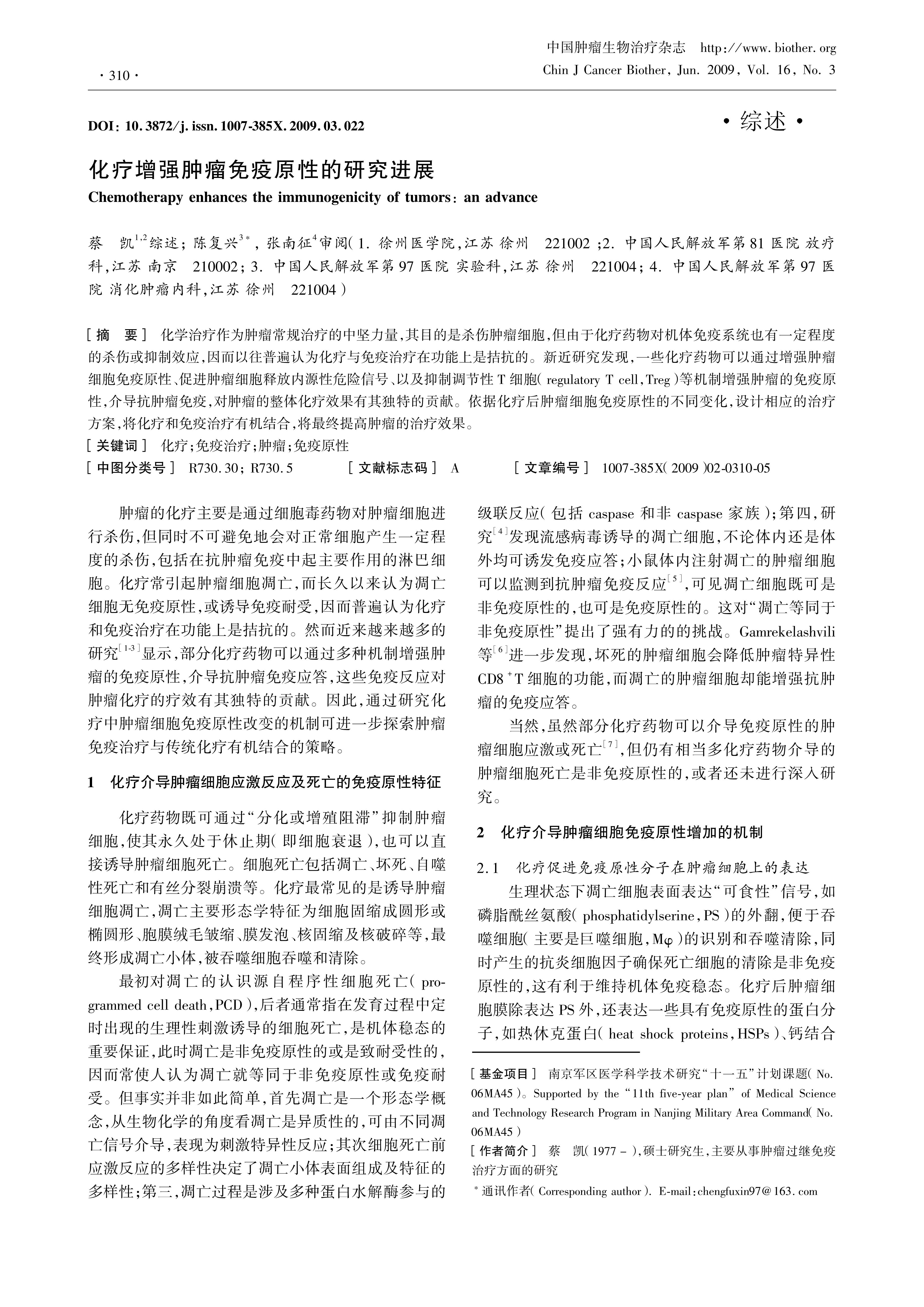 化学治疗作为肿瘤常规治疗的中坚力量,其目的是杀伤肿瘤细胞,但由于化疗药物对机体免疫系统也有一定程度的杀伤或抑制效应,因而以往普遍认为化疗与免疫治疗在功能上是拮抗的。新近研究发现,一些化疗药物可以通过增强肿瘤细胞免疫原性、促进肿瘤细胞释放内源性危险信号、以及抑制调节性T细胞(regulatory T cell,Treg)等机制增强肿瘤的免疫原性,介导抗肿瘤免疫,对肿瘤的整体化疗效果有其独特的贡献。依据化疗后肿瘤细胞免疫原性的不同变化,设计相应的治疗方案,将化疗和免疫治疗有机结合,将最终提高肿瘤的治疗效果。