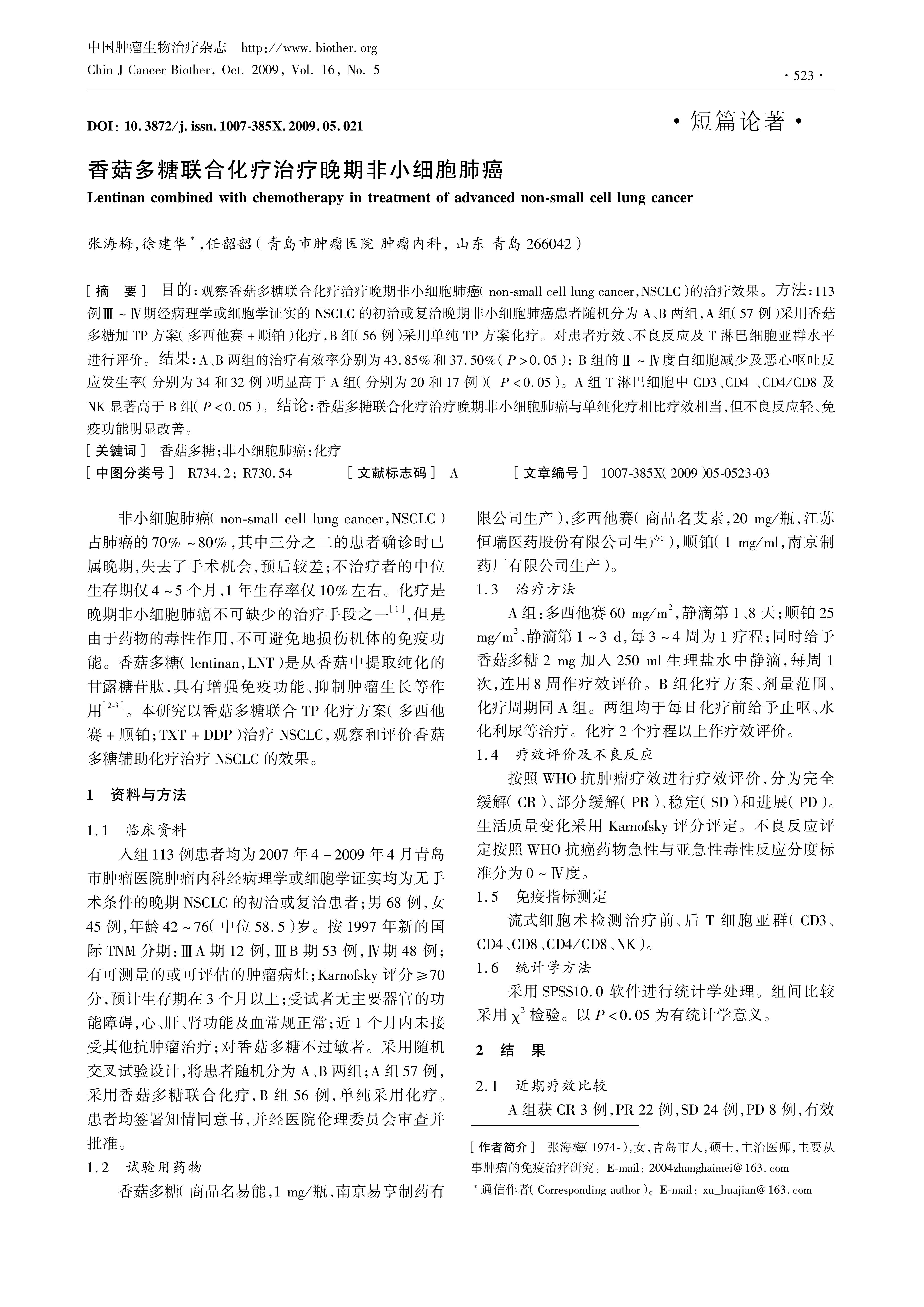 目的:观察香菇多糖联合化疗治疗晚期非小细胞肺癌(nonsmall cell lung cancer,NSCLC)的治疗效果。方法:113例Ⅲ~Ⅳ期经病理学或细胞学证实的NSCLC的初治或复治晚期非小细胞肺癌患者随机分为A、B两组,A组(57例)采用香菇多糖加TP方案(多西他赛+顺铂)化疗,B组(56例)采用单纯TP方案化疗。对患者疗效、不良反应及T淋巴细胞亚群水平进行评价。结果:A、B两组的治疗有效率分别为43.85%和37.50%(P>0.05); B组的Ⅱ~Ⅳ度白细胞减少及恶心呕吐反应发生率(分别为34和32例)明显高于A组(分别为20和17例)( P<0.05)。A组T淋巴细胞中CD3、CD4 、CD4/CD8及NK显著高于B组(P<0.05)。结论:香菇多糖联合化疗治疗晚期非小细胞肺癌与单纯化疗相比疗效相当,但不良反应轻、免疫功能明显改善。