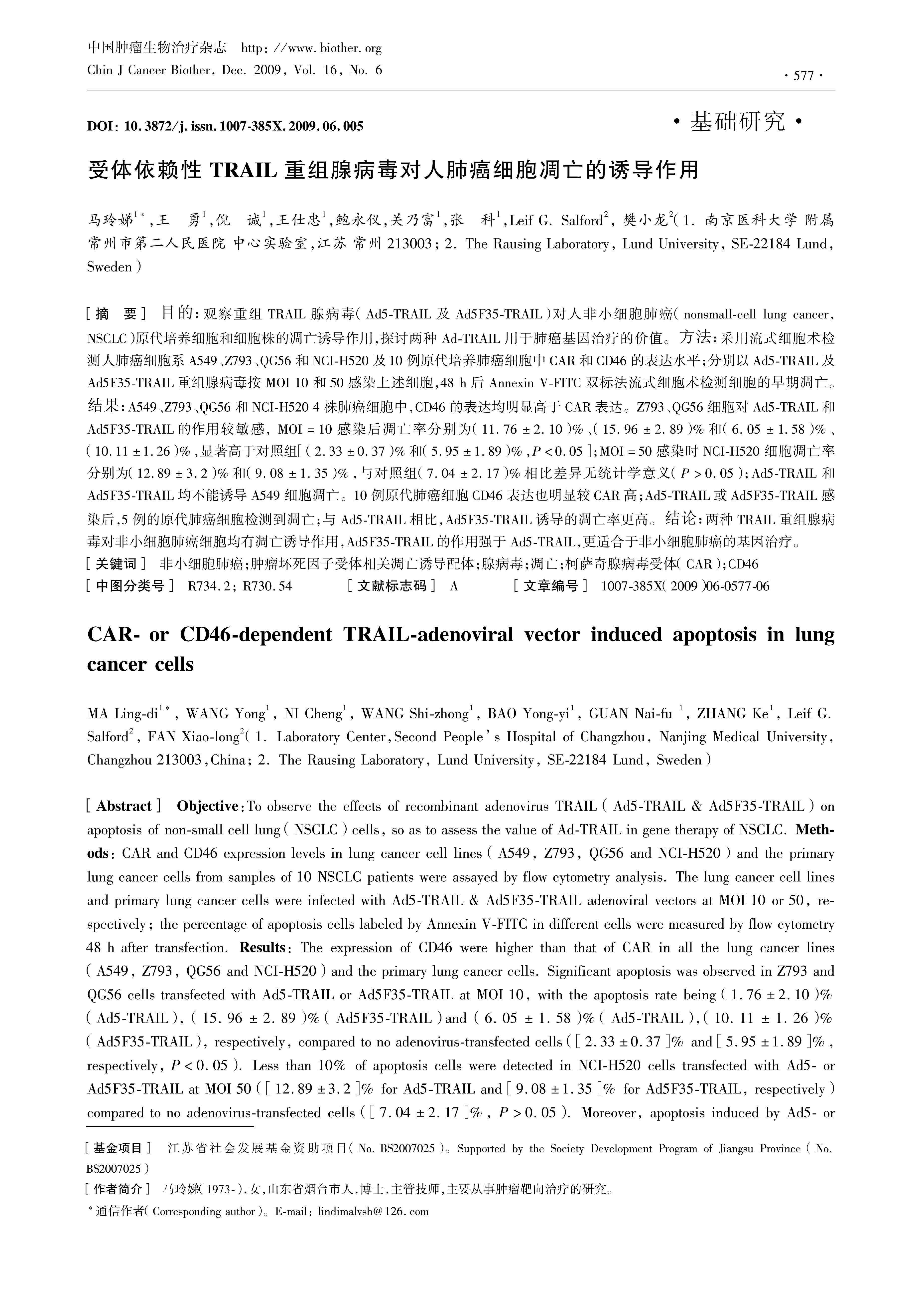 Objective:To observe the effects of recombinant adenovirus TRAIL (Ad5TRAIL & Ad5F35TRAIL) on apoptosis of nonsmall cell lung (NSCLC) cells, so as to assess the value of AdTRAIL in gene therapy of NSCLC. :Methods: :CAR and CD46 expression levels in lung cancer cell lines (A549, Z793, QG56 and NCIH520) and the primary lung cancer cells from samples of 10 NSCLC patients were assayed by flow cytometry analysis. The lung cancer cell lines and primary lung cancer cells were infected with Ad5TRAIL & Ad5F35TRAIL adenoviral vectors at MOI 10 or 50, respectively; the percentage of apoptosis cells labeled by Annexin VFITC in different cells were measured by flow cytometry 48 h after transfection. :Results:: The expression of CD46 were higher than that of CAR in all the lung cancer lines (A549, Z793, QG56 and NCIH520) and the primary lung cancer cells. Significant apoptosis was observed in Z793 and QG56 cells transfected with Ad5TRAIL or Ad5F35TRAIL at MOI 10, with the apoptosis rate being (1.76±2.10)%(Ad5TRAIL), (15.96±2.89)%(Ad5F35TRAIL)and (6.05±1.58)%(Ad5TRAIL),(10.11±1.26)%(Ad5F35TRAIL), respectively, compared to no adenovirustransfected cells (\[2.33±0.37\]% and \[5.95±1.89\]%, respectively, P<0.05). Less than 10% of apoptosis cells were detected in NCIH520 cells transfected with Ad5 or Ad5F35TRAIL at MOI 50 (\[12.89±3.2\]% for Ad5TRAIL and \[9.08±1.35\]% for Ad5F35TRAIL, respectively)compared to no adenovirustransfected cells (\[7.04±2.17\]%, P>0.05). Moreover, apoptosis induced by Ad5 or Ad5F35TRAIL transfection in A549 cells was not detected both at MOI 10 and 50. About half of the primary lung cancer cells from 10 patients induced apoptosis after transfected with Ad5TRAIL or Ad5F35TRAIL vector. A higher percentage of apoptotic cells were found in Ad5F35TRAIL group than those in Ad5TRAIL and control groups. :Conclusion: :Ad5TRAIL can induce apoptosis of NSCLC cells in vitro, and Ad5F35TRAIL is more potent than Ad5TRAIL, so Ad5F35TRAIL is more suitable for gene therapy of NSCLC.