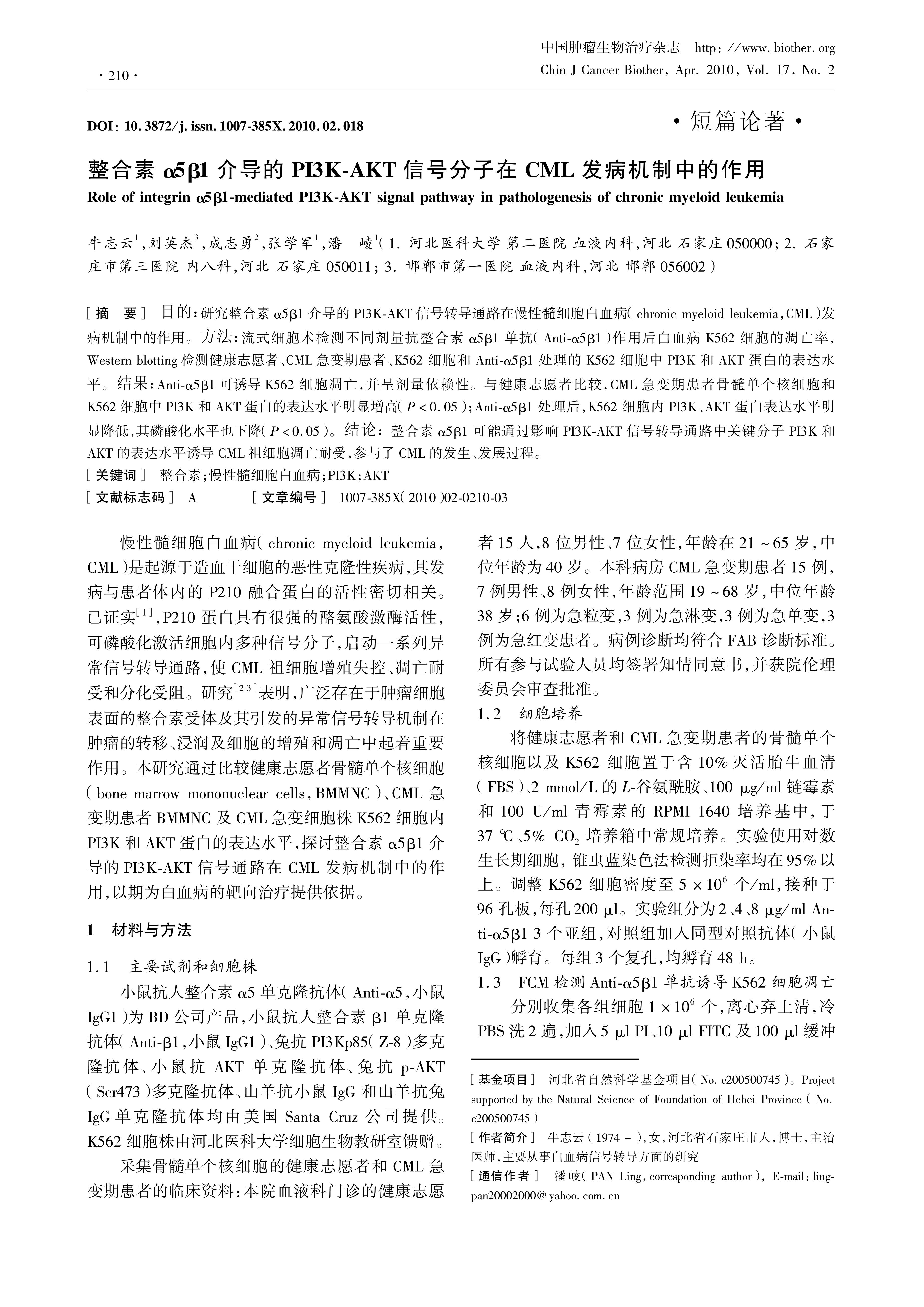 摘 要 目的:研究整合素α5β1介导的PI3K-AKT信号转导通路在慢性髓细胞白血病(chronic myeloid leukemia,CML)发病机制中的作用。方法:流式细胞术检测不同剂量抗整合素α5β1单抗(Anti-α5β1)作用后白血病K562细胞的凋亡率, Western blotting检测健康志愿者、CML急变期患者、K562细胞和Anti-α5β1处理的K562细胞中PI3K和AKT蛋白的表达水平。结果:Anti-α5β1可诱导K562细胞凋亡,并呈剂量依赖性。与健康志愿者比较,CML急变期患者骨髓单个核细胞和K562细胞中PI3K和AKT蛋白的表达水平明显增高(P<0.05);Anti-α5β1处理后,K562细胞内PI3K、AKT蛋白表达水平明显降低,其磷酸化水平也下降(P<0.05)。结论: 整合素α5β1可能通过影响PI3K-AKT信号转导通路中关键分子PI3K和AKT的表达水平诱导CML祖细胞凋亡耐受,参与了CML的发生、发展过程。