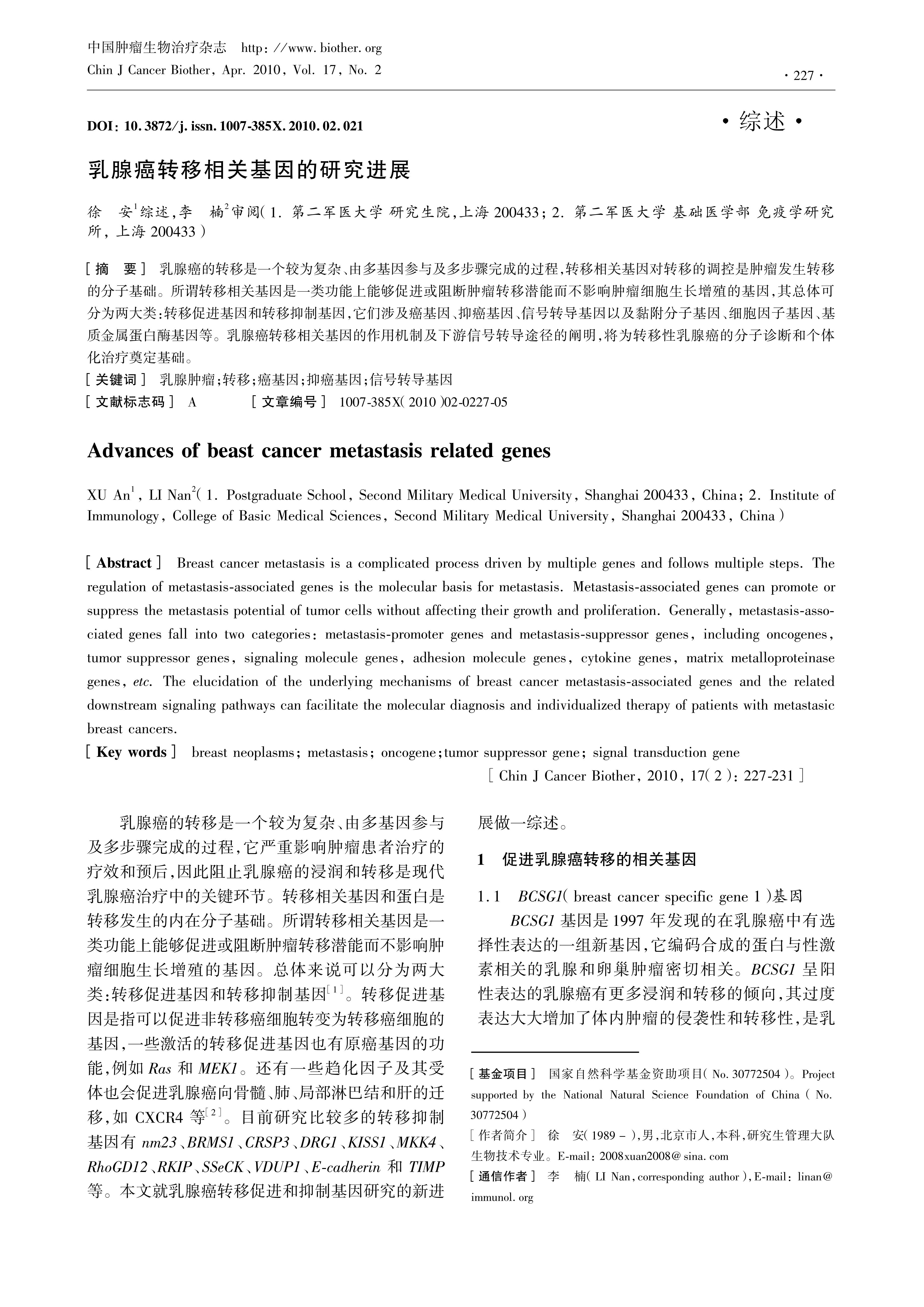 摘 要 乳腺癌的转移是一个较为复杂、由多基因参与及多步骤完成的过程,转移相关基因对转移的调控是肿瘤发生转移的分子基础。所谓转移相关基因是一类功能上能够促进或阻断肿瘤转移潜能而不影响肿瘤细胞生长增殖的基因,其总体可分为两大类:转移促进基因和转移抑制基因,它们涉及癌基因、抑癌基因、信号转导基因以及黏附分子基因、细胞因子基因、基质金属蛋白酶基因等。乳腺癌转移相关基因的作用机制及下游信号转导途径的阐明,将为转移性乳腺癌的分子诊断和个体化治疗奠定基础。