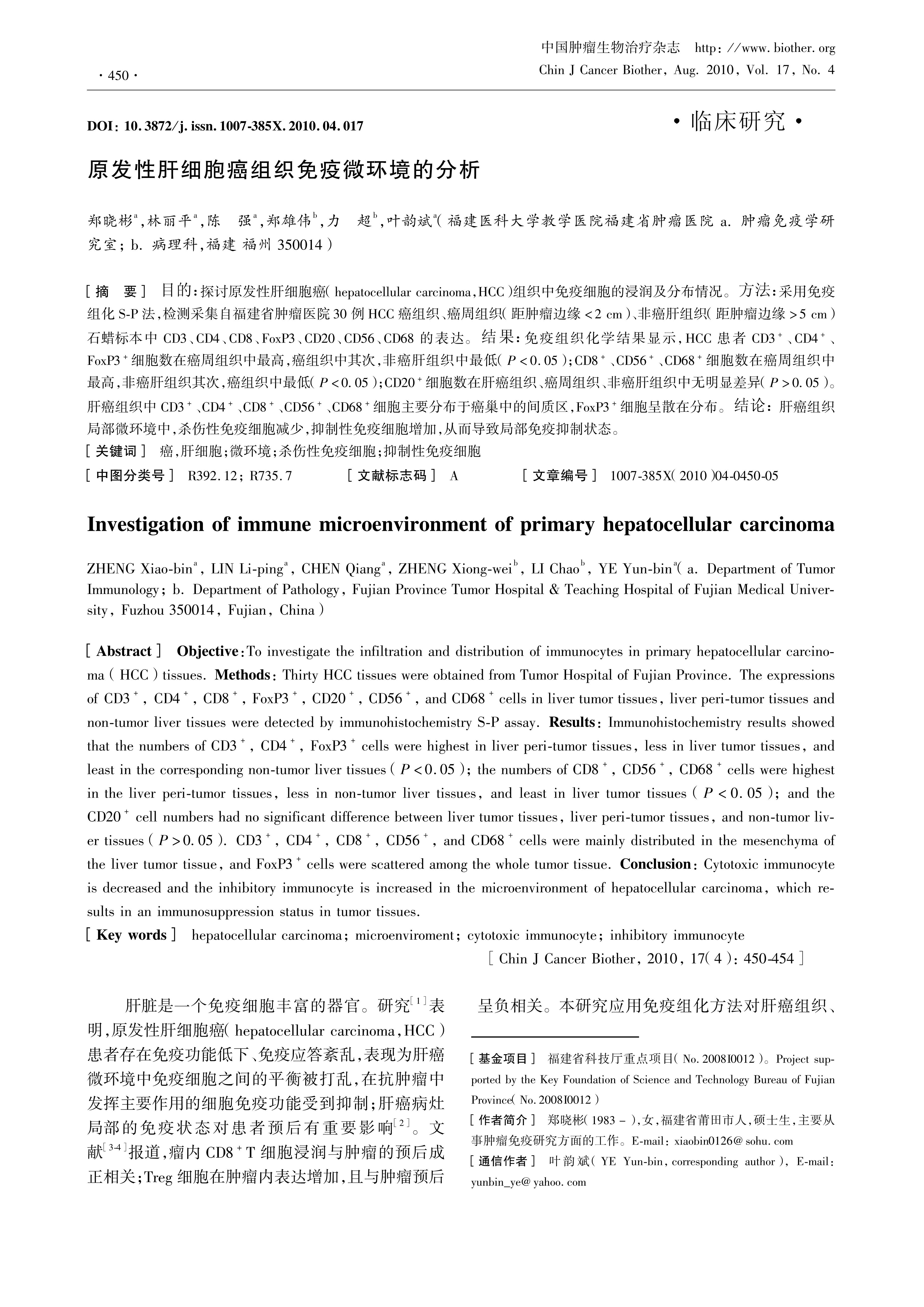 目的: 探讨原发性肝细胞癌(hepatocellular carcinoma,HCC)组织中免疫细胞的浸润及分布情况。 方法: 采用免疫组化S-P法,检测采集自福建省肿瘤医院30例HCC癌组织、癌周组织(距肿瘤边缘<2 cm)、非癌肝组织(距肿瘤边缘>5 cm)石蜡标本中CD3、CD4、CD8、FoxP3、CD20、CD56、CD68的表达。 结果: 免疫组织化学结果显示,HCC患者CD3+、CD4+、FoxP3+细胞数在癌周组织中最高,癌组织中其次,非癌肝组织中最低(P<0.05);CD8+、CD56+、CD68+细胞数在癌周组织中最高,非癌肝组织其次,癌组织中最低(P<005);CD20+细胞数在肝癌组织、癌周组织、非癌肝组织中无明显差异(P>005)。肝癌组织中CD3+、CD4+、CD8+、CD56+、CD68+细胞主要分布于癌巢中的间质区,FoxP3+细胞呈散在分布。 结论: 肝癌组织局部微环境中,杀伤性免疫细胞减少,抑制性免疫细胞增加,从而导致局部免疫抑制状态。