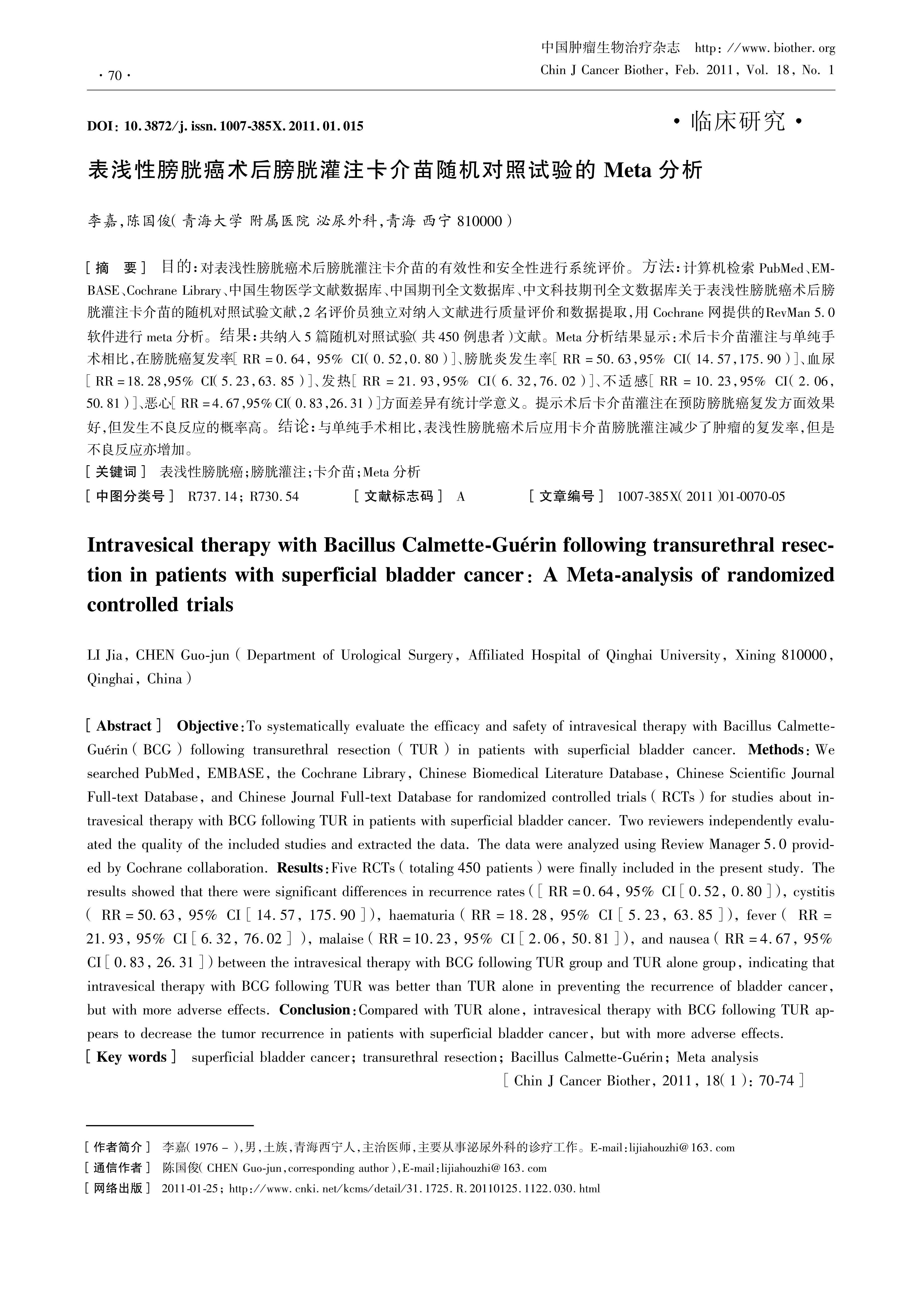Objective:To systematically evaluate the efficacy and safety of intravesical therapy with Bacillus Calmette-Guérin (BCG) following transurethral resection (TUR) in patients with superficial bladder cancer. Methods:We searched PubMed, EMBASE, the Cochrane Library, Chinese Biomedical Literature Database, Chinese Scientific Journal Full-text Database, and Chinese Journal Full-text Database for randomized controlled trials (RCTs) for studies about intravesical therapy with BCG following TUR in patients with superficial bladder cancer. Two reviewers independently evaluated the quality of the included studies and extracted the data. The data were analyzed using Review Manager 5.0 provided by Cochrane collaboration. Results:Five RCTs (totaling 450 patients) were finally included in the present study. The results showed that there were significant differences in recurrence rates (\[RR=0.64, 95% CI \[0.52, 0.80\]), cystitis ( RR=5063, 95% CI \[14.57, 175.90\]), haematuria (RR=18.28, 95% CI \[5.23, 63.85\]), fever ( RR=2193, 95% CI \[632, 76.02\] ), malaise (RR=10.23, 95% CI \[2.06, 50.81\]), and nausea (RR=4.67, 95% CI \[0.83, 2631\]) between the intravesical therapy with BCG following TUR group and TUR alone group, indicating that intravesical therapy with BCG following TUR was better than TUR alone in preventing the recurrence of bladder cancer, but with more adverse effects. Conclusion:Compared with TUR alone, intravesical therapy with BCG following TUR appears to decrease the tumor recurrence in patients with superficial bladder cancer, but with more adverse effects.