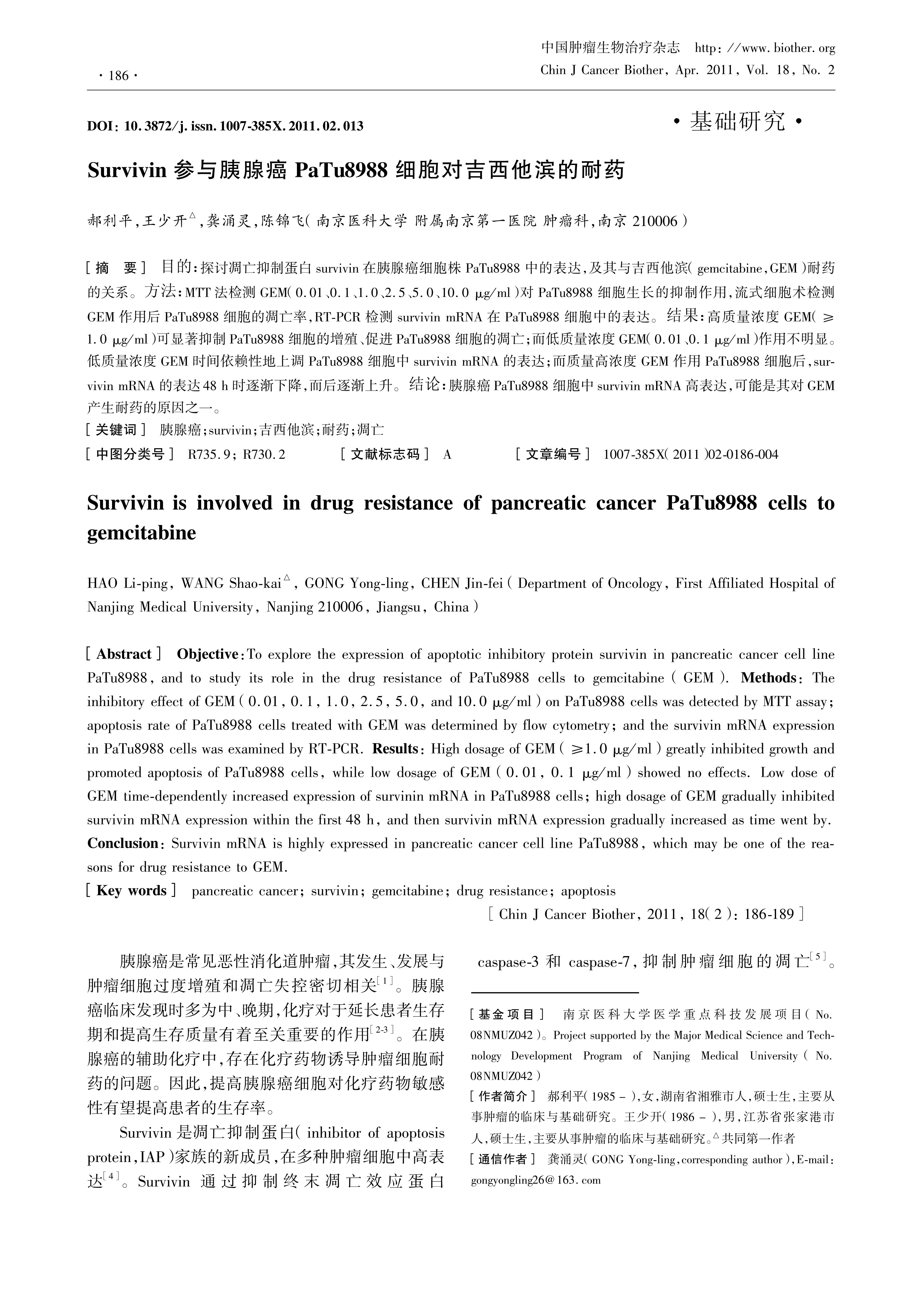 目的:探讨凋亡抑制蛋白survivin在胰腺癌细胞株PaTu8988中的表达,及其与吉西他滨(gemcitabine,GEM)耐药的关系。方法:MTT法检测GEM(0.01、0.1、1.0、2.5、5.0、10.0 μg/ml)对PaTu8988细胞生长的抑制作用,流式细胞术检测GEM作用后PaTu8988细胞的凋亡率,RT-PCR检测survivin mRNA在PaTu8988细胞中的表达。结果:高质量浓度GEM(≥1.0 μg/ml)可显著抑制PaTu8988细胞的增殖、促进PaTu8988细胞的凋亡;而低质量浓度GEM(0.01、0.1 μg/ml)作用不明显。低质量浓度GEM时间依赖性地上调PaTu8988细胞中survivin mRNA的表达;而质量高浓度GEM作用PaTu8988细胞后,survivin mRNA的表达48 h时逐渐下降,而后逐渐上升。结论:胰腺癌PaTu8988细胞中survivin mRNA高表达,可能是其对GEM产生耐药的原因之一。