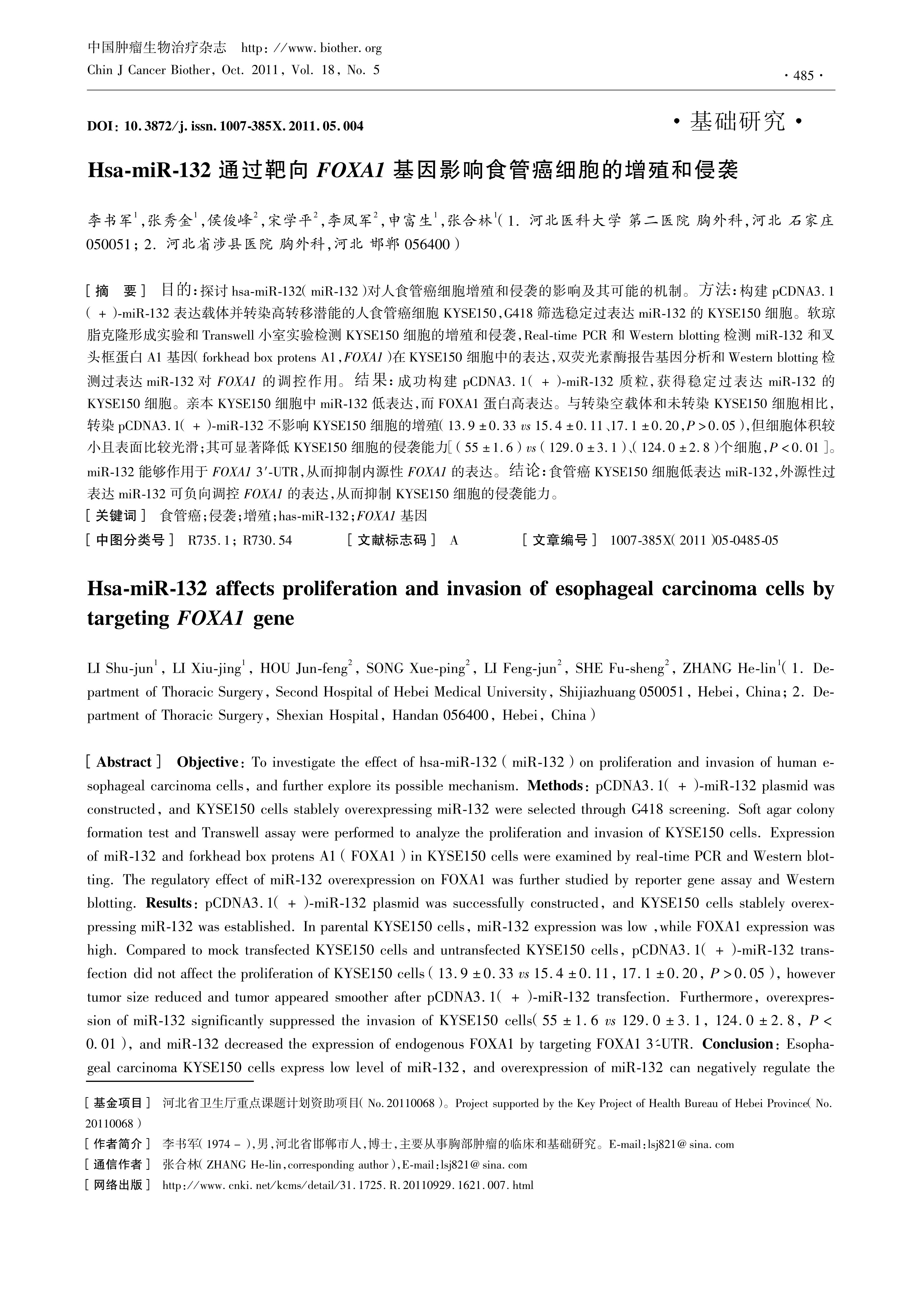 目的:探讨hsamiR132(miR132)对人食管癌细胞增殖和侵袭的影响及其可能的机制。方法:构建pCDNA3.1(+)miR132表达载体并转染高转移潜能的人食管癌细胞KYSE150,G418筛选稳定过表达miR132的KYSE150细胞。软琼脂克隆形成实验和Transwell小室实验检测KYSE150细胞的增殖和侵袭,Realtime PCR和Western blotting检测miR132和叉头框蛋白A1基因(forkhead box protens A1,FOXA1)在KYSE150细胞中的表达,双荧光素酶报告基因分析和Western blotting检测过表达miR132对FOXA1的调控作用。结果:成功构建pCDNA3.1(+)miR132质粒,获得稳定过表达miR132的KYSE150细胞。亲本KYSE150细胞中miR132低表达,而FOXA1蛋白高表达。与转染空载体和未转染KYSE150细胞相比,转染pCDNA3.1(+)miR132不影响KYSE150细胞的增殖(13.9±0.33 vs 15.4±0.11、17.1±0.20,P>0.05),但细胞体积较小且表面比较光滑;其可显著降低KYSE150细胞的侵袭能力\[(55±1.6) vs (129.0±3.1)、(124.0±2.8)个细胞,P<0.01\]。miR132能够作用于FOXA1 3′UTR,从而抑制内源性FOXA1的表达。结论:食管癌KYSE150细胞低表达miR132,外源性过表达miR132可负向调控FOXA1的表达,从而抑制KYSE150细胞的侵袭能力。