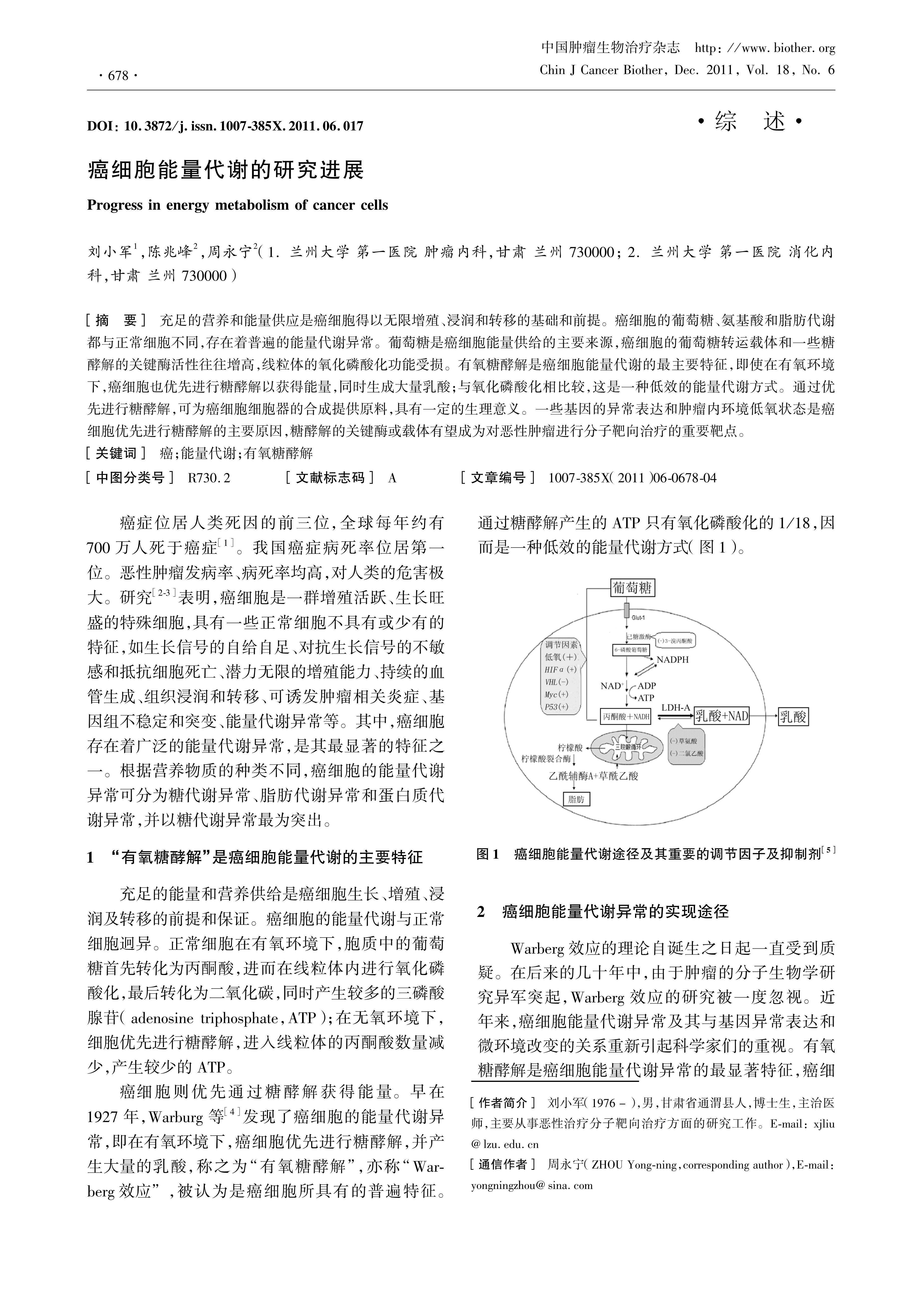 充足的营养和能量供应是癌细胞得以无限增殖、浸润和转移的基础和前提。癌细胞的葡萄糖、氨基酸和脂肪代谢都与正常细胞不同,存在着普遍的能量代谢异常。葡萄糖是癌细胞能量供给的主要来源,癌细胞的葡萄糖转运载体和一些糖酵解的关键酶活性往往增高,线粒体的氧化磷酸化功能受损。有氧糖酵解是癌细胞能量代谢的最主要特征,即使在有氧环境下,癌细胞也优先进行糖酵解以获得能量,同时生成大量乳酸;与氧化磷酸化相比较,这是一种低效的能量代谢方式。通过优先进行糖酵解,可为癌细胞细胞器的合成提供原料,具有一定的生理意义。一些基因的异常表达和肿瘤内环境低氧状态是癌细胞优先进行糖酵解的主要原因,糖酵解的关键酶或载体有望成为对恶性肿瘤进行分子靶向治疗的重要靶点。