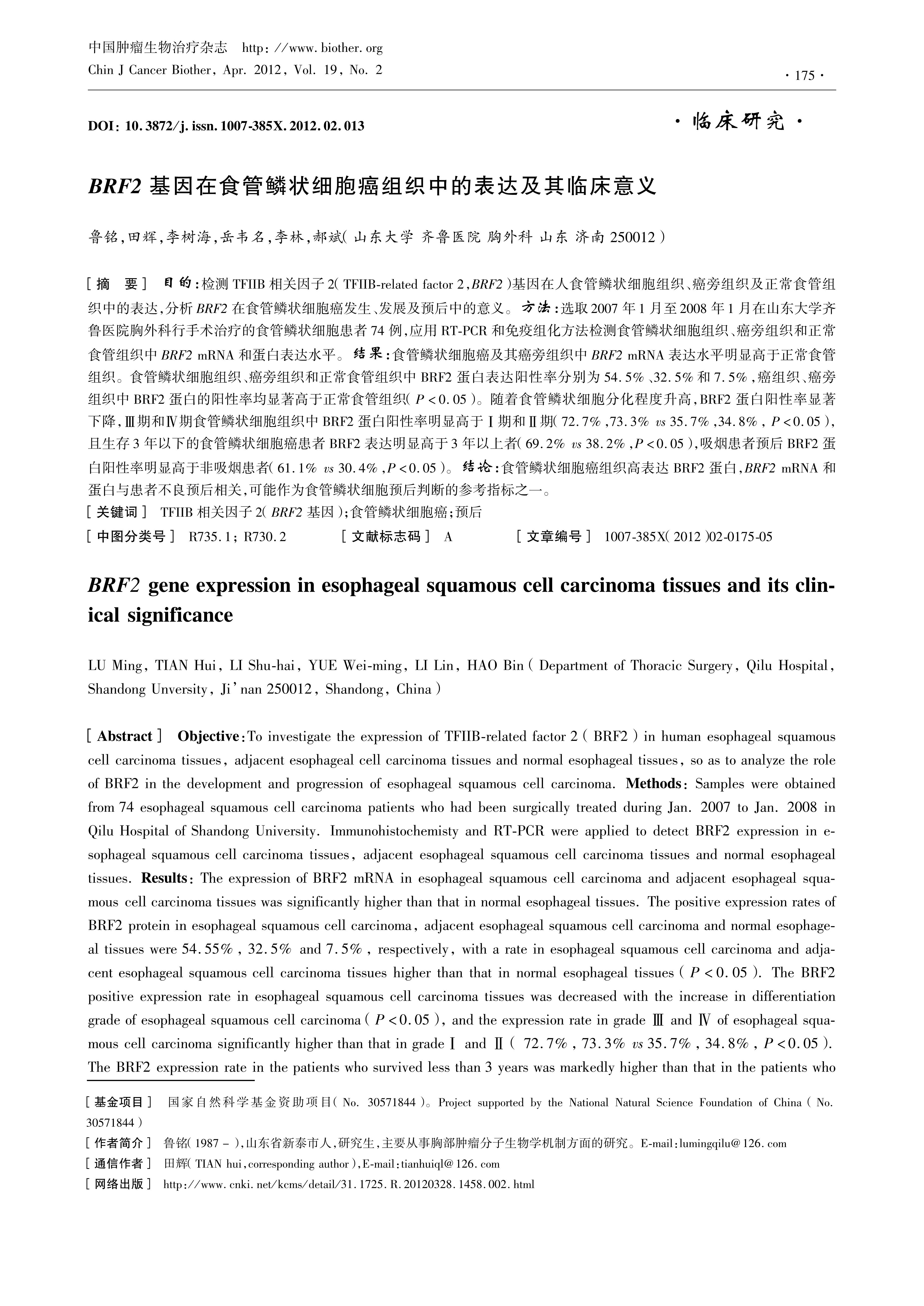 目的:检测TFIIB相关因子2(TFIIB-related factor 2,BRF2)基因在人食管鳞状细胞组织、癌旁组织及正常食管组织中的表达,分析BRF2在食管鳞状细胞癌发生、发展及预后中的意义。方法:选取2007年1月至2008年1月在山东大学齐鲁医院胸外科行手术治疗的食管鳞状细胞患者74例,应用RT-PCR和免疫组化方法检测食管鳞状细胞组织、癌旁组织和正常食管组织中BRF2 mRNA和蛋白表达水平。结果:食管鳞状细胞癌及其癌旁组织中BRF2 mRNA表达水平明显高于正常食管组织。食管鳞状细胞组织、癌旁组织和正常食管组织中BRF2蛋白表达阳性率分别为54.5%、32.5%和7.5%,癌组织、癌旁组织中BRF2蛋白的阳性率均显著高于正常食管组织(P<0.05)。随着食管鳞状细胞分化程度升高,BRF2蛋白阳性率显著下降,Ⅲ期和Ⅳ期食管鳞状细胞组织中BRF2蛋白阳性率明显高于Ⅰ期和Ⅱ期(72.7%,73.3% vs 35.7%,34.8%, P<0.05),且生存3年以下的食管鳞状细胞癌患者BRF2表达明显高于3年以上者(69.2% vs 38.2%,P<0.05),吸烟患者预后BRF2蛋白阳性率明显高于非吸烟患者(61.1% vs 30.4%,P<0.05)。结论:食管鳞状细胞癌组织高表达BRF2蛋白,BRF2 mRNA和蛋白与患者不良预后相关,可能作为食管鳞状细胞预后判断的参考指标之一。