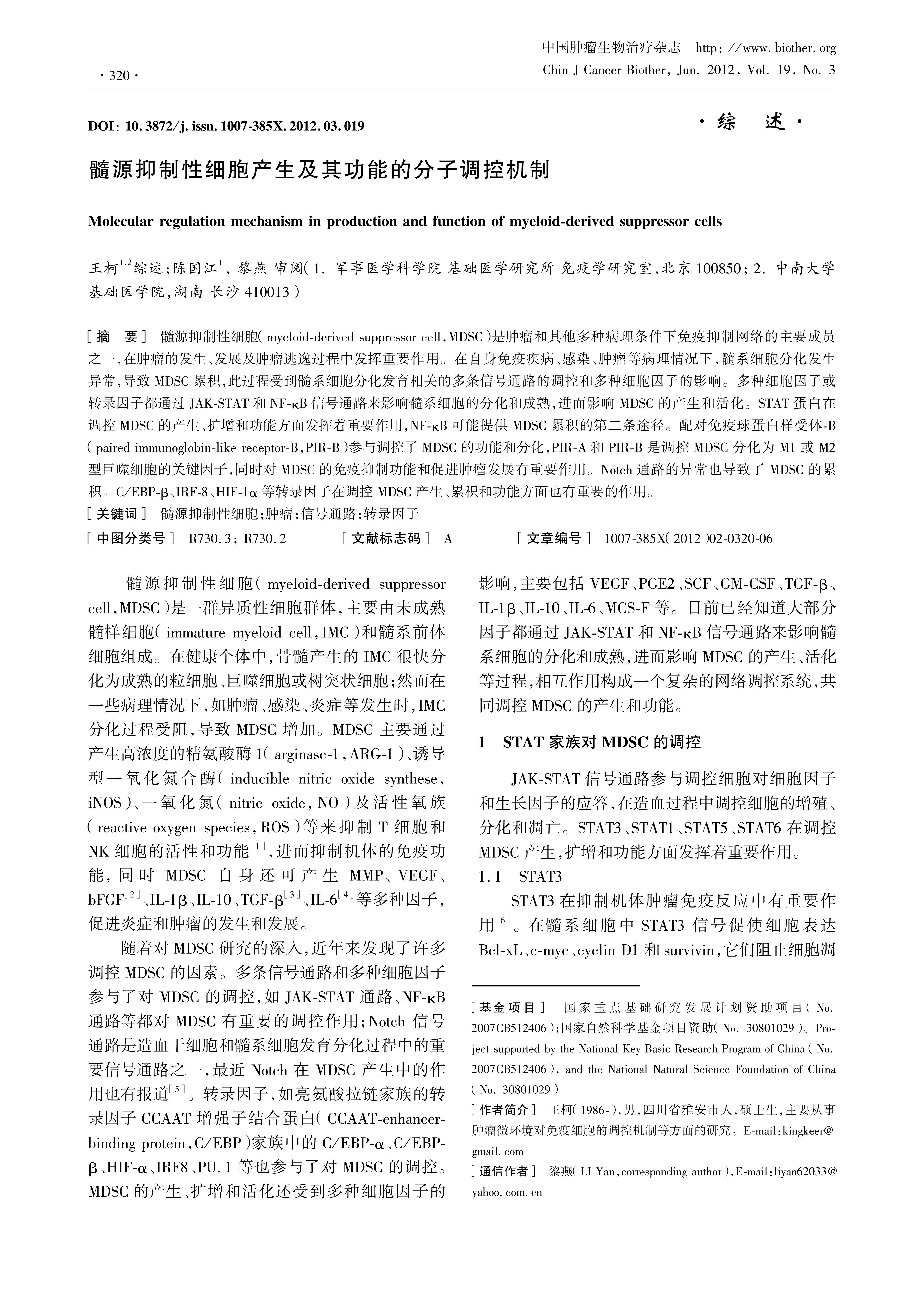 [摘 要] 髓源抑制性细胞(myeloid-derived suppressor cell,MDSC)是肿瘤和其他多种病理条件下免疫抑制网络的主要成员之一,在肿瘤的发生、发展及肿瘤逃逸过程中发挥重要作用。在自身免疫疾病、感染、肿瘤等病理情况下,髓系细胞分化发生异常,导致MDSC累积,此过程受到髓系细胞分化发育相关的多条信号通路的调控和多种细胞因子的影响。多种细胞因子或转录因子都通过JAK-STAT和NF-κB信号通路来影响髓系细胞的分化和成熟,进而影响MDSC的产生和活化。STAT蛋白在调控MDSC的产生、扩增和功能方面发挥着重要作用,NF-κB可能提供MDSC累积的第二条途径。配对免疫球蛋白样受体-B(paired immunoglobin-like receptor-B,PIR-B)参与调控了MDSC的功能和分化,PIR-A和PIR-B是调控MDSC分化为M1或M2型巨噬细胞的关键因子,同时对MDSC的免疫抑制功能和促进肿瘤发展有重要作用。Notch通路的异常也导致了MDSC的累积。C/EBP-β、IRF-8、HIF-1α等转录因子在调控MDSC产生、累积和功能方面也有重要的作用。