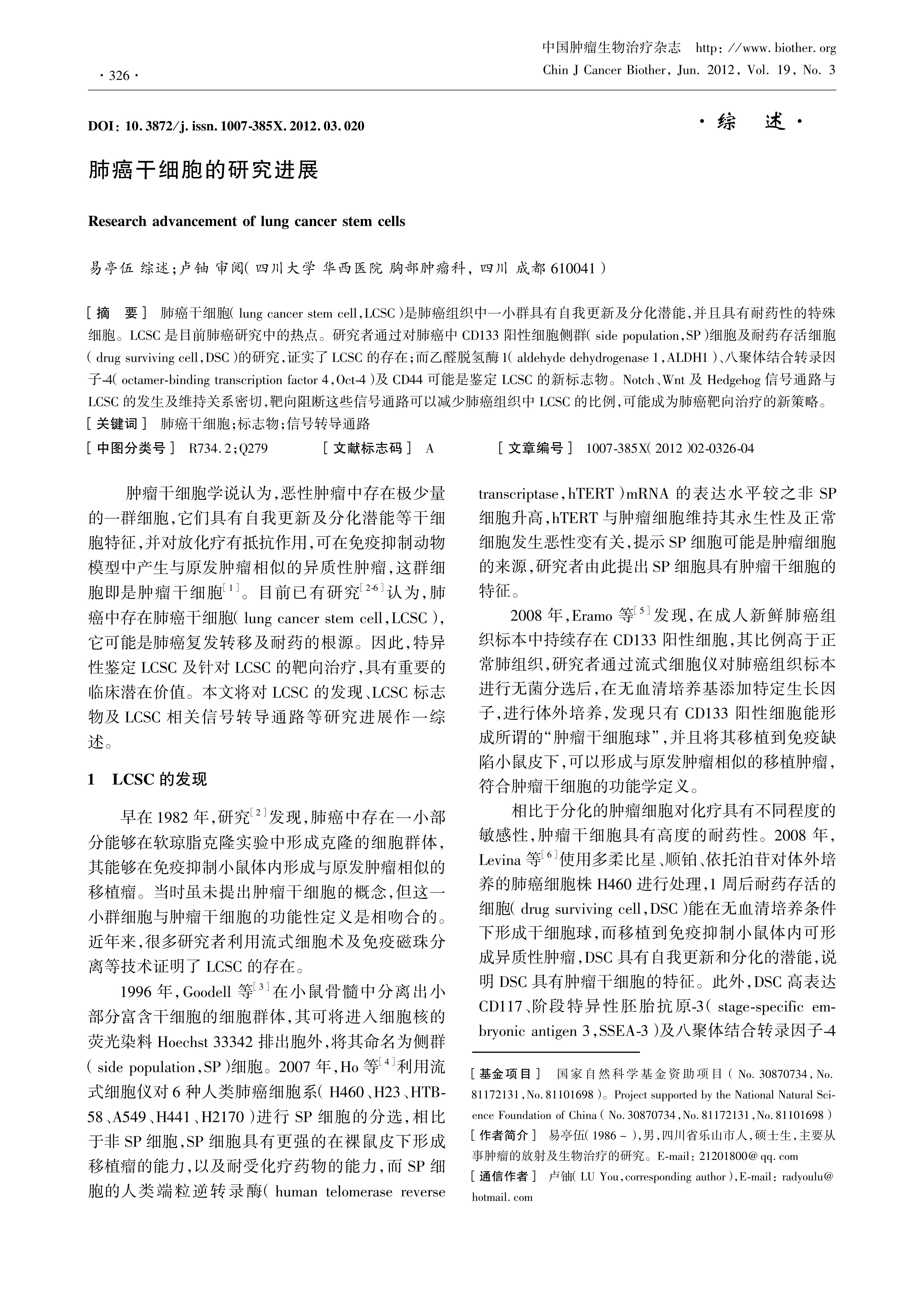 [摘 要] 肺癌干细胞(lung cancer stem cell,LCSC)是肺癌组织中一小群具有自我更新及分化潜能,并且具有耐药性的特殊细胞。LCSC是目前肺癌研究中的热点。研究者通过对肺癌中CD133阳性细胞侧群(side population,SP)细胞及耐药存活细胞(drug surviving cell,DSC)的研究,证实了LCSC的存在;而乙醛脱氢酶1(aldehyde dehydrogenase 1,ALDH1)、八聚体结合转录因子-4(octamer-binding transcription factor 4,Oct-4)及CD44可能是鉴定LCSC的新标志物。Notch、Wnt及Hedgehog信号通路与LCSC的发生及维持关系密切,靶向阻断这些信号通路可以减少肺癌组织中LCSC的比例,可能成为肺癌靶向治疗的新策略