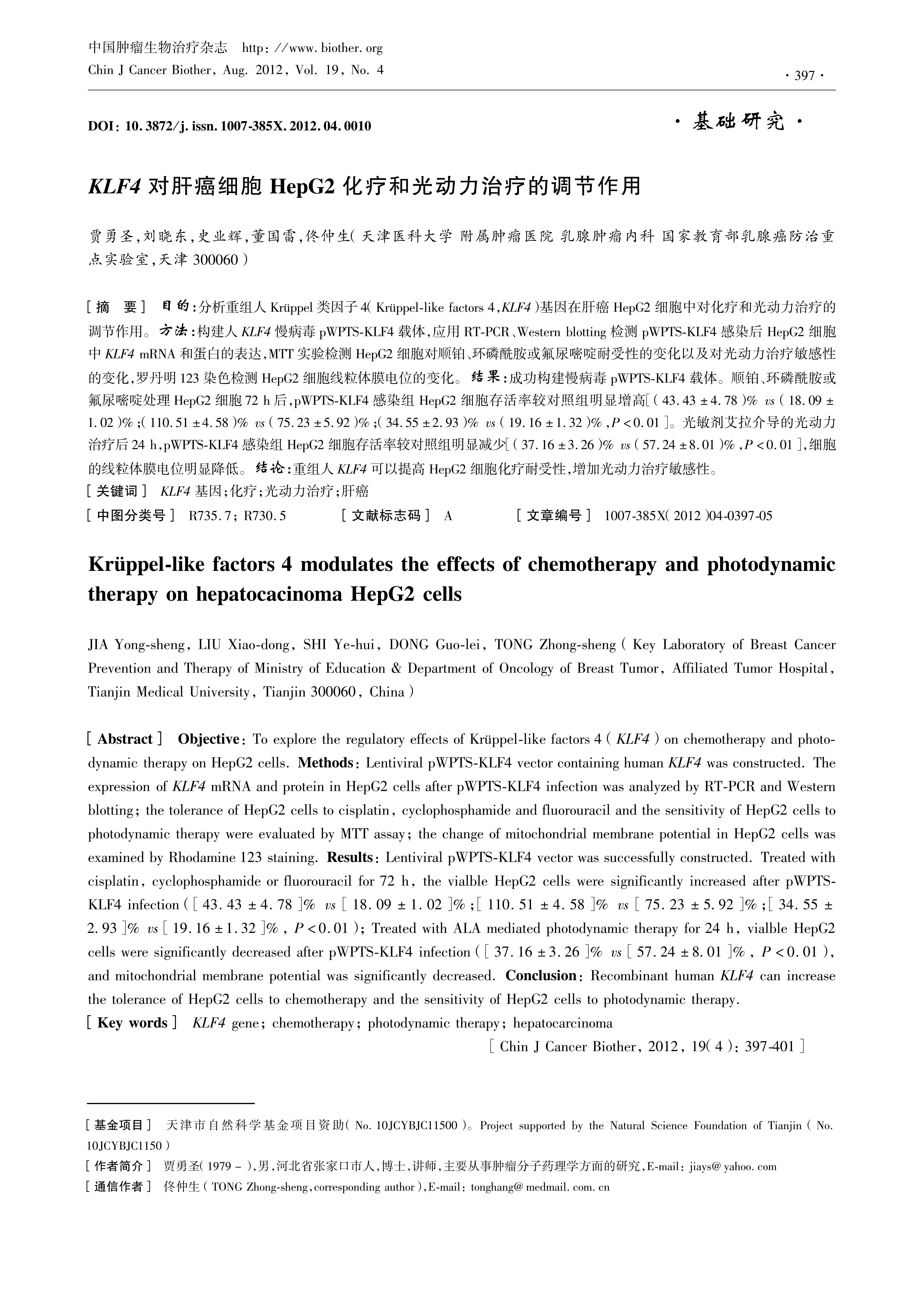 Objective To explore the regulatory effects of Krüppel-like factors 4 (KLF4) on chemotherapy and photodynamic therapy on HepG2 cells. Methods: Lentiviral pWPTS-KLF4 vector containing human KLF4 was constructed. The expression of KLF4 mRNA and protein in HepG2 cells after pWPTS-KLF4 infection was analyzed by RT-PCR and Western blotting; the tolerance of HepG2 cells to cisplatin, cyclophosphamide and fluorouracil and the sensitivity of HepG2 cells to photodynamic therapy were evaluated by MTT assay; the change of mitochondrial membrane potential in HepG2 cells was examined by Rhodamine 123 staining. Results: Lentiviral pWPTS-KLF4 vector was successfully constructed. Treated with cisplatin, cyclophosphamide or fluorouracil for 72 h, the vialble HepG2 cells were significantly increased after pWPTS-KLF4 infection (\[43.43±4.78\]% vs \[18.09±1.02\]%;\[110.51±4.58\]% vs \[75.23±592\]%;\[34.55±293\]% vs \[19.16±1.32\]%, P<0.01); Treated with ALA mediated photodynamic therapy for 24 h, vialble HepG2 cells were significantly decreased after pWPTS-KLF4 infection (\[37.16±3.26\]% vs \[57.24±801\]%, P<0.01), and mitochondrial membrane potential was significantly decreased. Conclusion: Recombinant human KLF4 can increase the tolerance of HepG2 cells to chemotherapy and the sensitivity of HepG2 cells to photodynamic therapy.