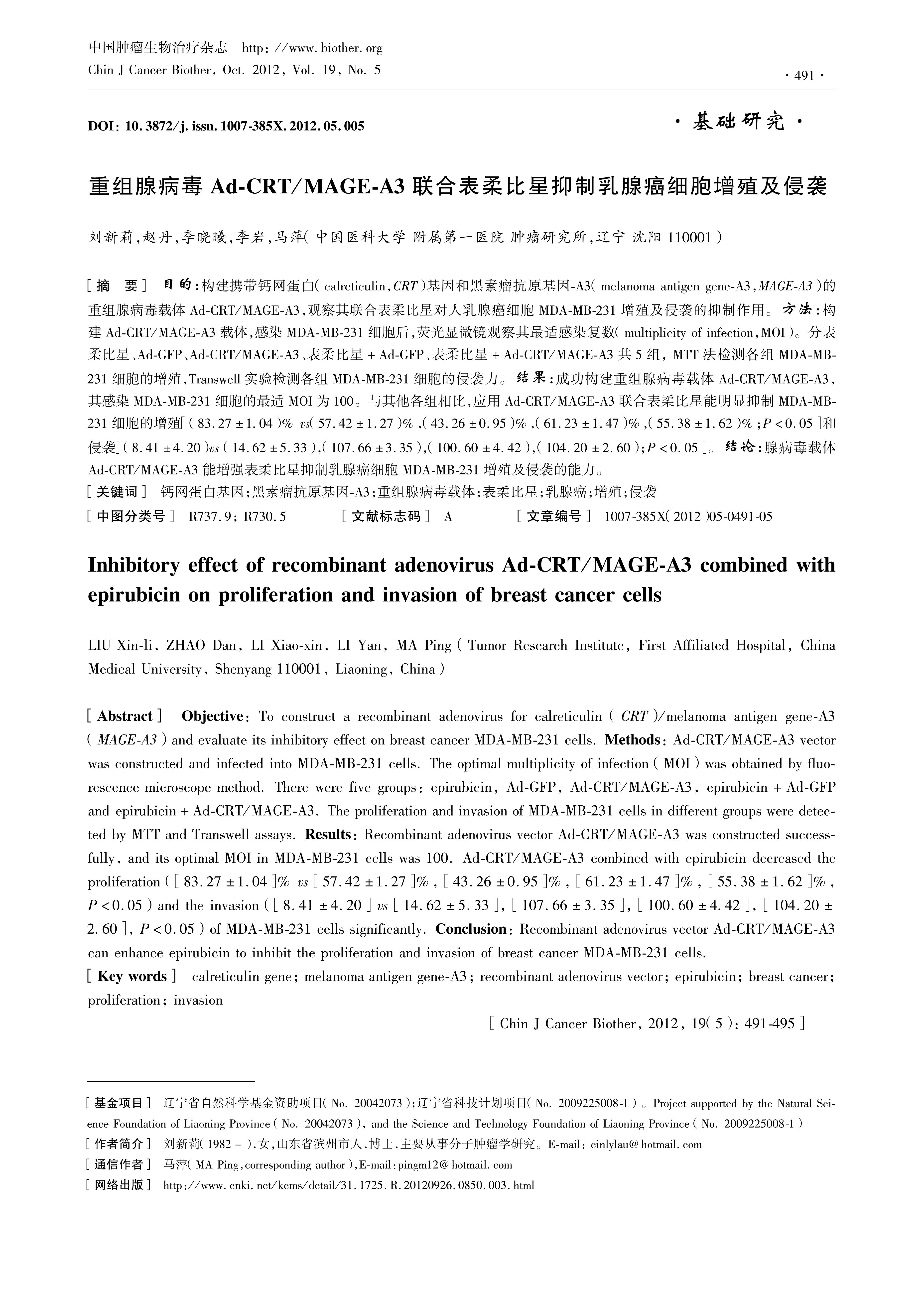 目的:构建携带钙网蛋白(calreticulin,CRT)基因和黑素瘤抗原基因-A3(melanoma antigen gene-A3, MAGE-A3)的重组腺病毒载体Ad-CRT/MAGE-A3,观察其联合表柔比星对人乳腺癌细胞MDA-MB-231增殖及侵袭的抑制作用。 方法: 构建Ad-CRT/MAGE-A3载体,感染MDA-MB-231细胞后,荧光显微镜观察其最适感染复数(multiplicity of infection,MOI)。分表柔比星、Ad-GFP、Ad-CRT/MAGE-A3、表柔比星+Ad-GFP、表柔比星+Ad-CRT/MAGE-A3共5组, MTT法检测各组MDA-MB-231细胞的增殖,Transwell实验检测各组MDA-MB-231细胞的侵袭力。 结果: 成功构建重组腺病毒载体Ad-CRT/MAGE-A3,其感染MDA-MB-231细胞的最适MOI为100。与其他各组相比,应用Ad-CRT/MAGE-A3联合表柔比星能明显抑制MDA-MB-231细胞的增殖\[(83.27±104)% vs(57.42±1.27)%,(43.26±0.95)%,(61.23±1.47)%,(55.38±1.62)%;P<0.05\]和侵袭\[(8.41±4.20)vs (14.62±5.33),(107.66±3.35),(100.60±4.42),(104.20±2.60);P<0.05\]。 结论: 腺病毒载体Ad-CRT/MAGE-A3能增强表柔比星抑制乳腺癌细胞MDA-MB-231增殖及侵袭的能力。