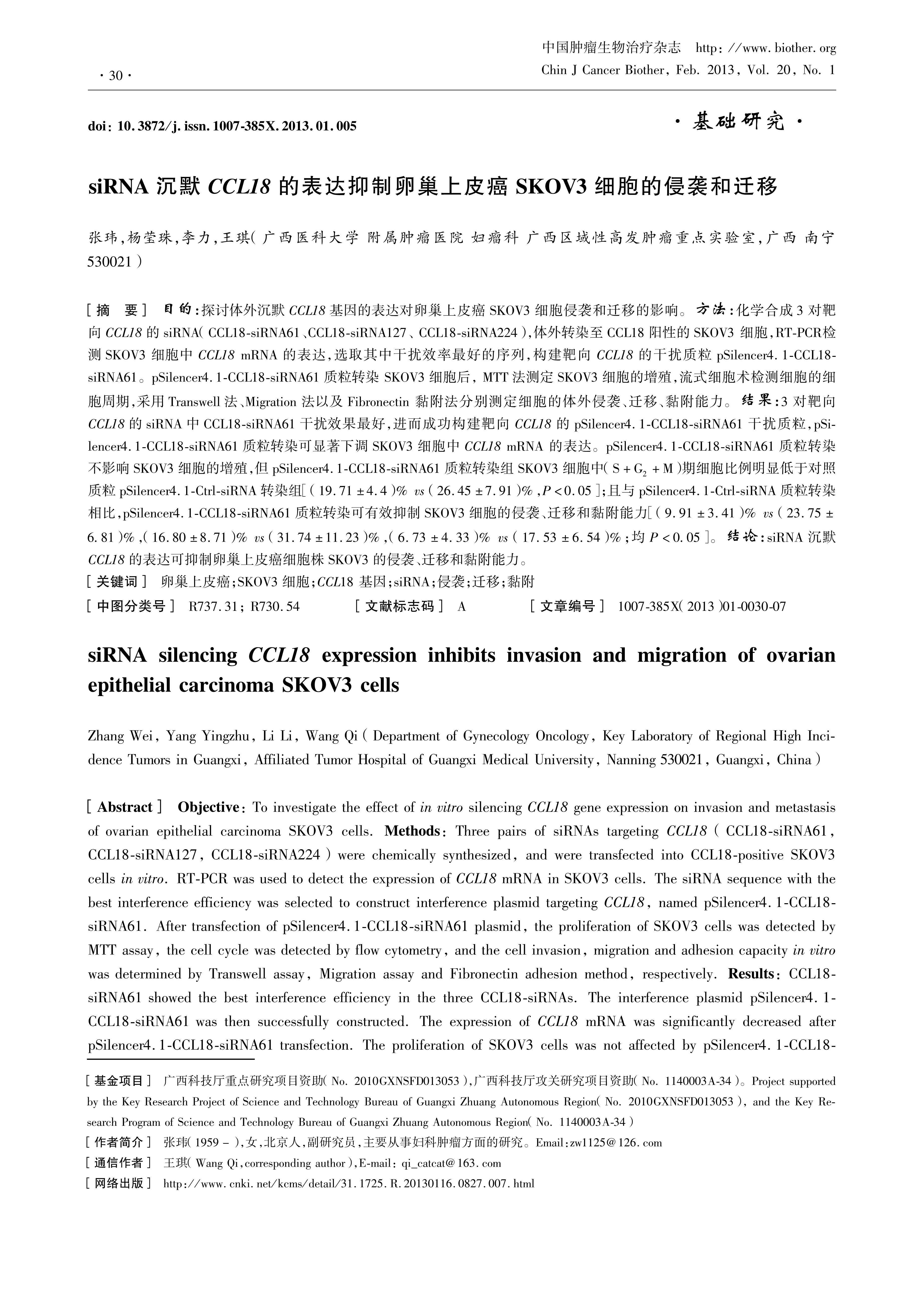 Objective:To investigate the effect of in vitro silencing CCL18 gene expression on invasion and metastasis of ovarian epithelial carcinoma SKOV3 cells. Methods: Three pairs of siRNAs targeting CCL18 (CCL18-siRNA61, CCL18-siRNA127, CCL18-siRNA224) were chemically synthesized, and were transfected into CCL18-positive SKOV3 cells in vitro. RT-PCR was used to detect the expression of CCL18 mRNA in SKOV3 cells. The siRNA sequence with the best interference efficiency was selected to construct interference plasmid targeting CCL18 , named pSilencer4.1-CCL18-siRNA61. After transfection of pSilencer4.1-CCL18-siRNA61 plasmid, the proliferation of SKOV3 cells was detected by MTT assay, the cell cycle was detected by flow cytometry, and the cell invasion, migration and adhesion capacity in vitro was determined by Transwell assay, Migration assay and Fibronectin adhesion method, respectively. Results: CCL18-siRNA61 showed the best interference efficiency in the three CCL18-siRNAs. The interference plasmid pSilencer4.1-CCL18-siRNA61 was then successfully constructed. The expression of CCL18 mRNA was significantly decreased after pSilencer4.1-CCL18-siRNA61 transfection. The proliferation of SKOV3 cells was not affected by pSilencer4.1-CCL18-siRNA61 transfection. However, the proportion of SKOV3 cells in phase (S+G2+M) in the pSilencer4.1-CCL18-siRNA61 transfection group was significantly lower than that in the pSilencer4.1-Ctrl-siRNA transfection group (\[1971±44\]% vs \[26.45±7.91\]%, P<0.05). The invasion, migration and adhesion capacity of SKOV3 cells was effectively inhibited in the pSilencer4.1-CCL18-siRNA61 transfection group compared with that in the pSilencer4.1-Ctrl-siRNA transfection group (\[9.91±3.41\]% vs \[23.75±6.81\]%, \[16.80±8.71\]% vs \[31.74±11.23\]%, \[6.73±4.33\]% vs \[17.53±6.54\]%, P<0.05), respectively. Conclusion: siRNA silencing CCL18 expression can inhibit the invasion, adhesion and migration capacity of ovarian epithelial cancer cell line SKOV3.
