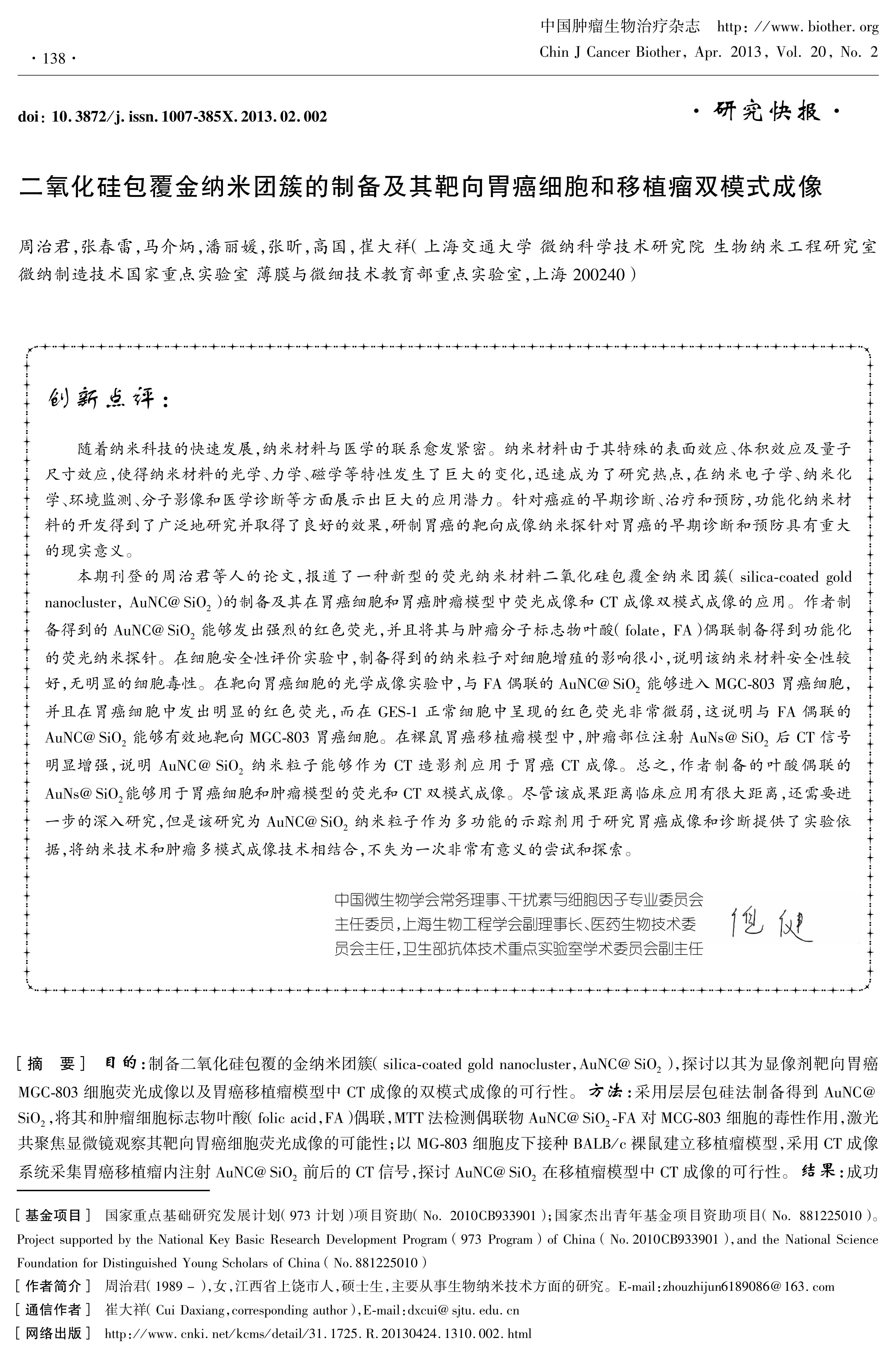 目的: 制备二氧化硅包覆的金纳米团簇(silica-coated gold nanocluster,AuNC@SiO2),探讨以其为显像剂靶向胃癌MGC-803细胞荧光成像以及胃癌移植瘤模型中CT成像的双模式成像的可行性。 方法: 采用层层包硅法制备得到AuNC@SiO2,将其和肿瘤细胞标志物叶酸(folic acid,FA)偶联,MTT法检测偶联物AuNC@SiO2-FA对MCG-803细胞的毒性作用,激光共聚焦显微镜观察其靶向胃癌细胞荧光成像的可能性;以MG-803细胞皮下接种BALB/c裸鼠建立移植瘤模型,采用CT成像系统采集胃癌移植瘤内注射AuNC@SiO2前后的CT信号,探讨AuNC@SiO2在移植瘤模型中CT成像的可行性。 结果: 成功制备了形貌均一、分散性良好、具有良好荧光光学特性的AuNC@SiO2,AuNC@SiO2和AuNC@SiO2-FA在500 mg/ml时对胃癌MGC-803细胞和正常胃黏膜GES-1细胞的毒性均较低。在细胞学实验中,AuNC@SiO2-FA能够有效地靶向胃癌MGC-803细胞而非正常GES-1细胞,从而清晰地荧光成像;在裸鼠胃癌移植瘤模型中,肿瘤部位注射AuNC@SiO2后CT信号明显增强,HU值由注射前的129.16上升到383.32。 结论: AuNC@SiO2能够用于荧光和CT双模式成像,AuNC@SiO2-FA能靶向胃癌细胞荧光成像。