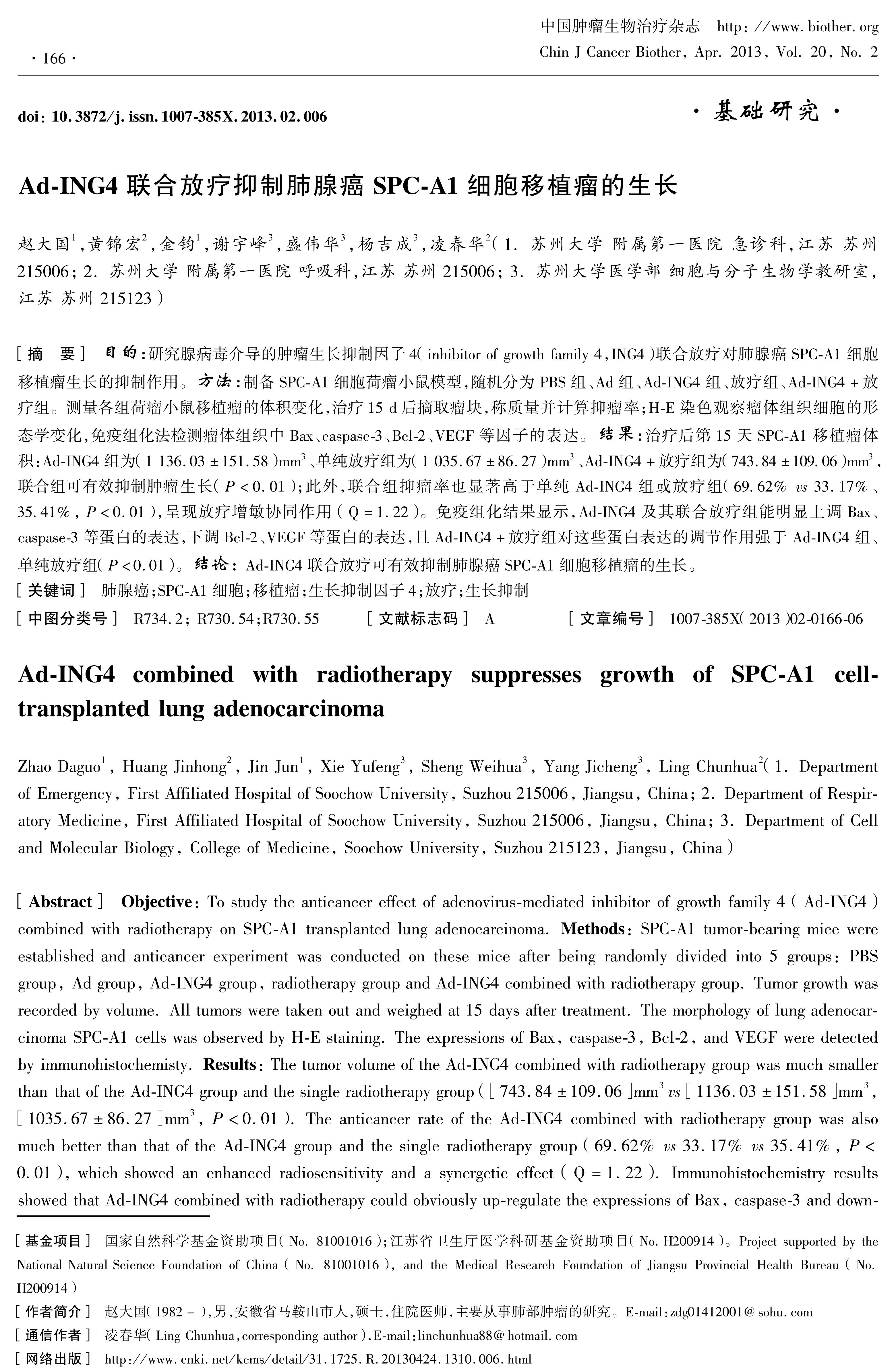 目的: 研究腺病毒介导的肿瘤生长抑制因子4(inhibitor of growth family 4,ING4)联合放疗对肺腺癌SPC-A1细胞移植瘤生长的抑制作用。 方法: 制备SPC-A1细胞荷瘤小鼠模型,随机分为PBS组、Ad组、Ad-ING4组、放疗组、Ad-ING4+放疗组。测量各组荷瘤小鼠移植瘤的体积变化,治疗15 d后摘取瘤块,称质量并计算抑瘤率;H-E染色观察瘤体组织细胞的形态学变化,免疫组化法检测瘤体组织中Bax、caspase-3、Bcl-2、VEGF等因子的表达。 结果: 治疗后第15天SPC-A1移植瘤体积:Ad-ING4组为(1 136.03±151.58)mm3、单纯放疗组为(1 035.67±86.27)mm3、Ad-ING4+放疗组为 (743.84±10906)mm3 ,联合组可有效抑制肿瘤生长(P<0.01);此外,联合组抑瘤率也显著高于单纯Ad-ING4组或放疗组(6962% vs 33.17%、3541%, P<0.01),呈现放疗增敏协同作用 (Q=1.22)。免疫组化结果显示,Ad-ING4及其联合放疗组能明显上调Bax、caspase-3等蛋白的表达,下调Bcl-2、VEGF等蛋白的表达,且Ad-ING4+放疗组对这些蛋白表达的调节作用强于Ad-ING4组、单纯放疗组(P<0.01)。 结论: Ad-ING4联合放疗可有效抑制肺腺癌SPC-A1细胞移植瘤的生长。