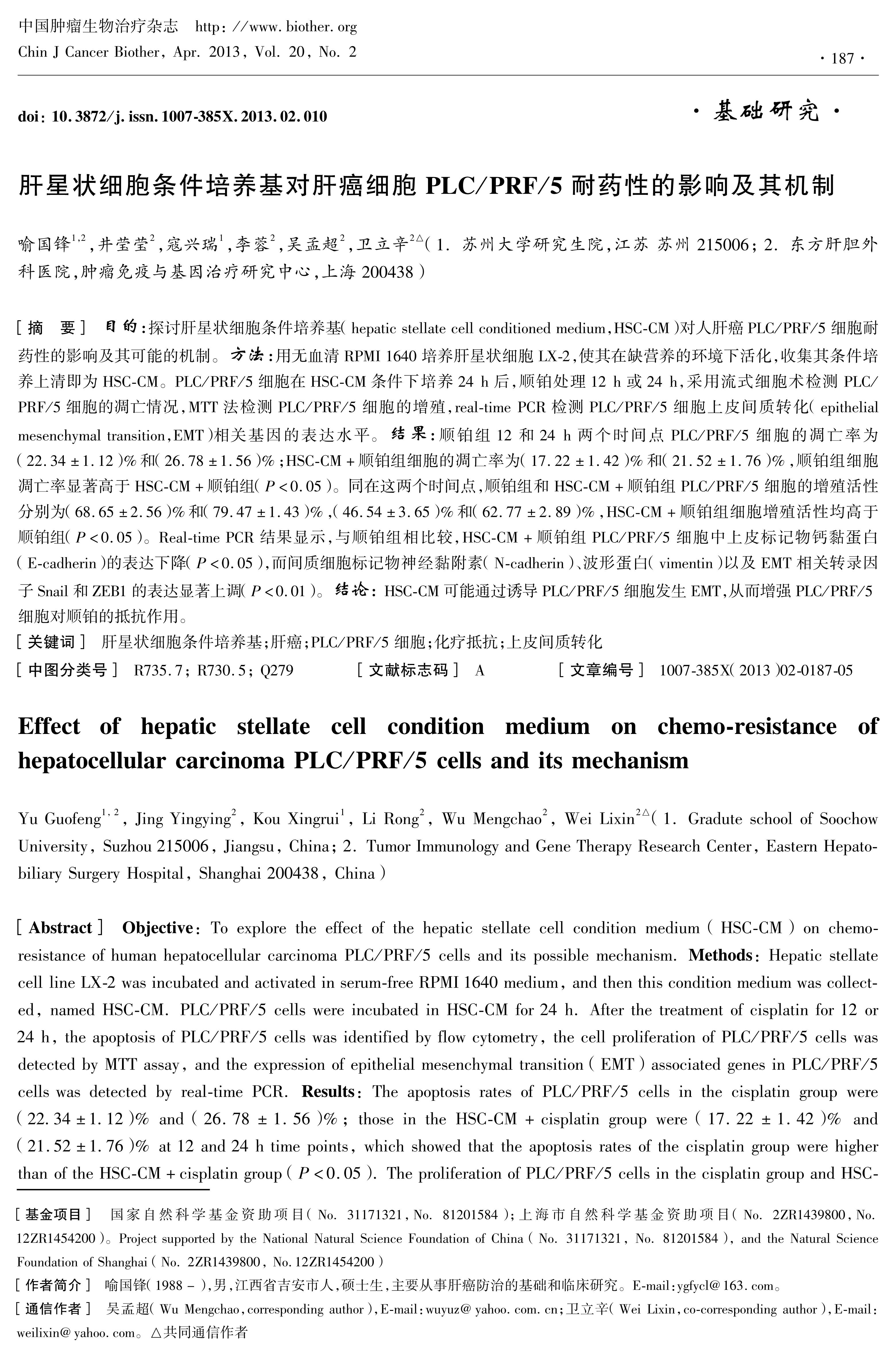 目的:探讨肝星状细胞条件培养基(hepatic stellate cell conditioned medium,HSC-CM)对人肝癌PLC/PRF/5细胞耐药性的影响及其可能的机制。 方法: 用无血清RPMI 1640培养肝星状细胞LX-2,使其在缺营养的环境下活化,收集其条件培养上清即为HSC-CM。PLC/PRF/5细胞在HSC-CM条件下培养24 h后,顺铂处理12 h或24 h,采用流式细胞术检测PLC/PRF/5细胞的凋亡情况,MTT法检测PLC/PRF/5细胞的增殖,real-time PCR检测PLC/PRF/5细胞上皮间质转化(epithelial mesenchymal transition,EMT)相关基因的表达水平。 结果: 顺铂组12和24 h两个时间点PLC/PRF/5细胞的凋亡率为(22.34±1.12)%和(26.78±1.56)%;HSC-CM+顺铂组细胞的凋亡率为(17.22±1.42)%和(21.52±1.76)%,顺铂组细胞凋亡率显著高于HSC-CM+顺铂组(P<0.05)。同在这两个时间点,顺铂组和HSC-CM+顺铂组PLC/PRF/5细胞的增殖活性分别为(68.65±2.56)%和(79.47±1.43)%,(46.54±3.65)%和(62.77±2.89)%,HSC-CM+顺铂组细胞增殖活性均高于顺铂组(P<0.05)。Real-time PCR 结果显示,与顺铂组相比较,HSC-CM+顺铂组PLC/PRF/5细胞中上皮标记物钙黏蛋白(E-cadherin)的表达下降(P<0.05),而间质细胞标记物神经黏附素(N-cadherin)、波形蛋白(vimentin)以及EMT相关转录因 子Snail和ZEB1的表达显著上调(P<0.01)。 结论: HSC-CM可能通过诱导PLC/PRF/5细胞发生EMT,从而增强PLC/PRF/5 细胞对顺铂的抵抗作用。