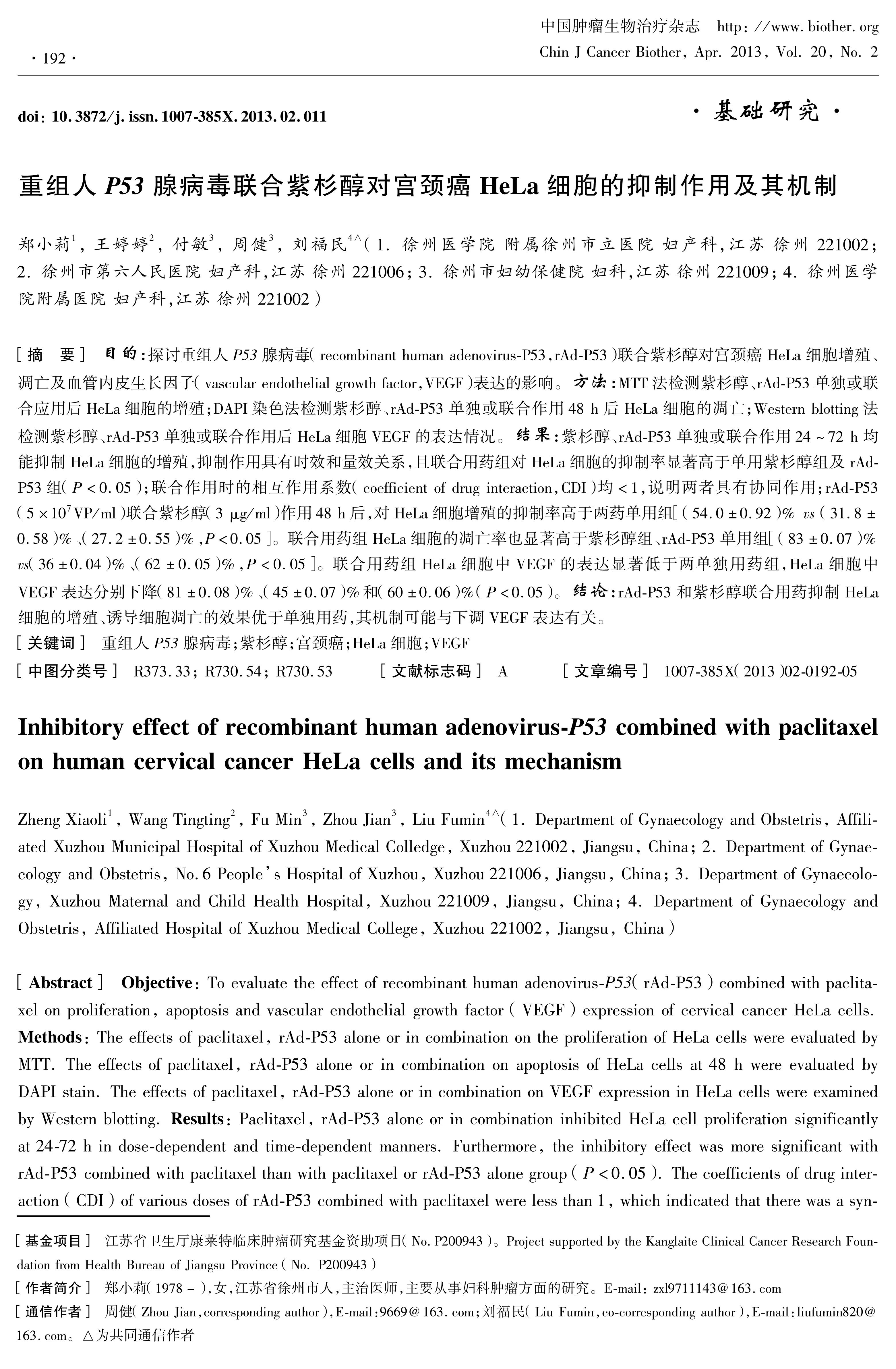 目的: 探讨重组人 P53 腺病毒(recombinant human adenovirus-P53,rAd-P53)联合紫杉醇对宫颈癌HeLa细胞增殖、凋亡及血管内皮生长因子(vascular endothelial growth factor,VEGF)表达的影响。 方法: MTT法检测紫杉醇、rAd-P53单独或联合应用后HeLa细胞的增殖;DAPI染色法检测紫杉醇、rAd-P53单独或联合作用48 h后HeLa细胞的凋亡;Western blotting法检测紫杉醇、rAd-P53单独或联合作用后HeLa细胞VEGF的表达情况。 结果: 紫杉醇、rAd-P53单独或联合作用24~72 h均能抑制HeLa细胞的增殖,抑制作用具有时效和量效关系,且联合用药组对HeLa细胞的抑制率显著高于单用紫杉醇组及rAd-P53组(P<0.05);联合作用时的相互作用系数(coefficient of drug interaction,CDI)均<1,说明两者具有协同作用;rAd-P53(5×107VP/ml)联合紫杉醇(3 μg/ml)作用48 h后,对HeLa细胞增殖的抑制率高于两药单用组\[(54.0±0.92)% vs (31.8±0.58)%、(27.2±0.55)%,P<0.05\]。联合用药组HeLa细胞的凋亡率也显著高于紫杉醇组、rAd-P53单用组\[(83±0.07)% vs(36±0.04)%、(62±0.05)%,P<0.05\]。联合用药组HeLa细胞中VEGF的表达显著低于两单独用药组,HeLa细胞中VEGF表达分别下降(81±0.08)%、(45±0.07)%和(60±0.06)%(P<0.05)。 结论: rAd-P53和紫杉醇联合用药抑制HeLa细胞的增殖、诱导细胞凋亡的效果优于单独用药,其机制可能与下调VEGF表达有关。