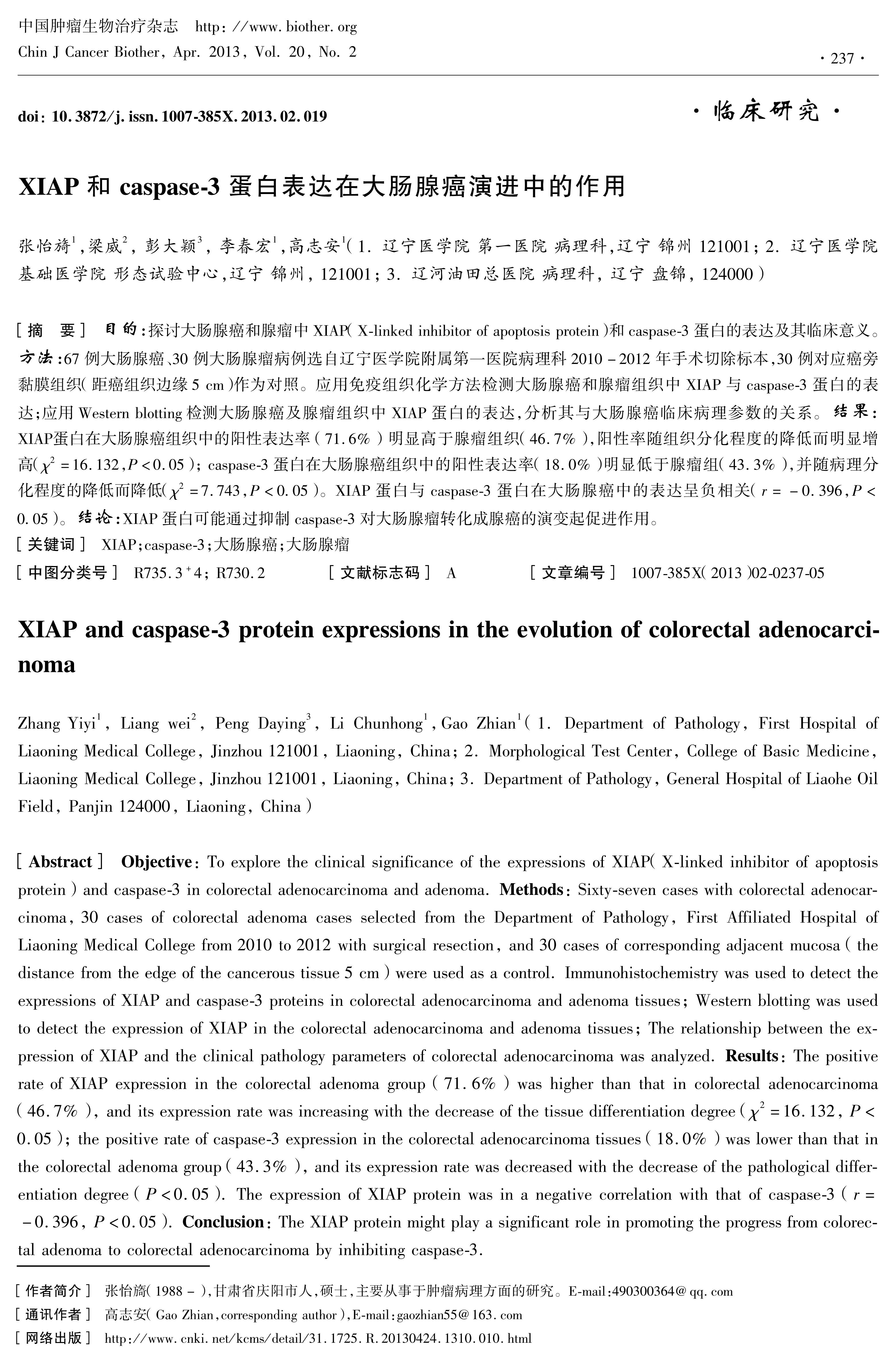 Objective: To explore the clinical significance of the expressions of XIAP(X-linked inhibitor of apoptosis protein) and caspase-3 in colorectal adenocarcinoma and adenoma. Methods: Sixty-seven cases with colorectal adenocarcinoma, 30 cases of colorectal adenoma cases selected from the Department of Pathology, First Affiliated Hospital of Liaoning Medical College from 2010 to 2012 with surgical resection, and 30 cases of corresponding adjacent mucosa (the distance from the edge of the cancerous tissue 5 cm) were used as a control. Immunohistochemistry was used to detect the expressions of XIAP and caspase-3 proteins in colorectal adenocarcinoma and adenoma tissues; Western blotting was used to detect the expression of XIAP in the colorectal adenocarcinoma and adenoma tissues; The relationship between the expression of XIAP and the clinical pathology parameters of colorectal adenocarcinoma was analyzed. Results: The positive rate of XIAP expression in the colorectal adenoma group (71.6%) was higher than that in colorectal adenocarcinoma (46.7%), and its expression rate was increasing with the decrease of the tissue differentiation degree (χ2=16.132, P<0.05); the positive rate of caspase-3 expression in the colorectal adenocarcinoma tissues (18.0%) was lower than that in the colorectal adenoma group (43.3%), and its expression rate was decreased with the decrease of the pathological differentiation degree (P<0.05). The expression of XIAP protein was in a negative correlation with that of caspase-3 (r=-0.396, P<0.05). Conclusion: The XIAP protein might play a significant role in promoting the progress from colorectal adenoma to colorectal adenocarcinoma by inhibiting caspase-3.