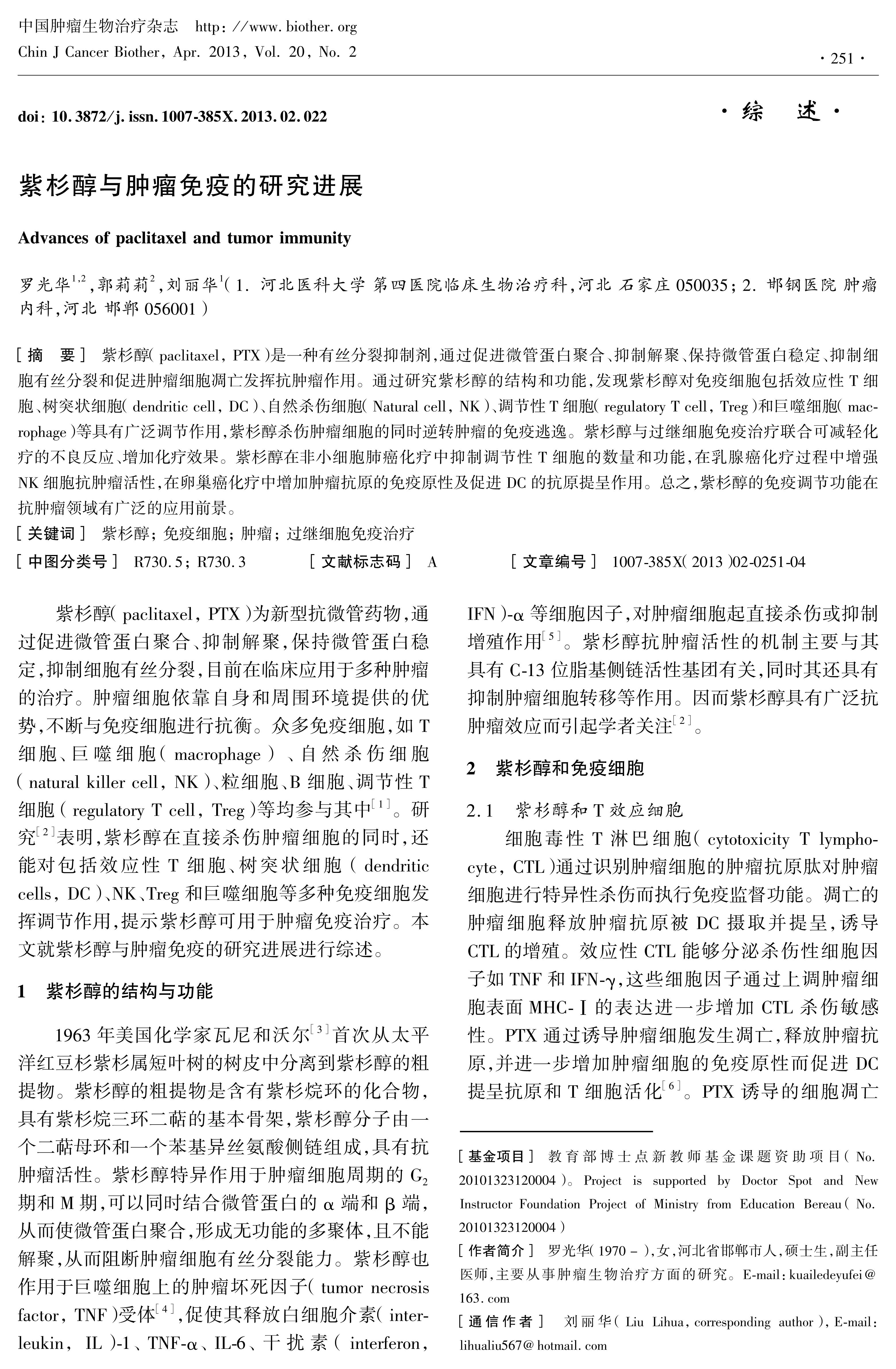 紫杉醇(paclitaxel, PTX)是一种有丝分裂抑制剂,通过促进微管蛋白聚合、抑制解聚、保持微管蛋白稳定、抑制细胞有丝分裂和促进肿瘤细胞凋亡发挥抗肿瘤作用。通过研究紫杉醇的结构和功能,发现紫杉醇对免疫细胞包括效应性T细胞、树突状细胞(dendritic cell, DC)、自然杀伤细胞(Natural cell, NK)、调节性T细胞(regulatory T cell, Treg)和巨噬细胞(macrophage)等具有广泛调节作用,紫杉醇杀伤肿瘤细胞的同时逆转肿瘤的免疫逃逸。紫杉醇与过继细胞免疫治疗联合可减轻化疗的不良反应、增加化疗效果。紫杉醇在非小细胞肺癌化疗中抑制调节性T细胞的数量和功能,在乳腺癌化疗过程中增强NK细胞抗肿瘤活性,在卵巢癌化疗中增加肿瘤抗原的免疫原性及促进DC的抗原提呈作用。总之,紫杉醇的免疫调节功能在抗肿瘤领域有广泛的应用前景。