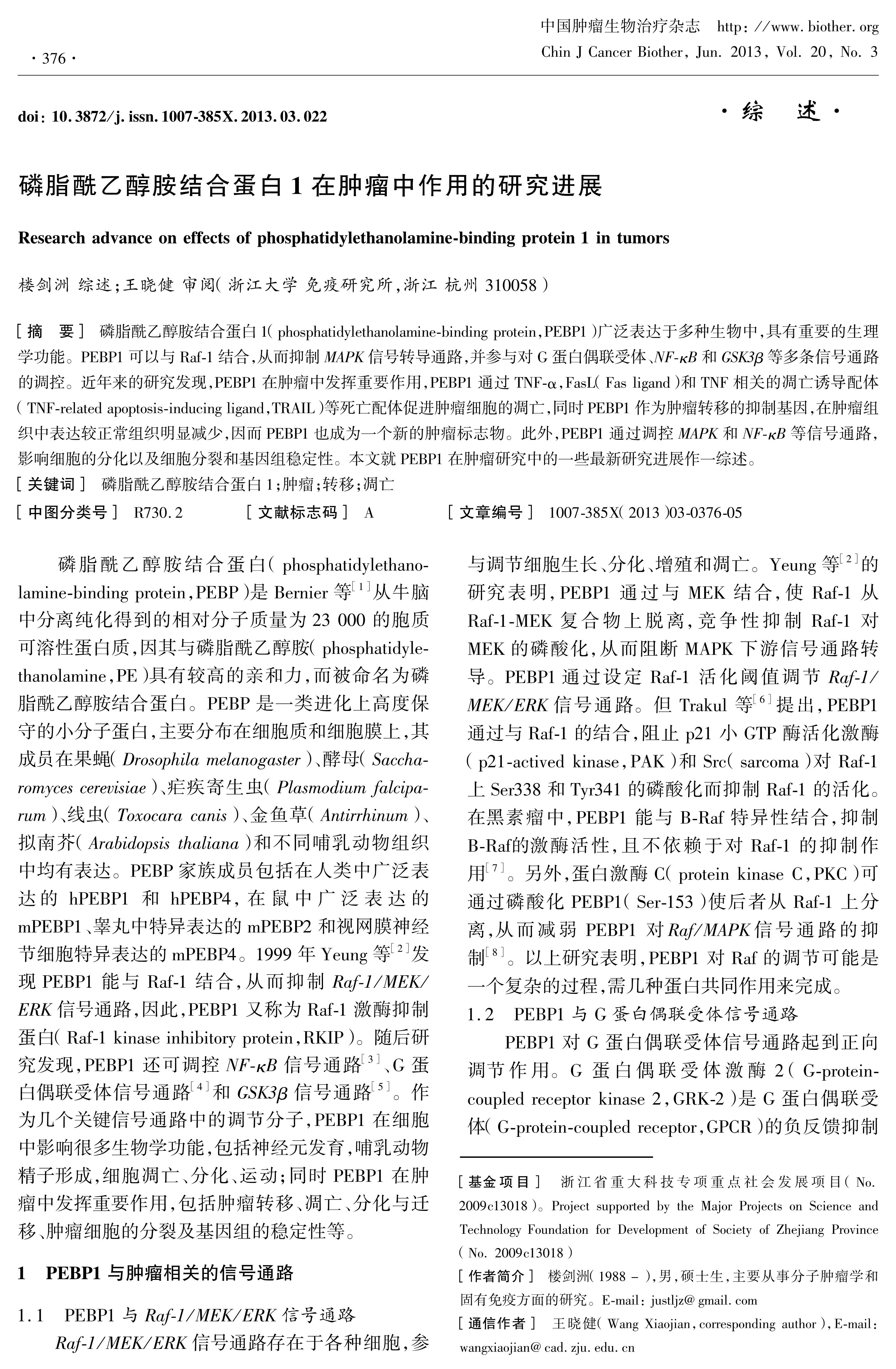 磷脂酰乙醇胺结合蛋白1(phosphatidylethanolamine-binding protein,PEBP1)广泛表达于多种生物中,具有重要的生理学功能。PEBP1可以与Raf-1结合,从而抑制MAPK信号转导通路,并参与对G蛋白偶联受体、 NF-κB和GSK3β 等多条信号通路的调控。近年来的研究发现,PEBP1在肿瘤中发挥重要作用,PEBP1通过TNF-α,FasL(Fas ligand)和TNF相关的凋亡诱导配体(TNF-related apoptosis-inducing ligand,TRAIL)等死亡配体促进肿瘤细胞的凋亡,同时PEBP1作为肿瘤转移的抑制基因,在肿瘤组织中表达较正常组织明显减少,因而PEBP1也成为一个新的肿瘤标志物。此外,PEBP1通过调控 MAPK和NF-κB 等信号通路,影响细胞的分化以及细胞分裂和基因组稳定性。本文就PEBP1在肿瘤研究中的一些最新研究进展作一综述。