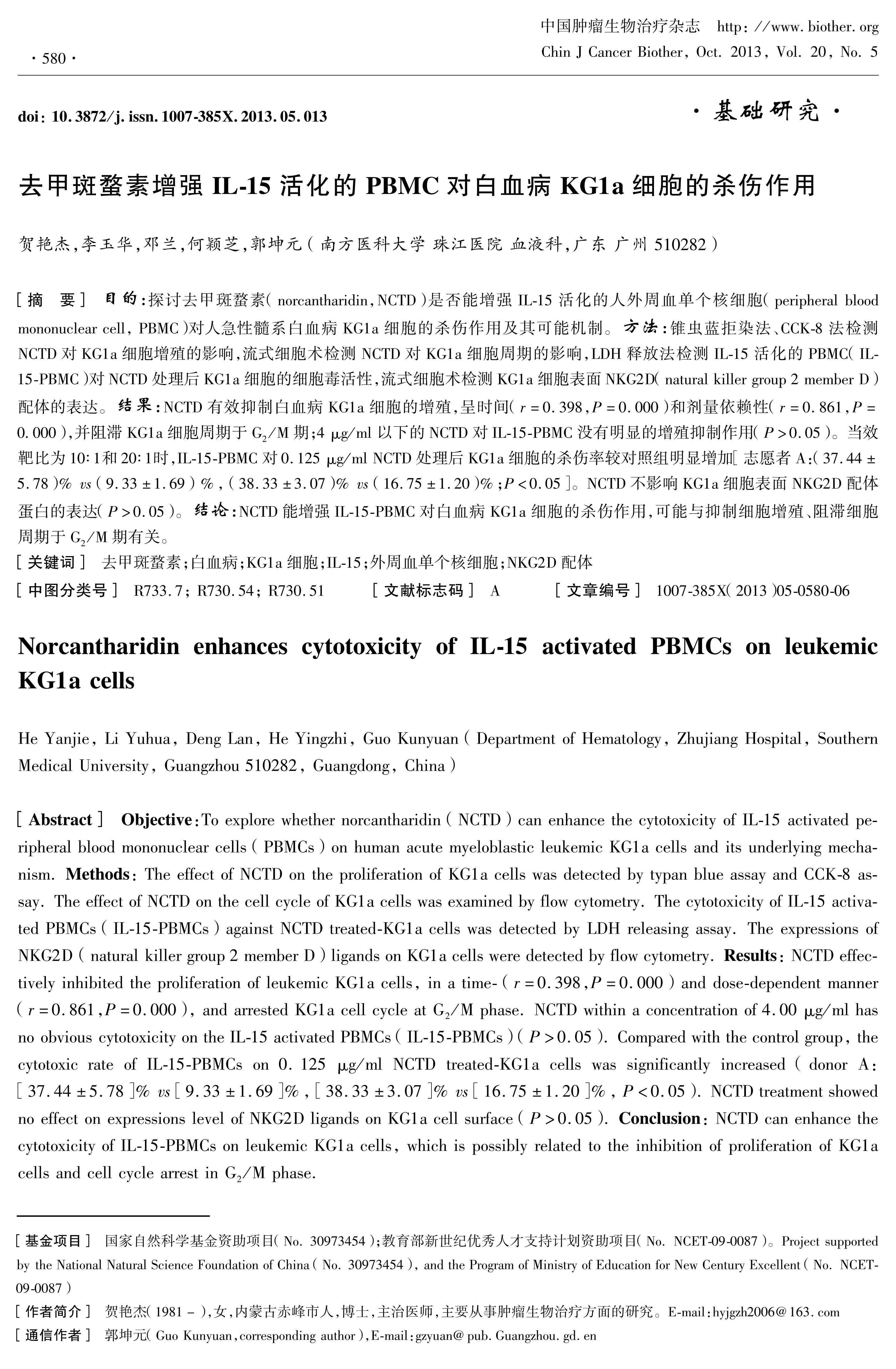 目的:探讨去甲斑蝥素(norcantharidin,NCTD)是否能增强IL-15活化的人外周血单个核细胞(peripheral blood mononuclear cell, PBMC)对人急性髓系白血病KG1a细胞的杀伤作用及其可能机制。方法:锥虫蓝拒染法、CCK-8法检测NCTD对KG1a细胞增殖的影响,流式细胞术检测NCTD对KG1a细胞周期的影响,LDH释放法检测IL-15活化的PBMC(IL-15-PBMC)对NCTD处理后KG1a细胞的细胞毒活性,流式细胞术检测KG1a细胞表面NKG2D(natural killer group 2 member D)配体的表达。结果:NCTD有效抑制白血病KG1a细胞的增殖,呈时间(r=0.398,P=0.000)和剂量依赖性(r=0.861,P=0000),并阻滞KG1a细胞周期于G2/M期;4 μg/ml 以下的NCTD对IL-15-PBMC没有明显的增殖抑制作用(P>0.05)。当效靶比为10 ∶1和20 ∶1时,IL-15-PBMC对0.125 μg/ml NCTD处理后KG1a细胞的杀伤率较对照组明显增加\[志愿者A:(37.44±5.78)% vs (9.33±1.69) %, (38.33±3.07)% vs (16.75±1.20)%;P<0.05\]。NCTD不影响KG1a细胞表面NKG2D配体蛋白的表达(P>0.05)。结论:NCTD能增强IL-15-PBMC对白血病KG1a细胞的杀伤作用,可能与抑制细胞增殖、阻滞细胞周期于G2/M期有关。