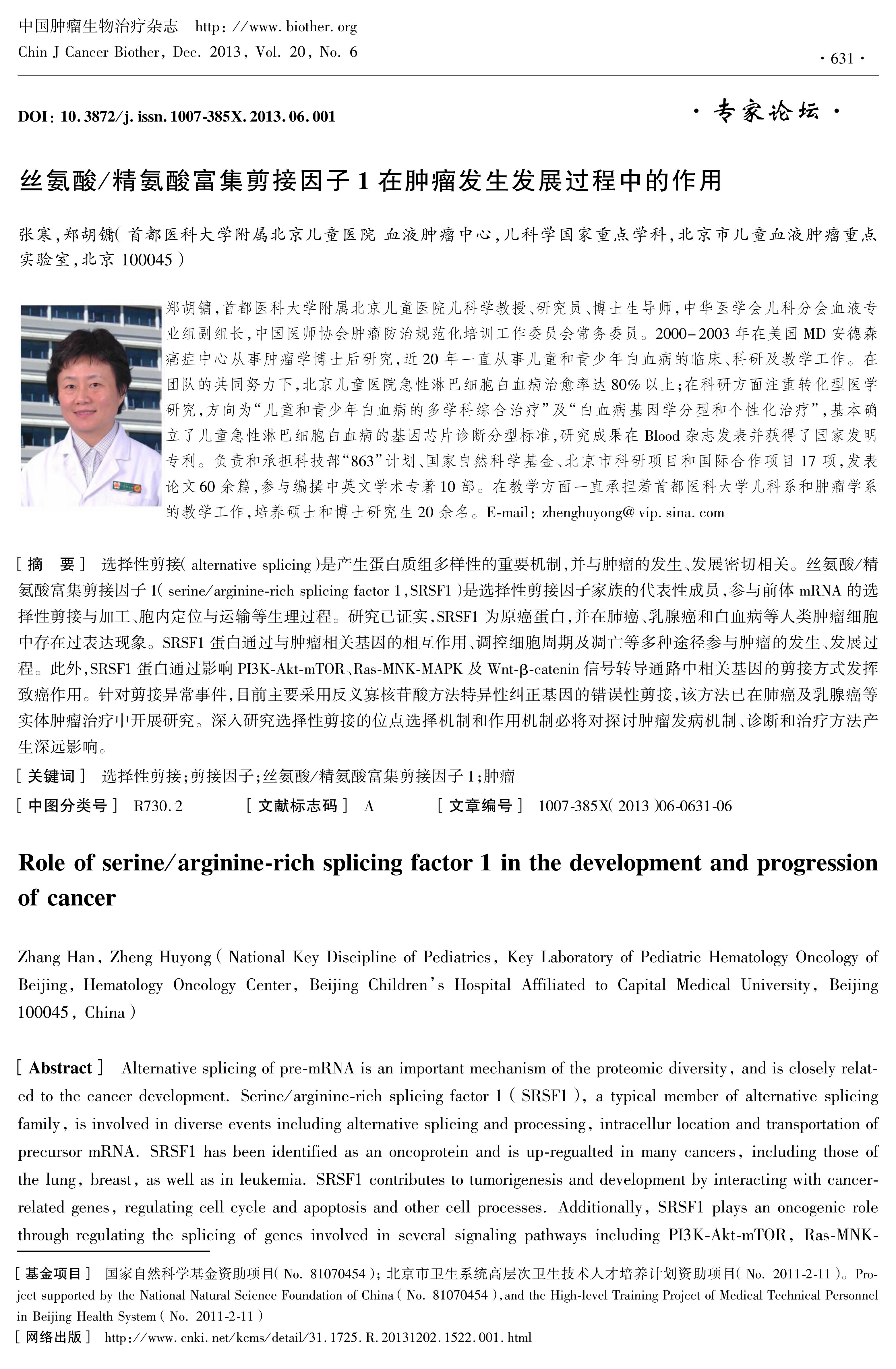 选择性剪接(alternative splicing)是产生蛋白质组多样性的重要机制,并与肿瘤的发生、发展密切相关。丝氨酸/精氨酸富集剪接因子1(serine/arginine-rich splicing factor 1,SRSF1)是选择性剪接因子家族的代表性成员,参与前体mRNA的选择性剪接与加工、胞内定位与运输等生理过程。研究已证实,SRSF1为原癌蛋白,并在肺癌、乳腺癌和白血病等人类肿瘤细胞中存在过表达现象。SRSF1蛋白通过与肿瘤相关基因的相互作用、调控细胞周期及凋亡等多种途径参与肿瘤的发生、发展过程。此外,SRSF1蛋白通过影响PI3K-Akt-mTOR、Ras-MNK-MAPK及Wnt-β-catenin信号转导通路中相关基因的剪接方式发挥致癌作用。针对剪接异常事件,目前主要采用反义寡核苷酸方法特异性纠正基因的错误性剪接,该方法已在肺癌及乳腺癌等实体肿瘤治疗中开展研究。深入研究选择性剪接的位点选择机制和作用机制必将对探讨肿瘤发病机制、诊断和治疗方法产生深远影响。