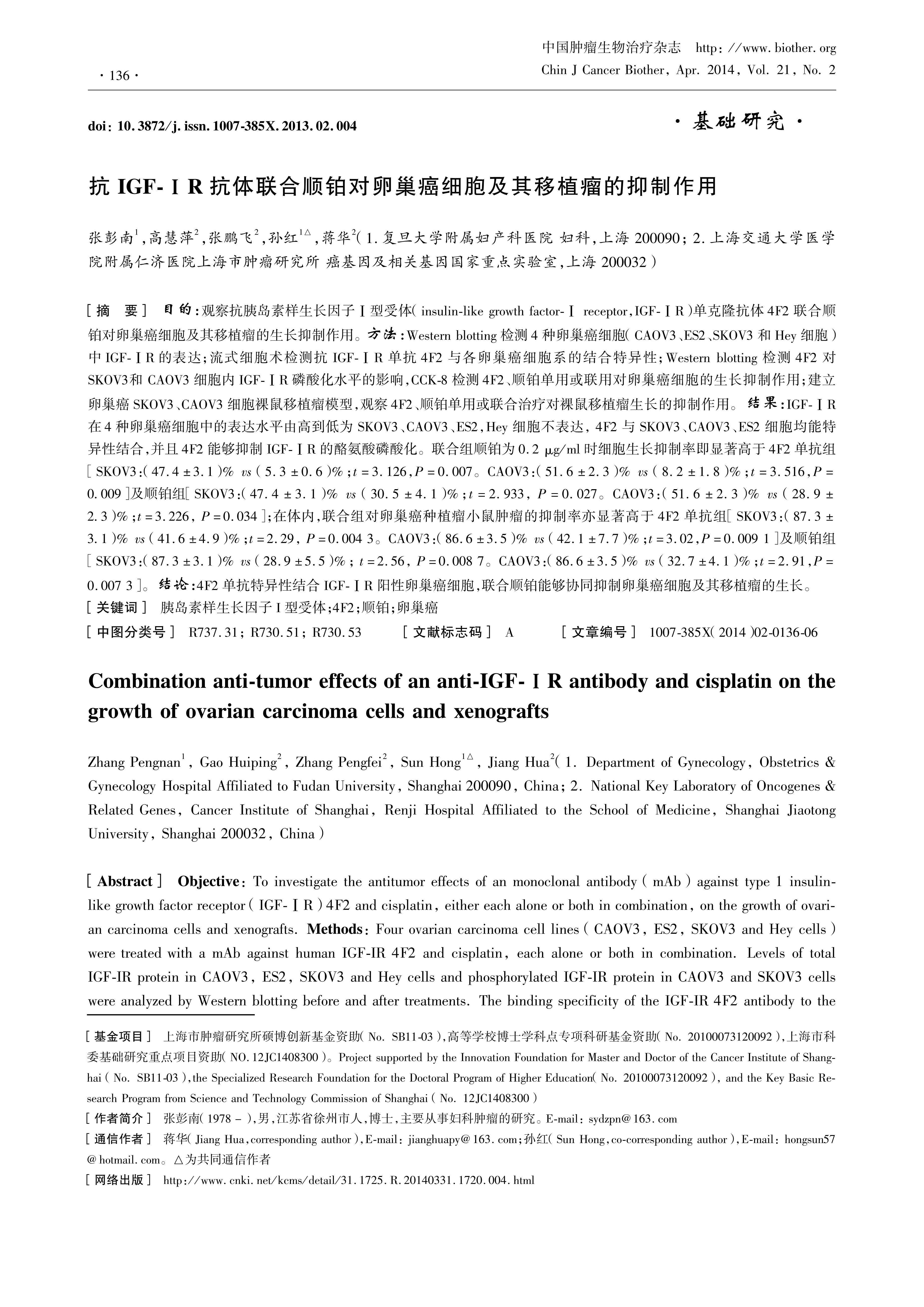 Objective : To investigate the antitumor effects of an monoclonal antibody (mAb) against type 1 insulin-like growth factor receptor (IGF-ⅠR) 4F2 and cisplatin, either each alone or both in combination, on the growth of ovarian carcinoma cells and xenografts. Methods: Four ovarian carcinoma cell lines (CAOV3, ES2, SKOV3 and Hey cells) were treated with a mAb against human IGF-IR 4F2 and cisplatin, each alone or both in combination. Levels of total IGF-IR protein in CAOV3, ES2, SKOV3 and Hey cells and phosphorylated IGF-IR protein in CAOV3 and SKOV3 cells were analyzed by Western blotting before and after treatments. The binding specificity of the IGF-IR 4F2 antibody to the four types ovarian carcinoma cells was assessed by flow cytometry. The inhibitory effects of treatments on the growth of ovarian cancer cells was assessed with the CCK-8 assay in vitro. To evaluate these effects in vivo, nude mice were injected with SKOV3 and CAOV3 cells, followed by drug treatment (i.e., the IGF-IR 4F2 antibody and 0.2 μg/ml cisplatin, each alone or both in combination). PBS served as a negative control. The animals were then sacrificed and their ovarian tumor size was examined. Accordingly, rates of the treatment-induced tumor growth inhibition were calculated. Results: IGF-ⅠR protein was detected in CAOV3, ES2 and SKOV3 cells. IGF-IR 4F2 antibody bound specifically to these cells and resulted in a significant decrease in IGF-IR phosphorylation (P<0.05). The combined use of the IGF-IR 4F2 antibody and cisplatin was significantly more effective than the separate use of these two drugs in inhibiting proliferation in both SKOV3 cells ([47.4±3.1]% vs [5.3±0.6]% and [30.5±4.1]%,P<0.05) and CAOV3 cells ([51.6±2.3\]% vs [8.2±1.8]% and, [28.9±2.3]%, P<0.05). In vivo, the IGF-IR 4F2 antibody and cisplatin in combination had significantly higher inhibition rates than the two drugs each by itself on tumor growth in both mice injected with SKOV3 cells([87.3±3.1]% vs[41.6±4.9]% and [28.9±5.5]%,P<0.01) and mice injected with CAOV3 cells ([86.6±3.5]% vs [42.1±7.7]%, [32.7±4.1]%, P<0.01). Conclusion: The tested anti-human IGF-IR 4F2 mAb can bind specifically to IGF-ⅠR-positive ovarian carcinoma cells and has a synergistic inhibitory effect on the growth of ovarian carcinoma cells both in vitro and vin vivo when used in combination with cisplatin.