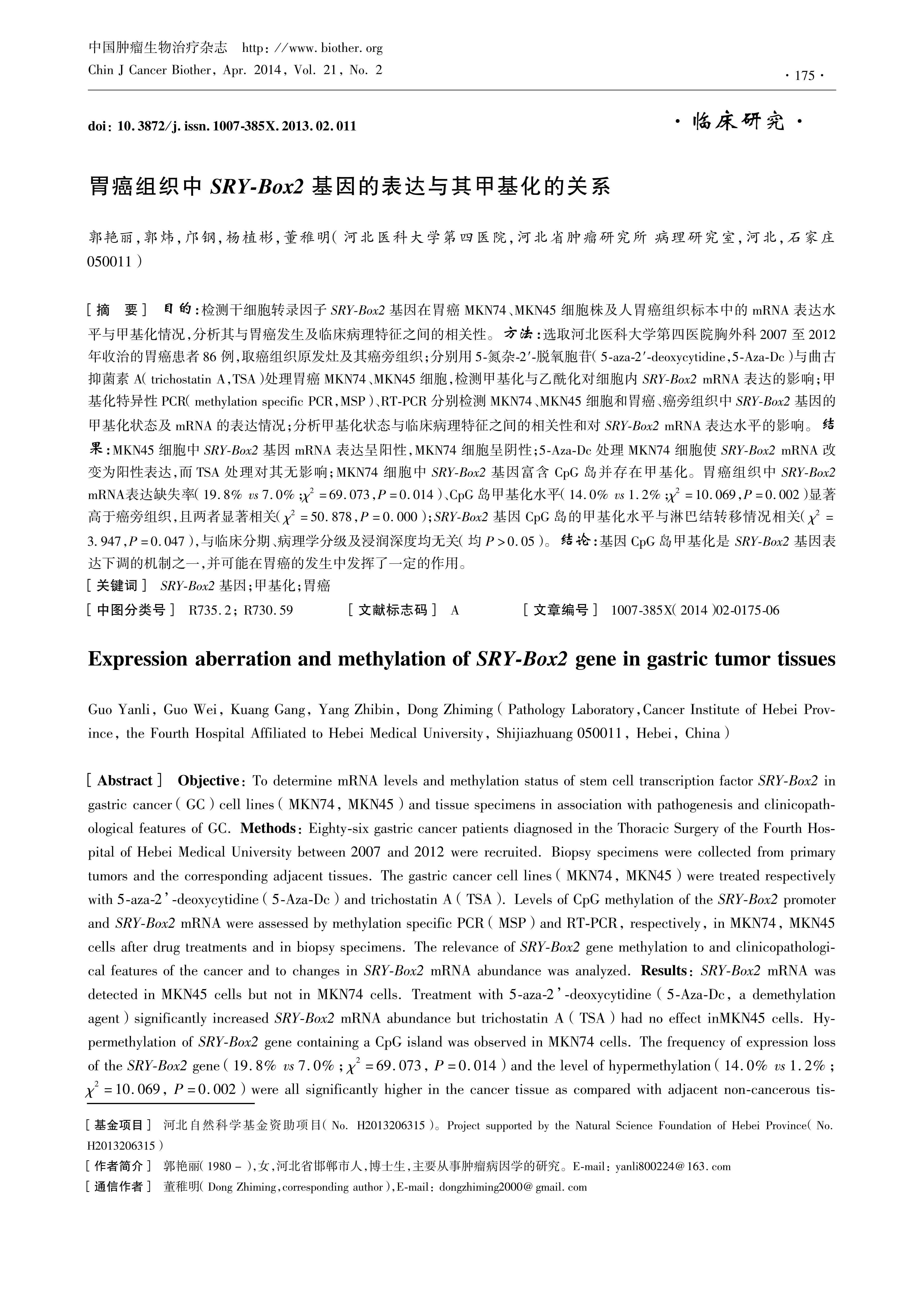 Objective : To determine mRNA levels and methylation status of stem cell transcription factor SRY-Box2 in gastric cancer (GC) cell lines (MKN74, MKN45) and tissue specimens in association with pathogenesis and clinicopathological features of GC. Methods: Eighty-six gastric cancer patients diagnosed in the Thoracic Surgery of the Fourth Hospital of Hebei Medical University between 2007 and 2012 were recruited. Biopsy specimens were collected from primary tumors and the corresponding adjacent tissues. The gastric cancer cell lines (MKN74, MKN45) were treated respectively with 5-aza-2’-deoxycytidine (5-Aza-Dc) and trichostatin A (TSA). Levels of CpG methylation of the SRY-Box2 promoter and SRY-Box2 mRNA were assessed by methylation specific PCR (MSP) and RT-PCR, respectively, in MKN74, MKN45 cells after drug treatments and in biopsy specimens. The relevance of SRY-Box2 gene methylation to and clinicopathological features of the cancer and to changes in RY-Box2 mRNA abundance was analyzed. Results: SRY-Box2 mRNA was detected in MKN45 cells but not in MKN74 cells. Treatment with 5-aza-2’-deoxycytidine (5-Aza-Dc, a demethylation agent) significantly increased SRY-Box2 mRNA abundance but trichostatin A (TSA) had no effect inMKN45 cells. Hypermethylation of SRY-Box2 gene containing a CpG island was observed in MKN74 cells. The frequency of expression loss of the SRY-Box2 gene (19.8% vs 7.0%; χ 2=69.073, P=0.014) and the level of hypermethylation (14.0% vs 1.2%;χ 2=10.069, P=0.002) were all significantly higher in the cancer tissue as compared with adjacent non-cancerous tissues.and hypermethylation was significantly correlated with expression loss in the SRY-Box2 gene (χ 2=50.878,P<0001). Furthermore, SRY-Box2 gene hypermethylation status was also correlated with lymph node metastasis (χ 2=3947, P=0.047), but not with clinical stage, pathological grade and depth of invasion ( P>0.05). Conclusion: CpG hypermethylation may be one of the mechanisms responsible for the expression loss of the SRY-Box2 gene and may play some role in the pathogenesis of gastric cancer.