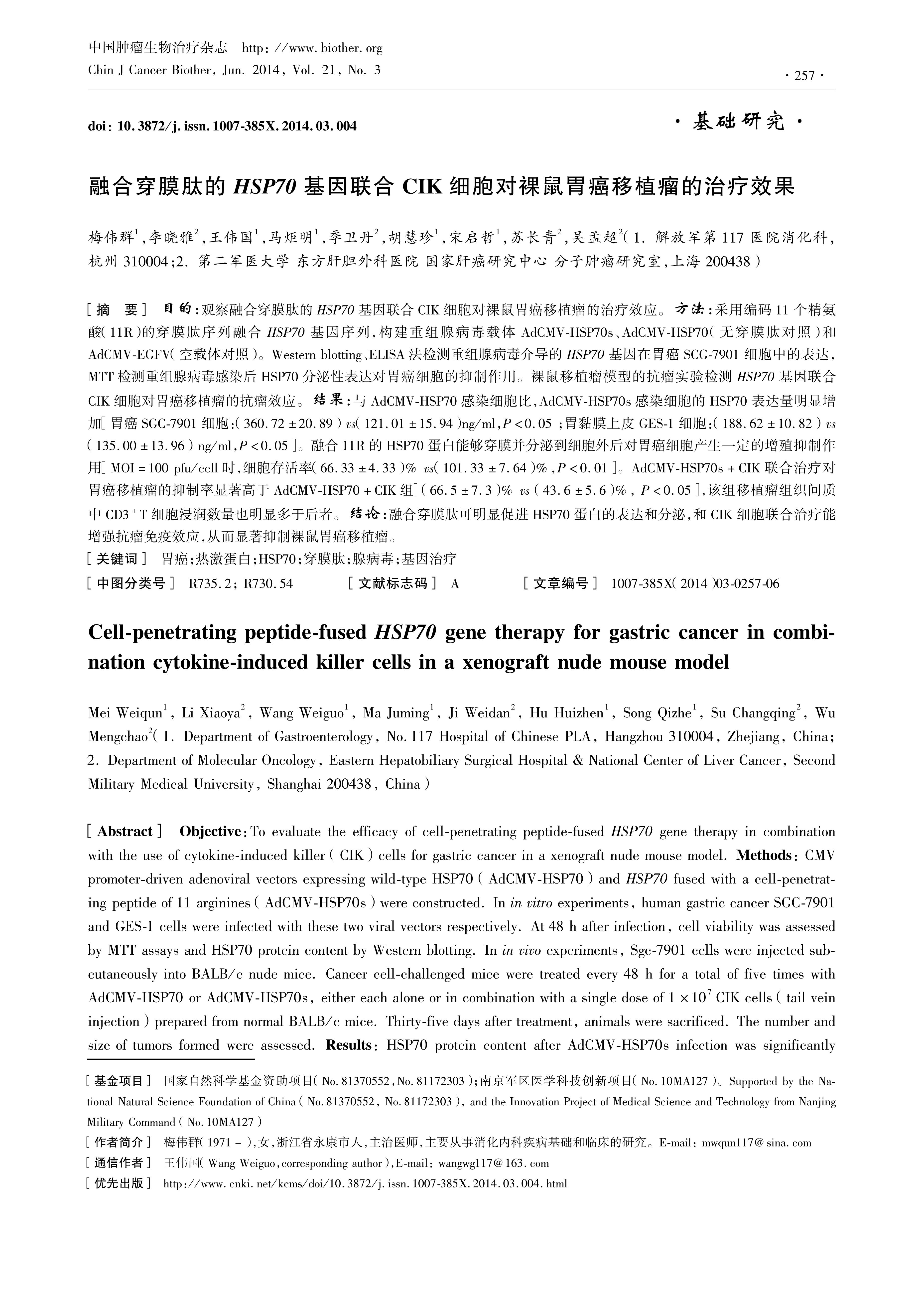 观察融合穿膜肽的HSP70基因联合CIK细胞对裸鼠胃癌移植瘤的治疗效应。方法:采用编码11个精氨酸(11R)的穿膜肽序列融合HSP70基因序列,构建重组腺病毒载体AdCMV-HSP70s、AdCMV-HSP70(无穿膜肽对照)和AdCMV-EGFV(空载体对照)。Western blotting、ELISA法检测重组腺病毒介导的HSP70基因在胃癌SCG-7901细胞中的表达,MTT检测重组腺病毒感染后HSP70分泌性表达对胃癌细胞的抑制作用。裸鼠移植瘤模型的抗瘤实验检测HSP70基因联合CIK细胞对胃癌移植瘤的抗瘤效应。结果:与AdCMV-HSP70感染细胞比,AdCMV-HSP70s感染细胞的HSP70表达量明显增加[胃癌SGC-7901细胞:(360.72±20.89) vs(121.01±15.94)ng/ml,P<0.05 ;胃黏膜上皮GES-1细胞:(188.62±10.82) vs(135.00±13.96) ng/ml,P<0.05]。融合11R的HSP70蛋白能够穿膜并分泌到细胞外后对胃癌细胞产生一定的增殖抑制作用[MOI=100 pfu/cell时,细胞存活率(66.33±4.33)% vs(101.33±7.64)%,P<0.01]。AdCMV-HSP70s+CIK联合治疗对胃癌移植瘤的抑制率显著高于AdCMV-HSP70+CIK组[(66.5±7.3)% vs (43.6±5.6)%, P<0.05],该组移植瘤组织间质中CD3+T细胞浸润数量也明显多于后者。结论:融合穿膜肽可明显促进HSP70蛋白的表达和分泌,和CIK细胞联合治疗能增强抗瘤免疫效应,从而显著抑制裸鼠胃癌移植瘤。