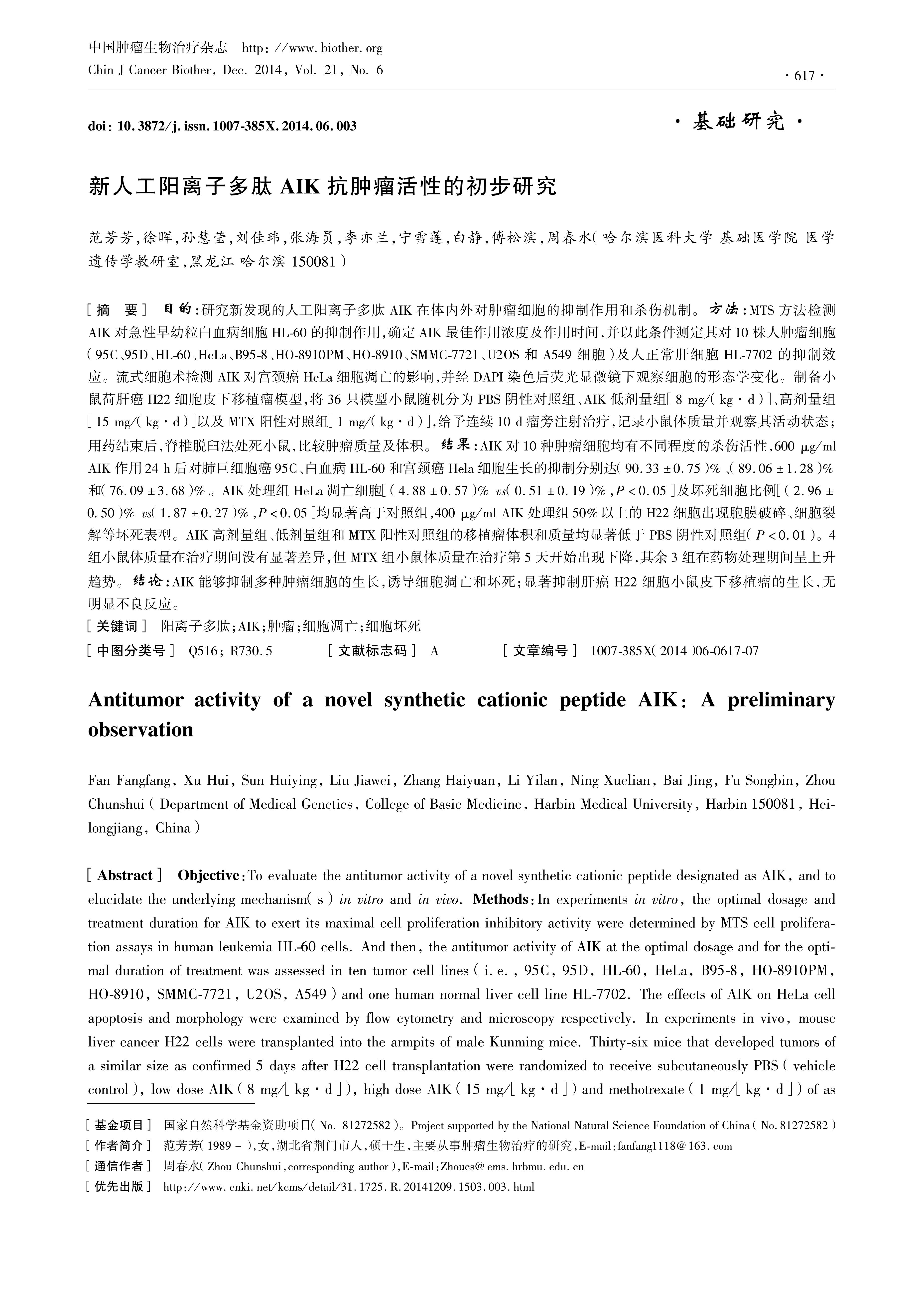 Objective:To evaluate the antitumor activity of a novel synthetic cationic peptide designated as AIK, and to elucidate the underlying mechanism(s) in vitro and in vivo . Methods:In experiments in vitro , the optimal dosage and treatment duration for AIK to exert its maximal cell proliferation inhibitory activity were determined by MTS cell proliferation assays in human leukemia HL-60 cells. And then, the antitumor activity of AIK at the optimal dosage and for the optimal duration of treatment was assessed in ten tumor cell lines (i.e., 95C, 95D, HL-60, HeLa, B95-8, HO-8910PM, HO-8910, SMMC-7721, U2OS, A549) and one human normal liver cell line HL-7702. The effects of AIK on HeLa cell apoptosis and morphology were examined by flow cytometry and microscopy respectively. In experiments in vivo, mouse liver cancer H22 cells were transplanted into the armpits of male Kunming mice. Thirty-six mice that developed tumors of a similar size as confirmed 5 days after H22 cell transplantation were randomized to receive subcutaneously PBS (vehicle control), low dose AIK (8 mg/\[kg?d\]), high dose AIK (15 mg/\[kg?d\]) and methotrexate (1 mg/\[kg?d\]) of as a positive control daily for 10 days, during which body weight was measured every day. Animals were sacrificed 24 h after the last treatment. Subcutaneous tumors were counted in each animal. Data on the weight and volume of the individual tumors were obtained and analyzed. Results: In vitro, AIK exhibited a potent cytotoxic activity against all types of cancer cells tested, in particular, the pulmonary giant cell carcinoma 95C cells, the leukemia HL-60 cells, and the cervical cancer HeLa cells. AIK treatment, as compared with vehicle control, resulted in significant increases in apoptosis (\[ 4.88± 0.57\]% vs \[0.51±0.19\]%, P <0.05) and necrosis (\[2.96±0.50\]% vs \[1.87±0.27\]%, P <0.05) in HeLa cells. Microscopic assessment showed necrotic phenomena including dilated, fragmented cell membrane and cell lysis in more than 50% of AIK treated H22 cells. In vivo, tumor volume and weight were significantly smaller in both AIK-and methotrexate-treated animals than in PBS-treated animals ( P <0.01). Body weight declined in methotrexate-treated animals but tended to increase in other 3 groups of animals 5 days after treatment. Nevertheless, the overall differences in body weight changes between the 4 groups of animals failed to reach a statistical significance ( P >0.05). Conclusion: The novel cationic peptide AIK possesses a potent antitumor activity both in vitro and in vivo , thus having a great therapeutic potential for various types of cancer.