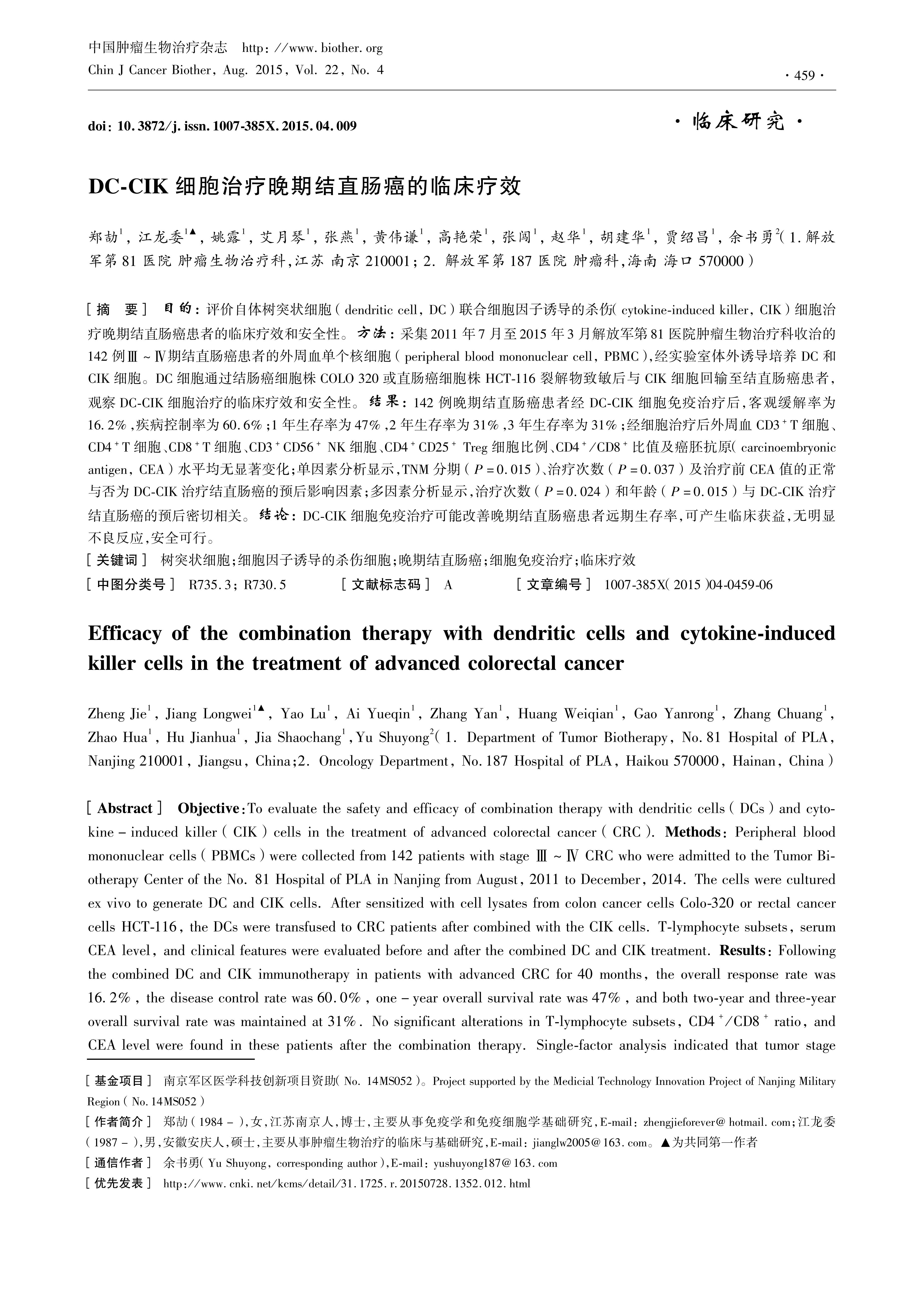 目的:评价自体树突状细胞 (dendritic cell, DC) 联合细胞因子诱导的杀伤(cytokine-induced killer, CIK) 细胞治疗晚期结直肠癌患者的临床疗效和安全性。方法: 采集2011年7月至2015年3月解放军第81医院肿瘤生物治疗科收治的142例Ⅲ~Ⅳ期结直肠癌患者的外周血单个核细胞 (peripheral blood mononuclear cell, PBMC),经实验室体外诱导培养DC和CIK细胞。DC细胞通过结肠癌细胞株COLO 320或直肠癌细胞株HCT-116裂解物致敏后与CIK细胞回输至结直肠癌患者,观察DC-CIK细胞治疗的临床疗效和安全性。结果: 142例晚期结直肠癌患者经DC-CIK细胞免疫治疗后,客观缓解率为162%,疾病控制率为60.6%;1年生存率为47%,2年生存率为31%,3年生存率为31%;经细胞治疗后外周血CD3+T细胞、CD4+T细胞、CD8+T细胞、CD3+CD56+ NK细胞、CD4+CD25+ Treg细胞比例、CD4+/CD8+比值及癌胚抗原(carcinoembryonic antigen, CEA) 水平均无显著变化;单因素分析显示,TNM分期 (P=0.015)、治疗次数 (P=0.037) 及治疗前CEA值的正常与否为DC-CIK治疗结直肠癌的预后影响因素;多因素分析显示,治疗次数 (P=0.024) 和年龄 (P=0.015) 与DC-CIK治疗结直肠癌的预后密切相关。结论: DC-CIK细胞免疫治疗可能改善晚期结直肠癌患者远期生存率,可产生临床获益,无明显不良反应,安全可行。