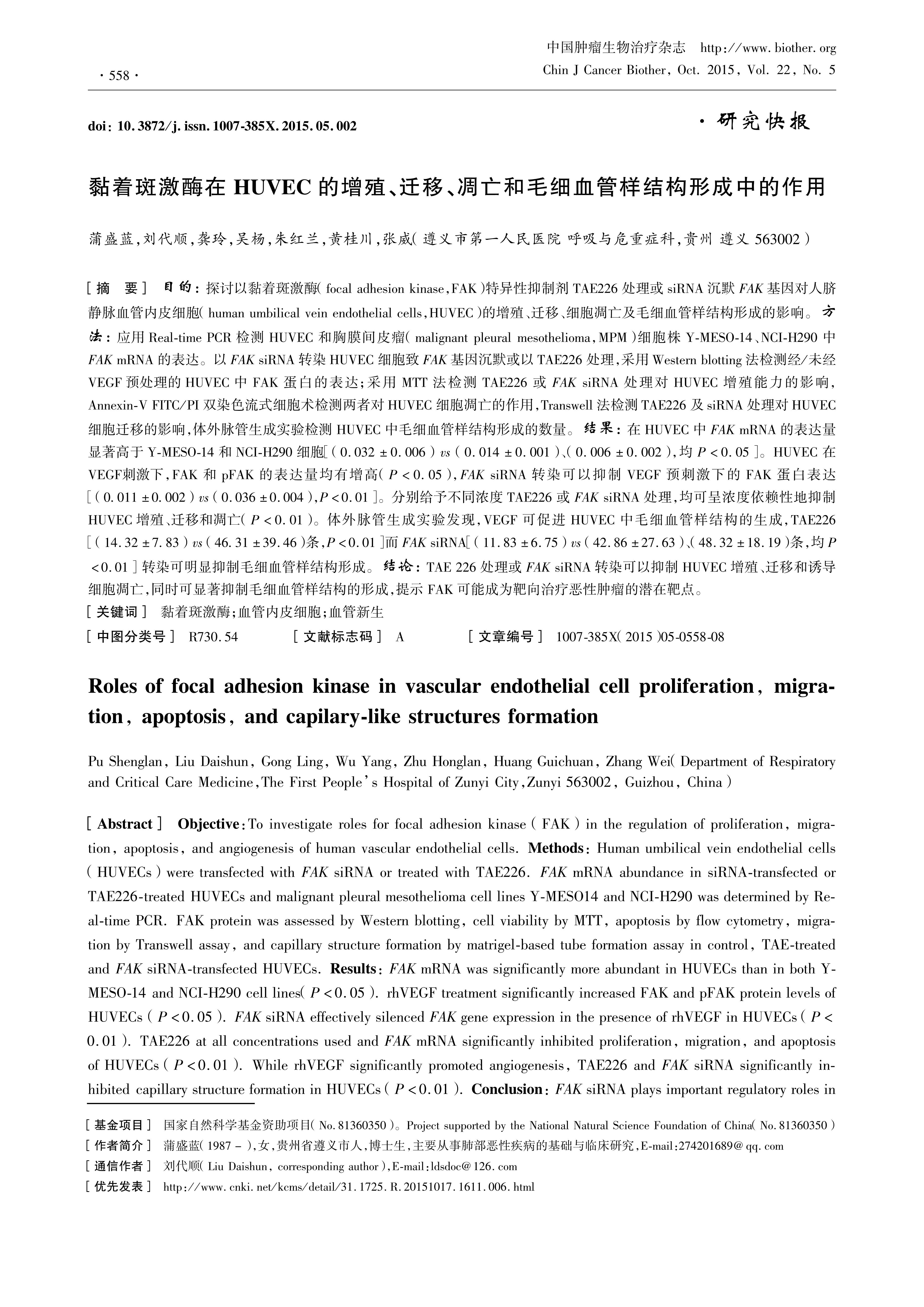 目的: 探讨以黏着斑激酶(focal adhesion kinase,FAK)特异性抑制剂TAE226处理或siRNA沉默FAK基因对人脐静脉血管内皮细胞(human umbilical vein endothelial cells,HUVEC)的增殖、迁移、细胞凋亡及毛细血管样结构形成的影响。方法: 应用Real-time PCR检测HUVEC和胸膜间皮瘤(malignant pleural mesothelioma,MPM)细胞株Y-MESO-14、NCI-H290中FAK mRNA的表达。以FAK siRNA转染HUVEC细胞致FAK基因沉默或以TAE226处理,采用Western blotting法检测经/未经VEGF预处理的HUVEC中FAK蛋白的表达;采用MTT法检测TAE226或FAK siRNA处理对HUVEC增殖能力的影响,Annexin-V FITC/PI双染色流式细胞术检测两者对HUVEC细胞凋亡的作用,Transwell法检测TAE226及siRNA处理对HUVEC细胞迁移的影响,体外脉管生成实验检测HUVEC中毛细血管样结构形成的数量。结果: 在HUVEC中FAK mRNA的表达量显著高于Y-MESO-14和NCI-H290细胞\[(0.032±0.006) vs (0.014±0.001)、(0.006±0.002),均P<0.05\]。HUVEC在VEGF刺激下,FAK和pFAK的表达量均有增高(P<0.05),FAK siRNA转染可以抑制VEGF预刺激下的FAK蛋白表达\[(0011±0002) vs (0.036±0.004),P<0.01\]。分别给予不同浓度TAE226或FAK siRNA处理,均可呈浓度依赖性地抑制HUVEC增殖、迁移和凋亡(P<0.01)。体外脉管生成实验发现,VEGF可促进HUVEC中毛细血管样结构的生成,TAE226\[(14.32±783) vs (4631±39.46)条,P<0.01\]而FAK siRNA\[(11.83±6.75) vs (42.86±27.63)、(48.32±18.19)条,均P<0.01\] 转染可明显抑制毛细血管样结构形成。结论:TAE 226处理或FAK siRNA转染可以抑制HUVEC增殖、迁移和诱导细胞凋亡,同时可显著抑制毛细血管样结构的形成,提示FAK可能成为靶向治疗恶性肿瘤的潜在靶点。