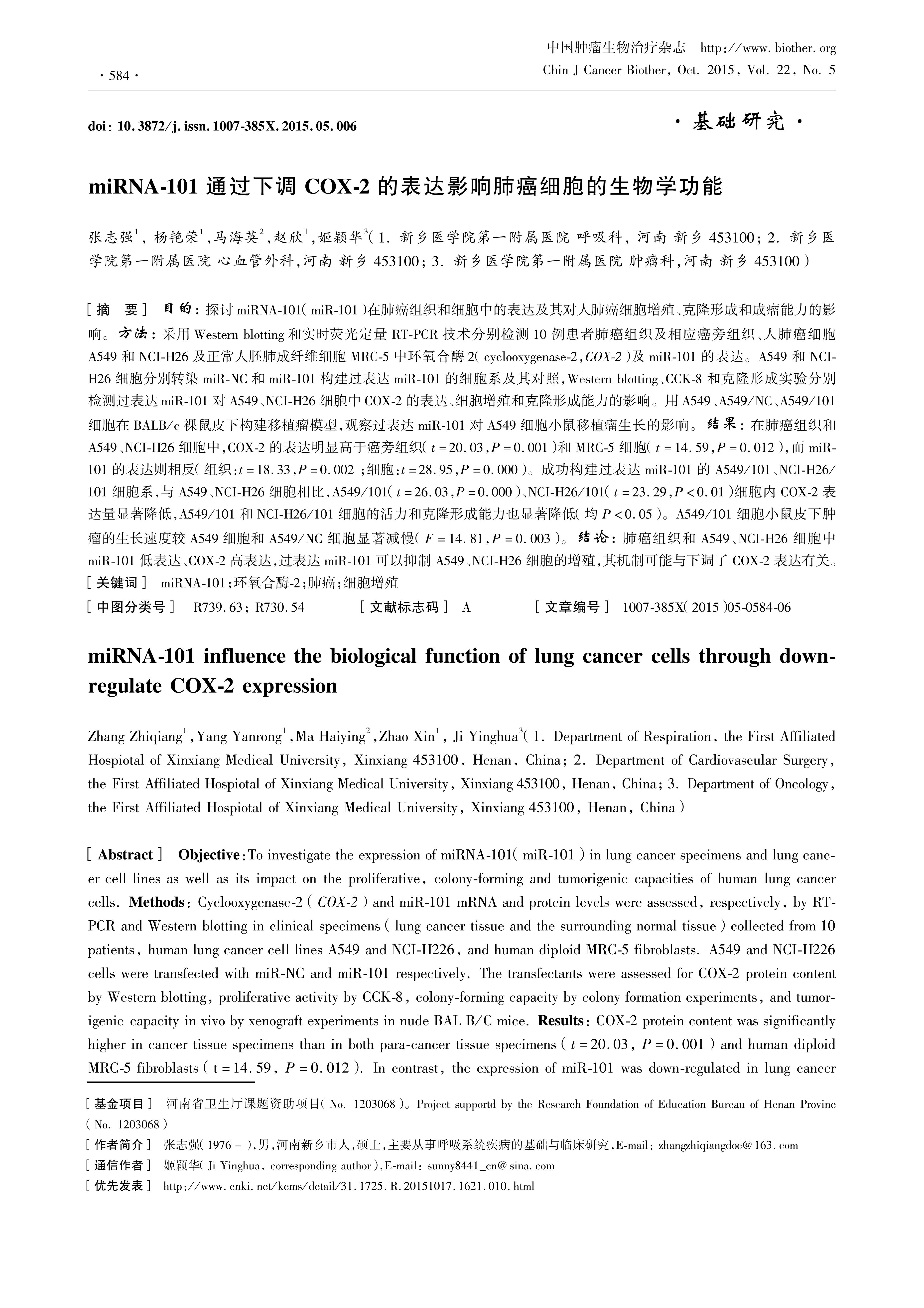 目的:探讨miRNA-101(miR-101)在肺癌组织和细胞中的表达及其对人肺癌细胞增殖、克隆形成和成瘤能力的影响。方法: 采用Western blotting和实时荧光定量RT-PCR技术分别检测10例患者肺癌组织及相应癌旁组织、人肺癌细胞A549和NCI-H26及正常人胚肺成纤维细胞MRC-5中环氧合酶2(cyclooxygenase-2,COX-2)及miR-101的表达。A549和NCI-H26细胞分别转染miR-NC和miR-101构建过表达miR-101的细胞系及其对照,Western blotting、CCK-8和克隆形成实验分别检测过表达miR-101对A549、NCI-H26细胞中COX-2的表达、细胞增殖和克隆形成能力的影响。用A549、A549/NC、A549/101细胞在BALB/c裸鼠皮下构建移植瘤模型,观察过表达miR-101对A549细胞小鼠移植瘤生长的影响。结果: 在肺癌组织和A549、NCI-H26细胞中,COX-2的表达明显高于癌旁组织(t=20.03,P=0.001)和MRC-5细胞(t=14.59,P=0.012),而miR-101的表达则相反(组织:t=18.33,P=0.002 ;细胞:t=28.95,P=0.000)。成功构建过表达miR-101的A549/101、NCI-H26/101细胞系,与A549、NCI-H26细胞相比,A549/101(t=26.03,P=0.000)、NCI-H26/101(t=23.29,P<0.01)细胞内COX-2表达量显著降低,A549/101和NCI-H26/101细胞的活力和克隆形成能力也显著降低(均P<0.05)。A549/101细胞小鼠皮下肿瘤的生长速度较A549细胞和A549/NC细胞显著减慢(F=14.81,P=0.003)。结论: 肺癌组织和A549、NCI-H26细胞中miR-101低表达、COX-2高表达,过表达miR-101可以抑制A549、NCI-H26细胞的增殖,其机制可能与下调了COX-2表达有关。