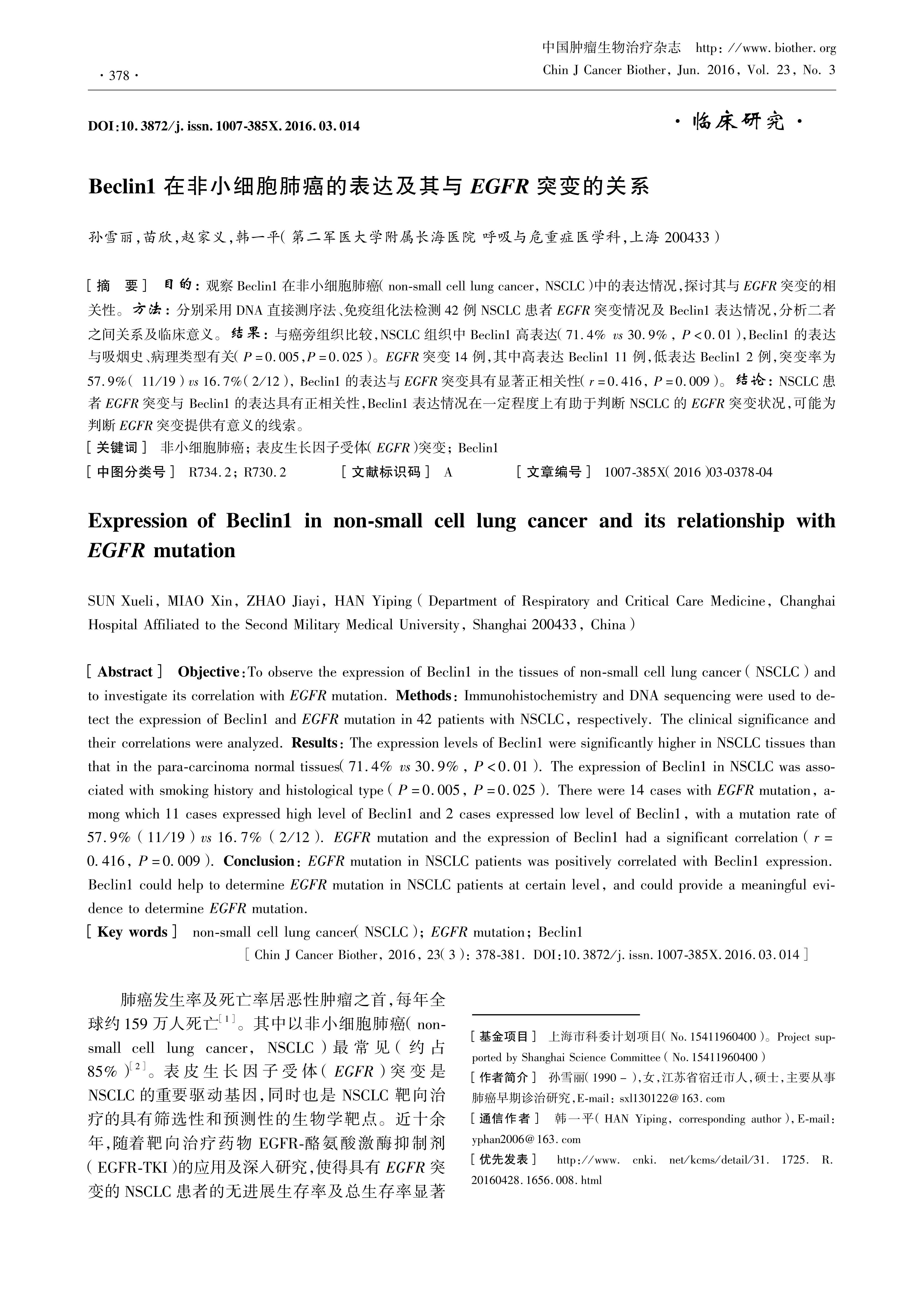 Objective:To observe the expression of Beclin1 in the tissues of non-small cell lung cancer (NSCLC) and to investigate its correlation with EGFR mutation. Methods: Immunohistochemistry and DNA sequencing were used to detect the expression of Beclin1 and EGFR mutation in 42 patients with NSCLC, respectively. The clinical significance and their correlations were analyzed. Results: he expression levels of Beclin1 were significantly higher in NSCLC tissues than that in the para-carcinoma normal tissues(71.4% vs 30.9%, P<0.01). The expression of Beclin1 in NSCLC was associated with smoking history and histological type (P=0.005, P=0.025). There were 14 cases with EGFR mutation, among which 11 cases expressed high level of Beclin1 and 2 cases expressed low level of Beclin1, with a mutation rate of 57.9% (11/19) vs 16.7% (2/12). EGFR mutation and the expression of Beclin1 had a significant correlation (r=0416, P=0009).Conclusion: EGFR mutation in NSCLC patients was positively correlated with Beclin1 expression. Beclin1 could help to determine EGFR mutation in NSCLC patients at certain level, and could provide a meaningful evidence to determine EGFR mutation.