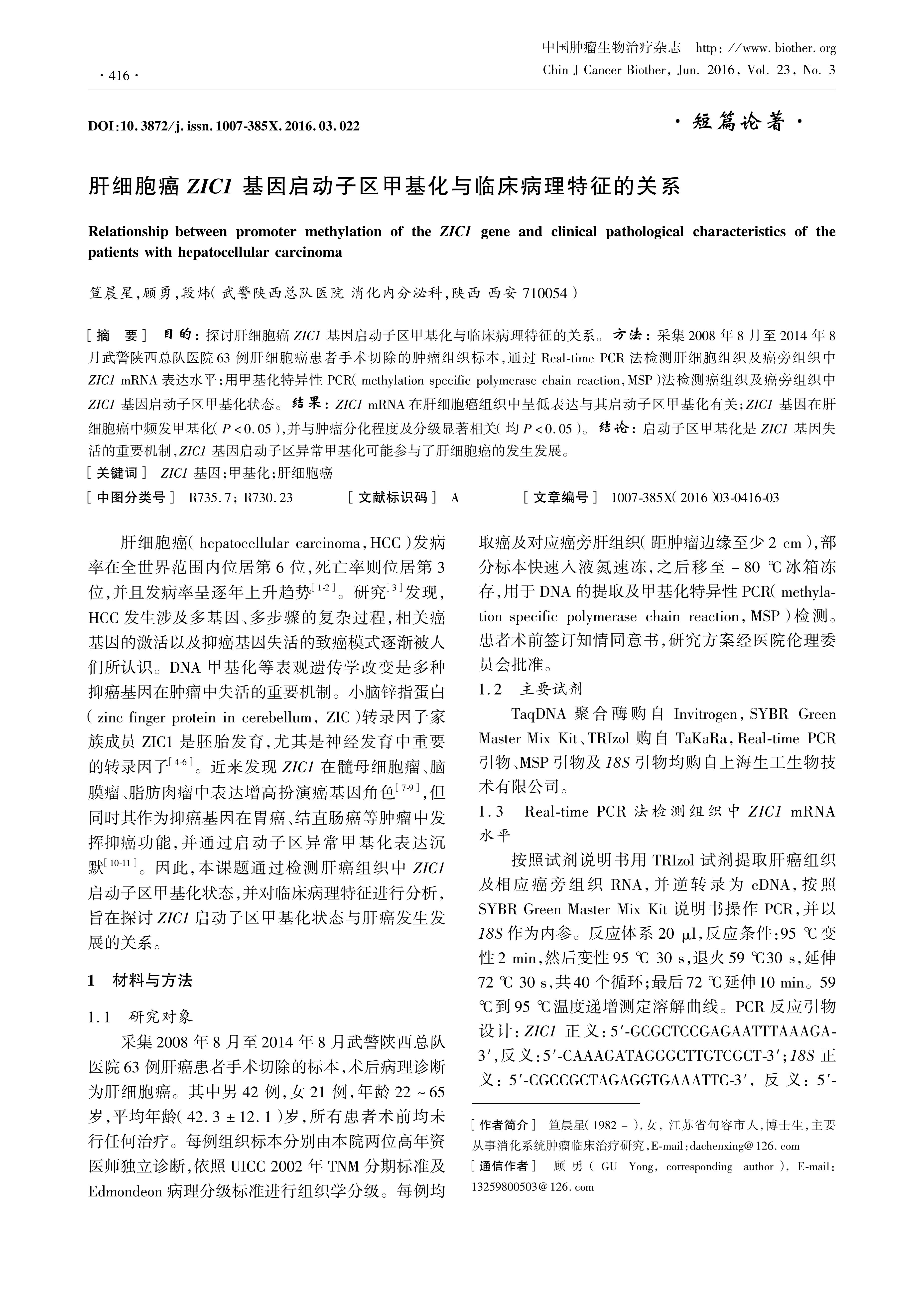Relationship between promoter methylation of the ZIC1 gene and clinical pathological characteristics of the patients with hepatocellular carcinoma