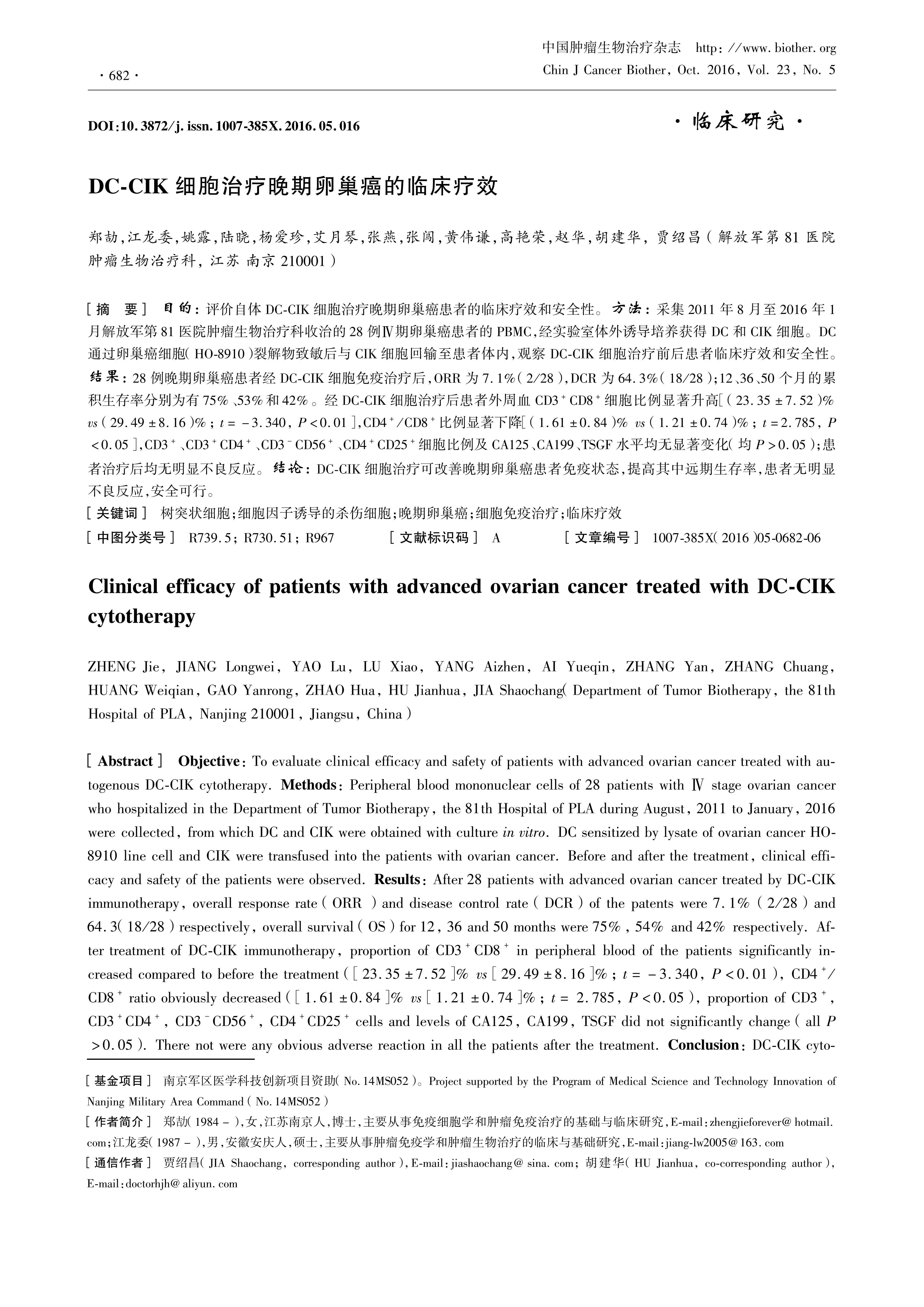 Objective:To evaluate clinical efficacy and safety of patients with advanced ovarian cancer treated with autogenous DC-CIK cytotherapy.Methods:Peripheral blood mononuclear cells of 28 patients with Ⅳ stage ovarian cancer who hospitalized in the Department of Tumor Biotherapy, the 81th Hospital of PLA during August, 2011 to January, 2016 were collected, from which DC and CIK were obtained with culture in vitro. DC sensitized by lysate of ovarian cancer HO-8910 line cell and CIK were transfused into the patients with ovarian cancer. Before and after the treatment, clinical efficacy and safety of the patients were observed. Results: After 28 patients with advanced ovarian cancer treated by DC-CIK immunotherapy, overall response rate (ORR) and disease control rate (DCR) of the patents were 7.1% (2/28) and 643(18/28) respectively, overall survival (OS) for 12, 36 and 50 months were 75%, 54% and 42% respectively. After treatment of DC-CIK immunotherapy, proportion of CD3+CD8+ in peripheral blood of the patients significantly increased compared to before the treatment (\[23.35±7.52\]% vs \[29.49±8.16\]%; t=-3.340, P<0.01), CD4+/CD8+ ratio obviously decreased (\[1.61±0.84\]% vs \[1.21±0.74\]%; t= 2.785, P<0.05), proportion of CD3+, CD3+CD4+, CD3-CD56+ , CD4+CD25+ cells and levels of CA125, CA199, TSGF did not significantly change (all P>0.05). There not were any obvious adverse reaction in all the patients after the treatment. Conclusion: DC-CIK cytotherapy could be as a safe and feasible theraputic approach which might improve immune status of the patients with advanced ovarian cancer, increase mid long term survival rate of the patients, and any obvious adverse reaction did not found in the patients treated with the immunotherapy.