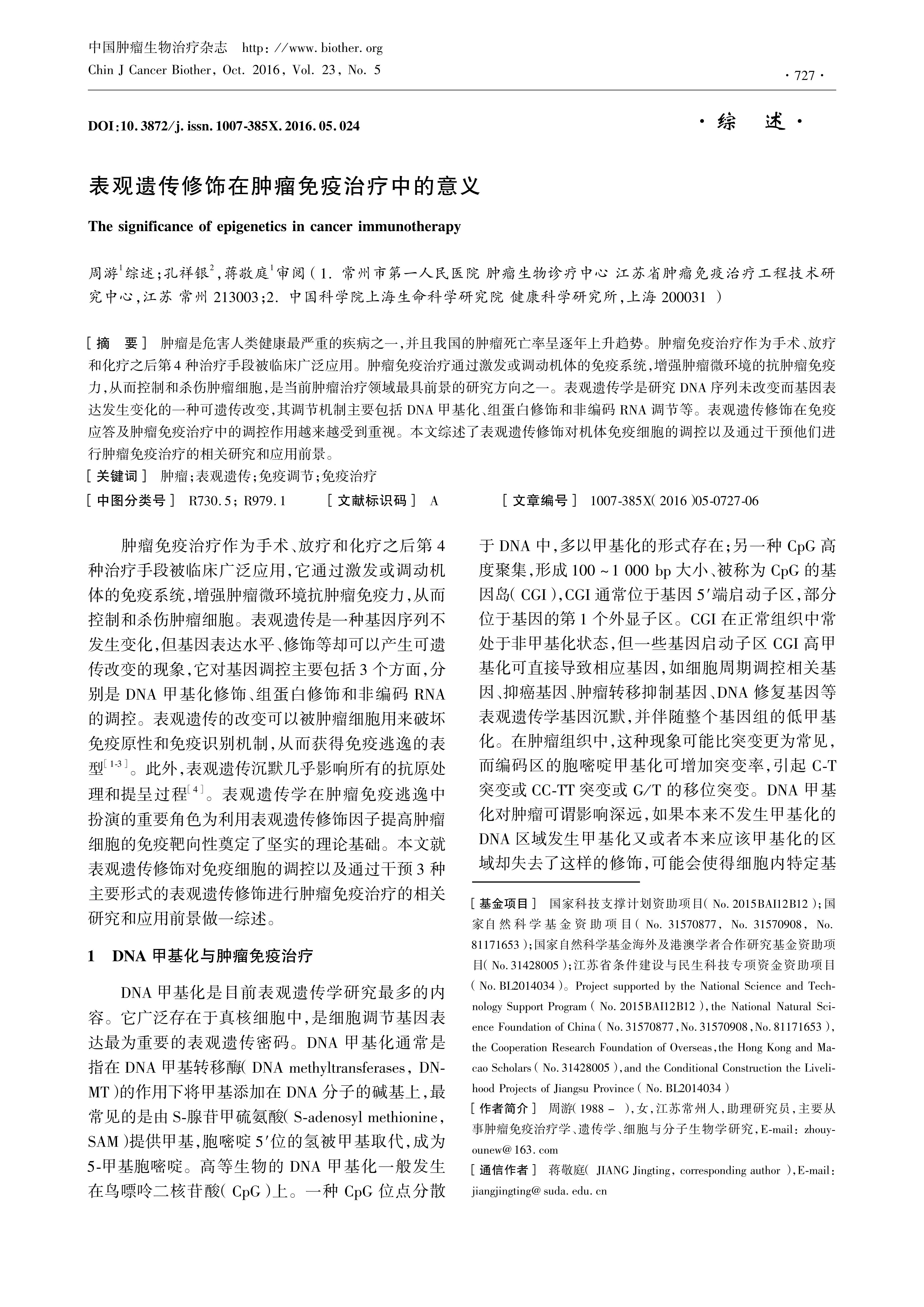肿瘤是危害人类健康最严重的疾病之一,并且我国的肿瘤死亡率呈逐年上升趋势。肿瘤免疫治疗作为手术、放疗和化疗之后第4种治疗手段被临床广泛应用。肿瘤免疫治疗通过激发或调动机体的免疫系统,增强肿瘤微环境的抗肿瘤免疫力,从而控制和杀伤肿瘤细胞,是当前肿瘤治疗领域最具前景的研究方向之一。表观遗传学是研究DNA序列未改变而基因表达发生变化的一种可遗传改变,其调节机制主要包括DNA甲基化、组蛋白修饰和非编码RNA调节等。表观遗传修饰在免疫应答及肿瘤免疫治疗中的调控作用越来越受到重视。本文综述了表观遗传修饰对机体免疫细胞的调控以及通过干预进行肿瘤免疫治疗的相关研究和应用前景。