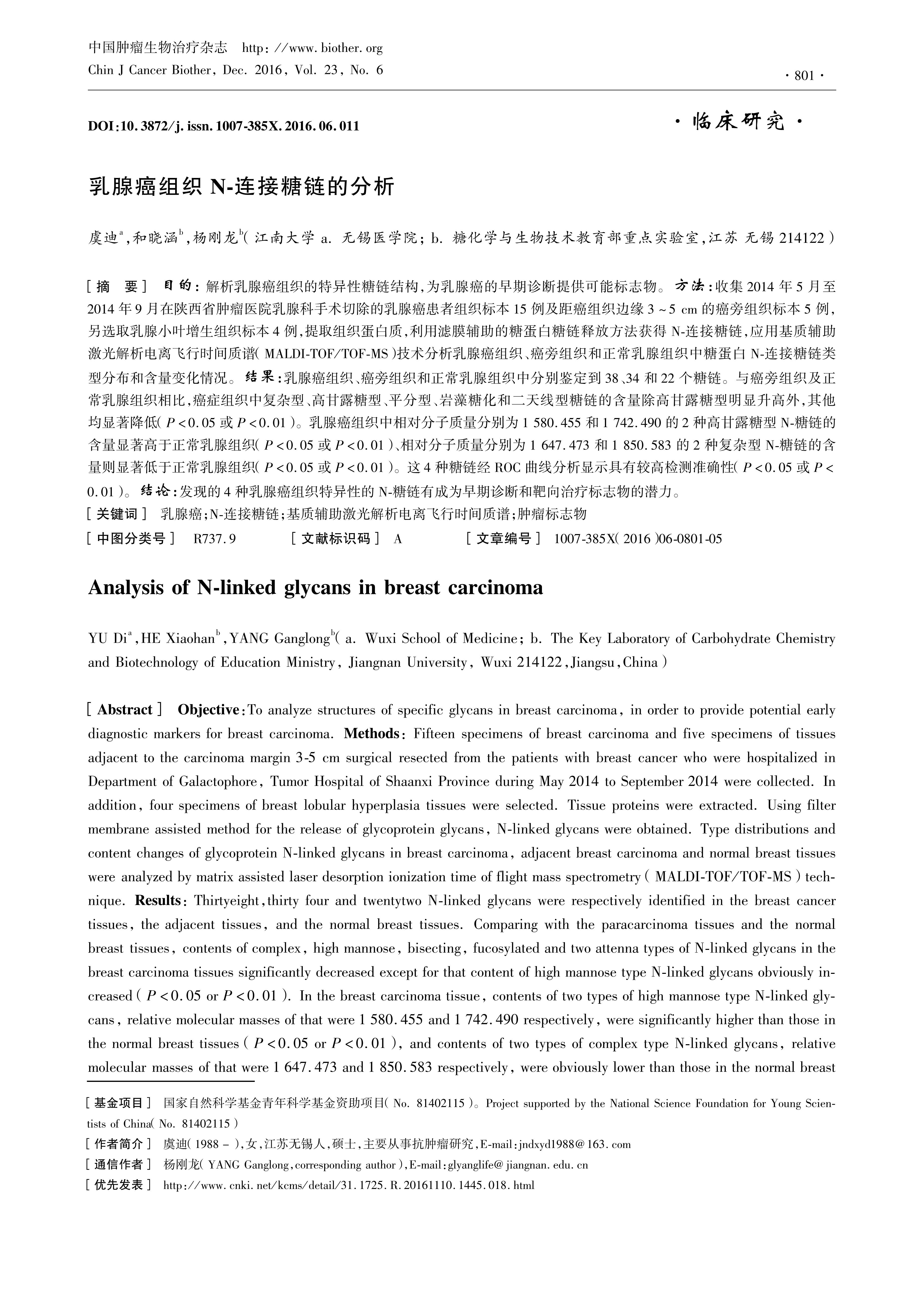 目的:解析乳腺癌组织的特异性糖链结构,为乳腺癌的早期诊断提供可能标志物。方法:收集2014年5月至2014年9月在陕西省肿瘤医院乳腺科手术切除的乳腺癌患者组织标本15例及距癌组织边缘3~5 cm的癌旁组织标本5例,另选取乳腺小叶增生组织标本4例,提取组织蛋白质,利用滤膜辅助的糖蛋白糖链释放方法获得N-连接糖链,应用基质辅助激光解析电离飞行时间质谱(MALDI-TOF/TOF-MS)技术分析乳腺癌组织、癌旁组织和正常乳腺组织中糖蛋白N-连接糖链类型分布和含量变化情况。结果:乳腺癌组织、癌旁组织和正常乳腺组织中分别鉴定到38、34和22个糖链。与癌旁组织及正常乳腺组织相比,癌症组织中复杂型、高甘露糖型、平分型、岩藻糖化和二天线型糖链的含量除高甘露糖型明显升高外,其他均显著降低(P<0.05或P<0.01)。乳腺癌组织中相对分子质量分别为1 580.455和1 742.490的2种高甘露糖型N-糖链的含量显著高于正常乳腺组织(P<0.05或P<0.01)、相对分子质量分别为1 647.473和1 850.583的2种复杂型N-糖链的含量则显著低于正常乳腺组织(P<0.05或P<0.01)。这4种糖链经ROC曲线分析显示具有较高检测准确性(P<0.05或P<0.01)。结论:发现的4种乳腺癌组织特异性的N-糖链有成为早期诊断和靶向治疗标志物的潜力。