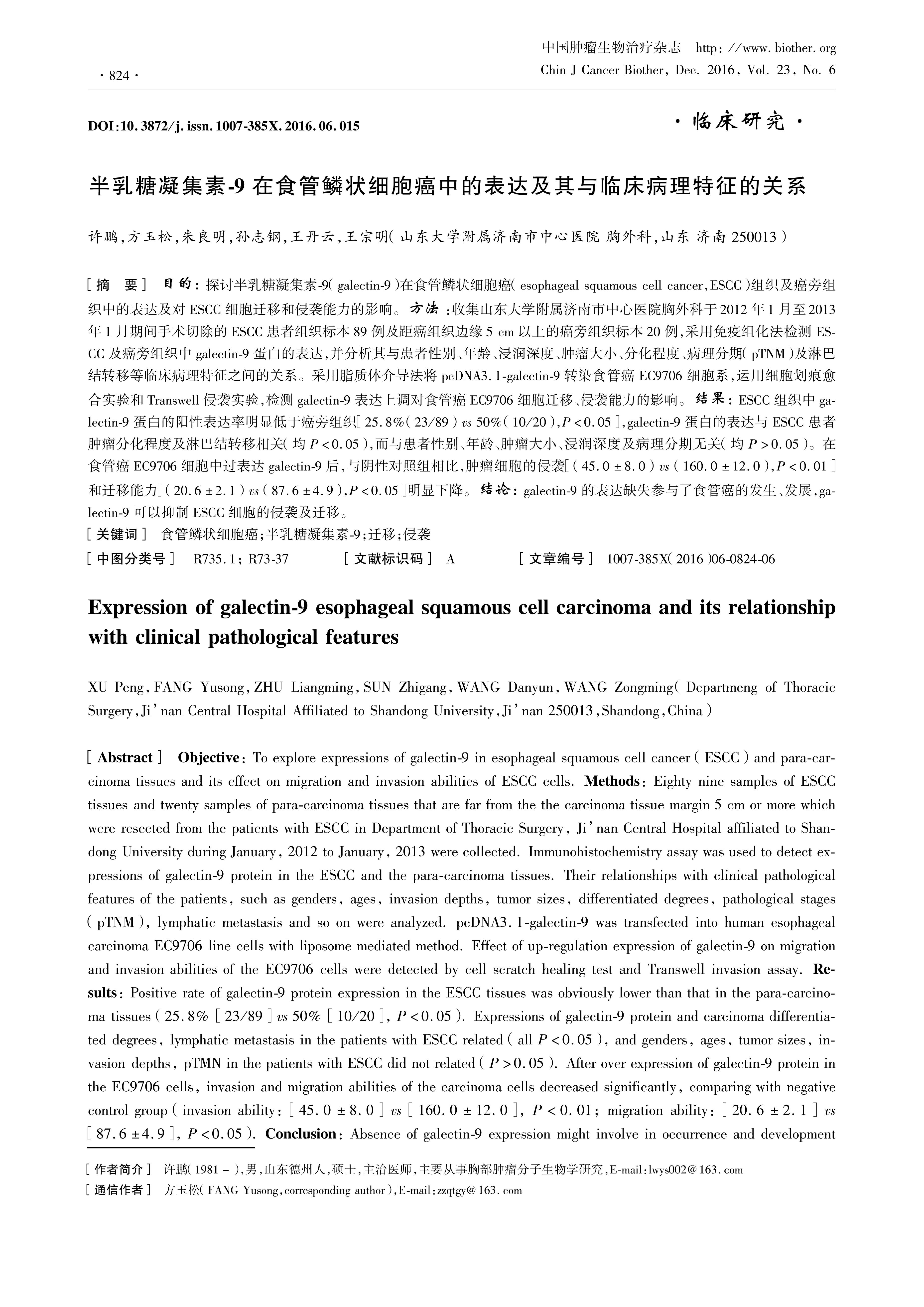 Objective:To explore expressions of galectin-9 in esophageal squamous cell cancer (ESCC) and para-carcinoma tissues and its effect on migration and invasion abilities of ESCC cells. Methods: Eighty nine samples of ESCC tissues and twenty samples of para-carcinoma tissues that are far from the the carcinoma tissue margin 5 cm or more which were resected from the patients with ESCC in Department of Thoracic Surgery, Ji’nan Central Hospital affiliated to Shandong University during January, 2012 to January, 2013 were collected. Immunohistochemistry assay was used to detect expressions of galectin-9 protein in the ESCC and the para-carcinoma tissues. Their relationships with clinical pathological features of the patients, such as genders, ages, invasion depths, tumor sizes, differentiated degrees, pathological stages (pTNM), lymphatic metastasis and so on were analyzed. pcDNA3.1-galectin-9 was transfected into human esophageal carcinoma EC9706 line cells with liposome mediated method. Effect of up-regulation expression of galectin-9 on migration and invasion abilities of the EC9706 cells were detected by cell scratch healing test and Transwell invasion assay. Results: Positive rate of galectin-9 protein expression in the ESCC tissues was obviously lower than that in the para-carcinoma tissues (25.8% \[23/89\] vs 50% \[10/20\], P<0.05). Expressions of galectin-9 protein and carcinoma differentiated degrees, lymphatic metastasis in the patients with ESCC related (all P<0.05), and genders, ages, tumor sizes, invasion depths, pTMN in the patients with ESCC did not related (P>0.05). After over expression of galectin-9 protein in the EC9706 cells, invasion and migration abilities of the carcinoma cells decreased significantly, comparing with negative control group (invasion ability: \[45.0±8.0\] vs \[160.0±12.0\], P<0.01; migration ability: \[20.6±2.1\] vs \[87.6±4.9\], P<0.05). Conclusion:Absence of galectin-9 expression might involve in occurrence and development of the esophageal carcinoma, galectin-9 could inhibit invasion and migration of the ESCC cells.