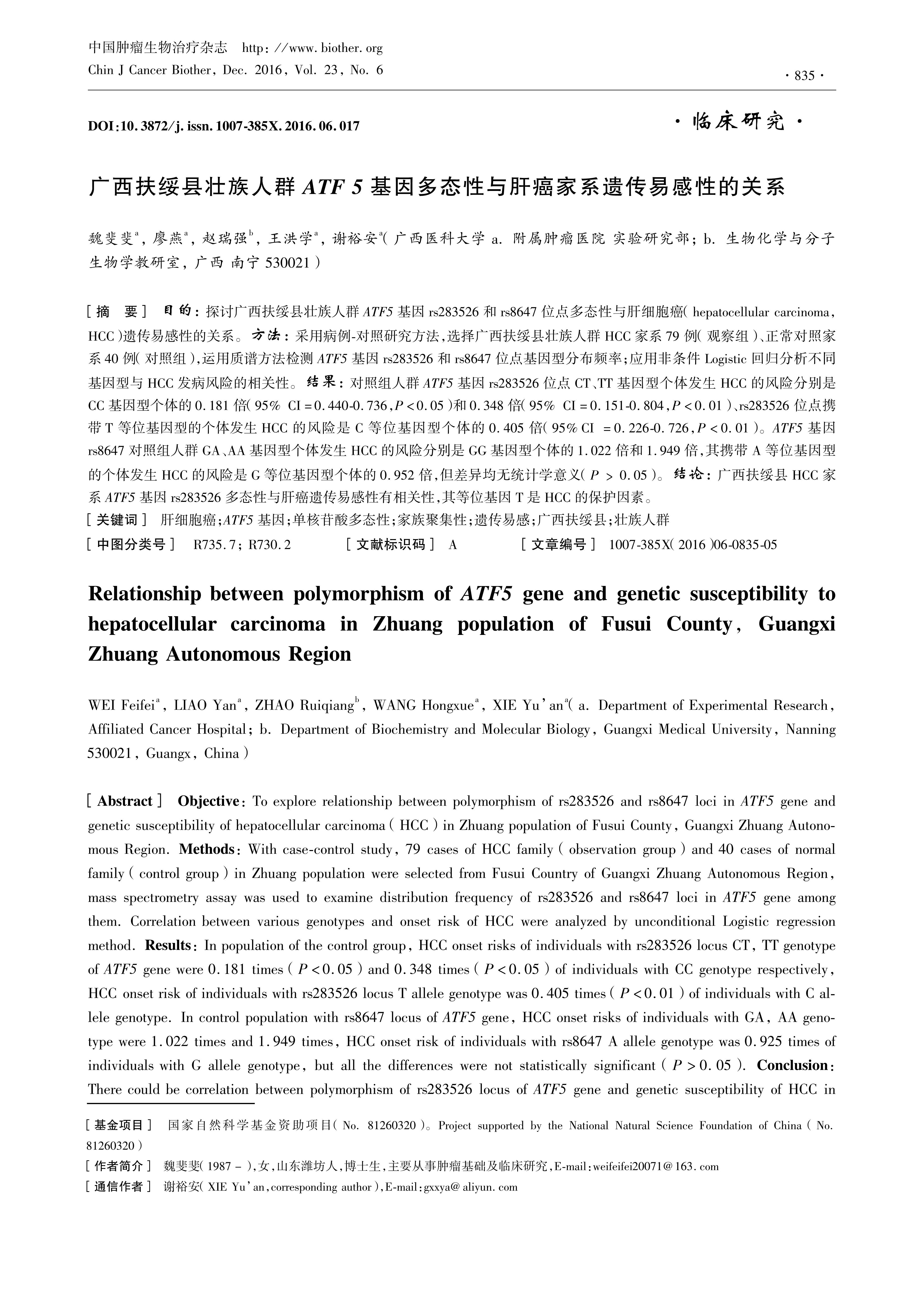 目的:探讨广西扶绥县壮族人群ATF5基因rs283526和rs8647位点多态性与肝细胞癌(hepatocellular carcinoma, HCC)遗传易感性的关系。方法:采用病例-对照研究方法,选择广西扶绥县壮族人群HCC家系79例(观察组)、正常对照家系40例(对照组),运用质谱方法检测ATF5基因rs283526和rs8647位点基因型分布频率;应用非条件Logistic回归分析不同基因型与HCC发病风险的相关性。结果:对照组人群ATF5基因rs283526位点CT、TT基因型个体发生HCC的风险分别是CC基因型个体的0.181倍(95% CI=0.440-0.736,P<0.05)和0.348倍(95% CI=0.151-0.804,P<0.01)、rs283526位点携带T 等位基因型的个体发生HCC的风险是C等位基因型个体的0.405倍(95%CI =0.226-0.726,P<0.01)。ATF5基因rs8647对照组人群GA、AA基因型个体发生HCC的风险分别是GG基因型个体的1.022倍和1.949倍,其携带A等位基因型的个体发生HCC的风险是G等位基因型个体的0.952倍,但差异均无统计学意义(P﹥0.05)。结论:广西扶绥县HCC家系ATF5基因rs283526多态性与肝癌遗传易感性有相关性,其等位基因T是HCC的保护因素。