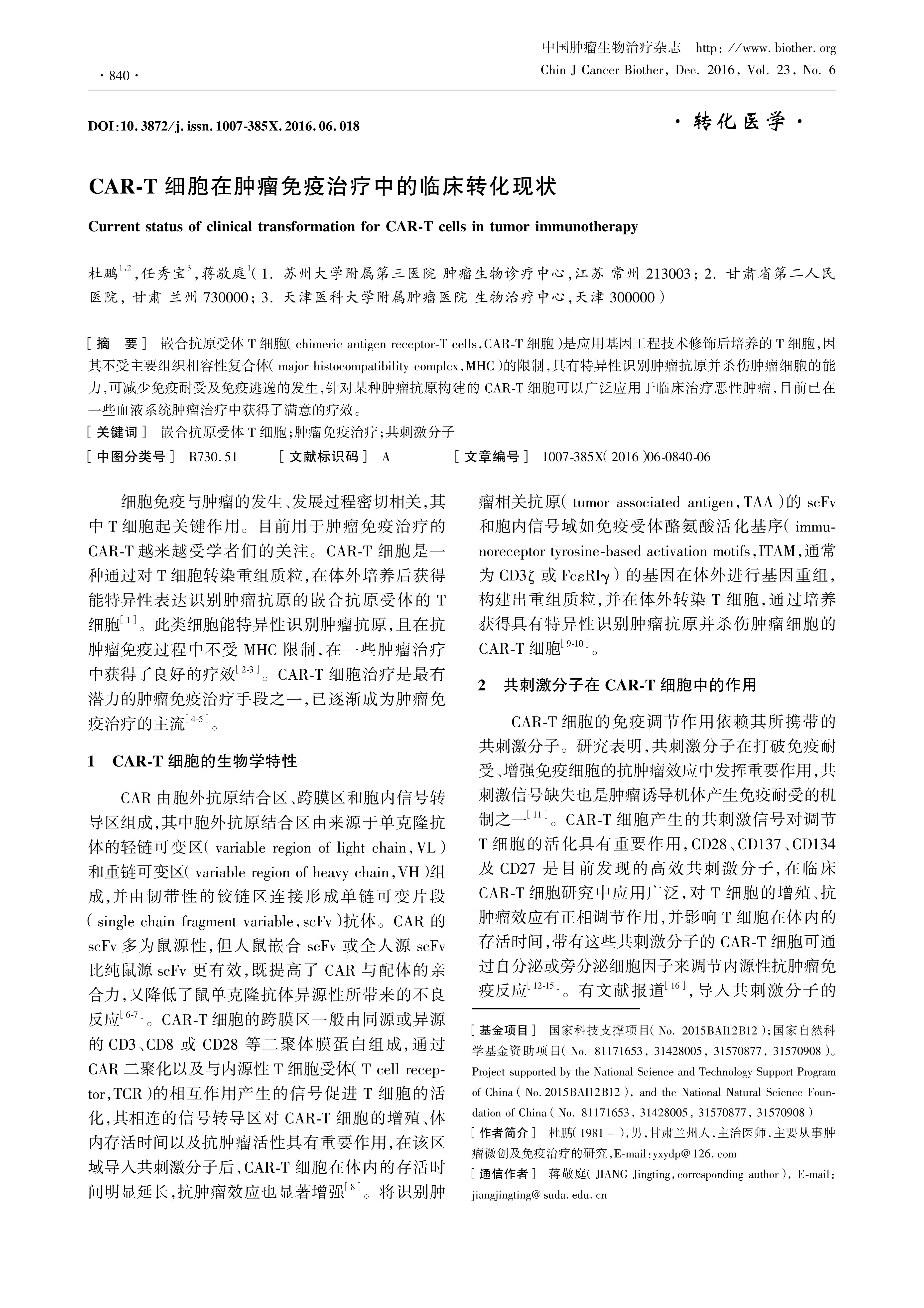嵌合抗原受体T细胞(chimeric antigen receptor-T cells,CAR-T细胞)是应用基因工程技术修饰后培养的T细胞,因其不受主要组织相容性复合体(major histocompatibility complex,MHC)的限制,具有特异性识别肿瘤抗原并杀伤肿瘤细胞的能力,可减少免疫耐受及免疫逃逸的发生,针对某种肿瘤抗原构建的CAR-T细胞可以广泛应用于临床治疗恶性肿瘤,目前已在一些血液系统肿瘤治疗中获得了满意的疗效。