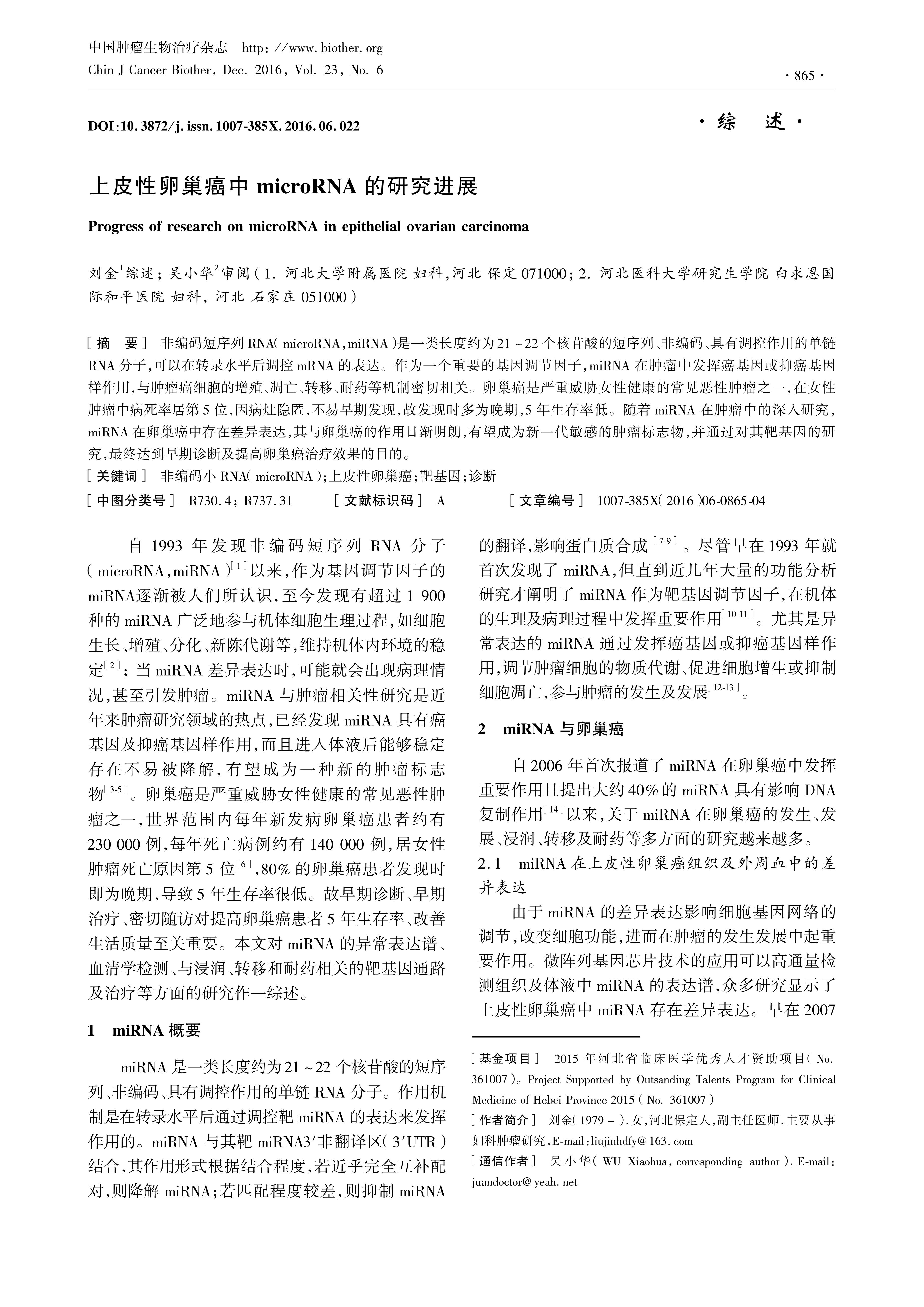 非编码短序列RNA(microRNA,miRNA)是一类长度约为21~22个核苷酸的短序列、非编码、具有调控作用的单链RNA分子,可以在转录水平后调控mRNA的表达。作为一个重要的基因调节因子,miRNA在肿瘤中发挥癌基因或抑癌基因样作用,与肿瘤癌细胞的增殖、凋亡、转移、耐药等机制密切相关。卵巢癌是严重威胁女性健康的常见恶性肿瘤之一,在女性肿瘤中病死率居第5位,因病灶隐匿,不易早期发现,故发现时多为晚期,5年生存率低。随着miRNA在肿瘤中的深入研究,miRNA在卵巢癌中存在差异表达,其与卵巢癌的作用日渐明朗,有望成为新一代敏感的肿瘤标志物,并通过对其靶基因的研究,最终达到早期诊断及提高卵巢癌治疗效果的目的。