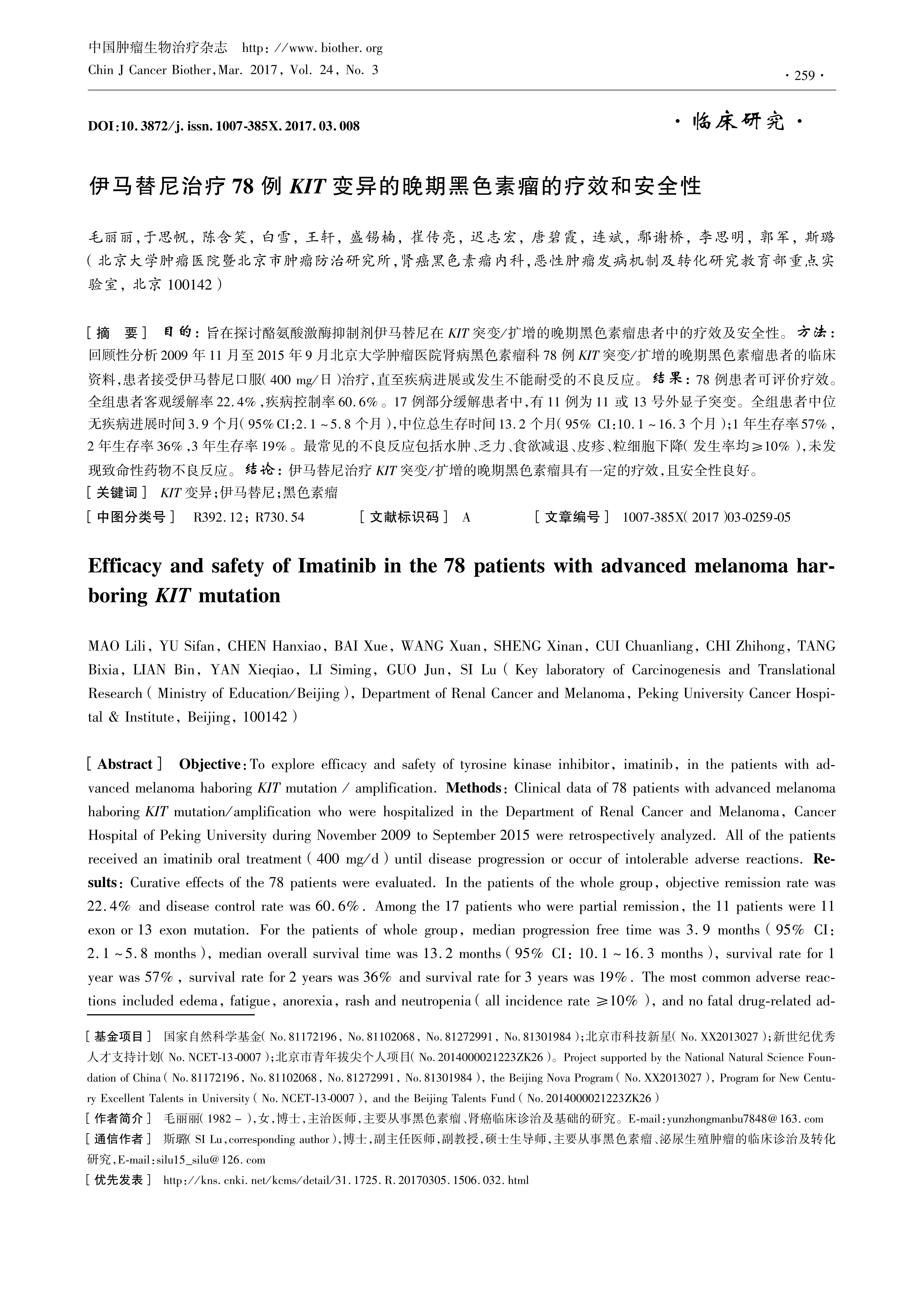 Objective:To explore efficacy and safety of tyrosine kinase inhibitor, imatinib, in the patients with advanced melanoma haboring KIT mutation / amplification. Methods: Clinical data of 78 patients with advanced melanoma haboring KIT mutation/amplification who were hospitalized in the Department of Renal Cancer and Melanoma, Cancer Hospital of Peking University during November 2009 to September 2015 were retrospectively analyzed. All of the patients received an imatinib oral treatment (400 mg/d) until disease progression or occur of intolerable adverse reactions. Results: Curative effects of the 78 patients were evaluated. In the patients of the whole group, objective remission rate was 22.4% and disease control rate was 60.6%. Among the 17 patients who were partial remission, the 11 patients were 11 exon or 13 exon mutation. For the patients of whole group, median progression free time was 3.9 months (95% CI: 2.1~5.8 months), median overall survival time was 13.2 months (95% CI: 10.1~16.3 months), survival rate for 1 year was 57%, survival rate for 2 years was 36% and survival rate for 3 years was 19%. The most common adverse reactions included edema, fatigue, anorexia, rash and neutropenia (all incidence rate ≥10%), and no fatal drug-related adverse reactions were observed. Conclusion:Imatinib could have certain curative effect for treatment of the patients with advanced melanoma baboring KIT mutation / amplification, and good safety.