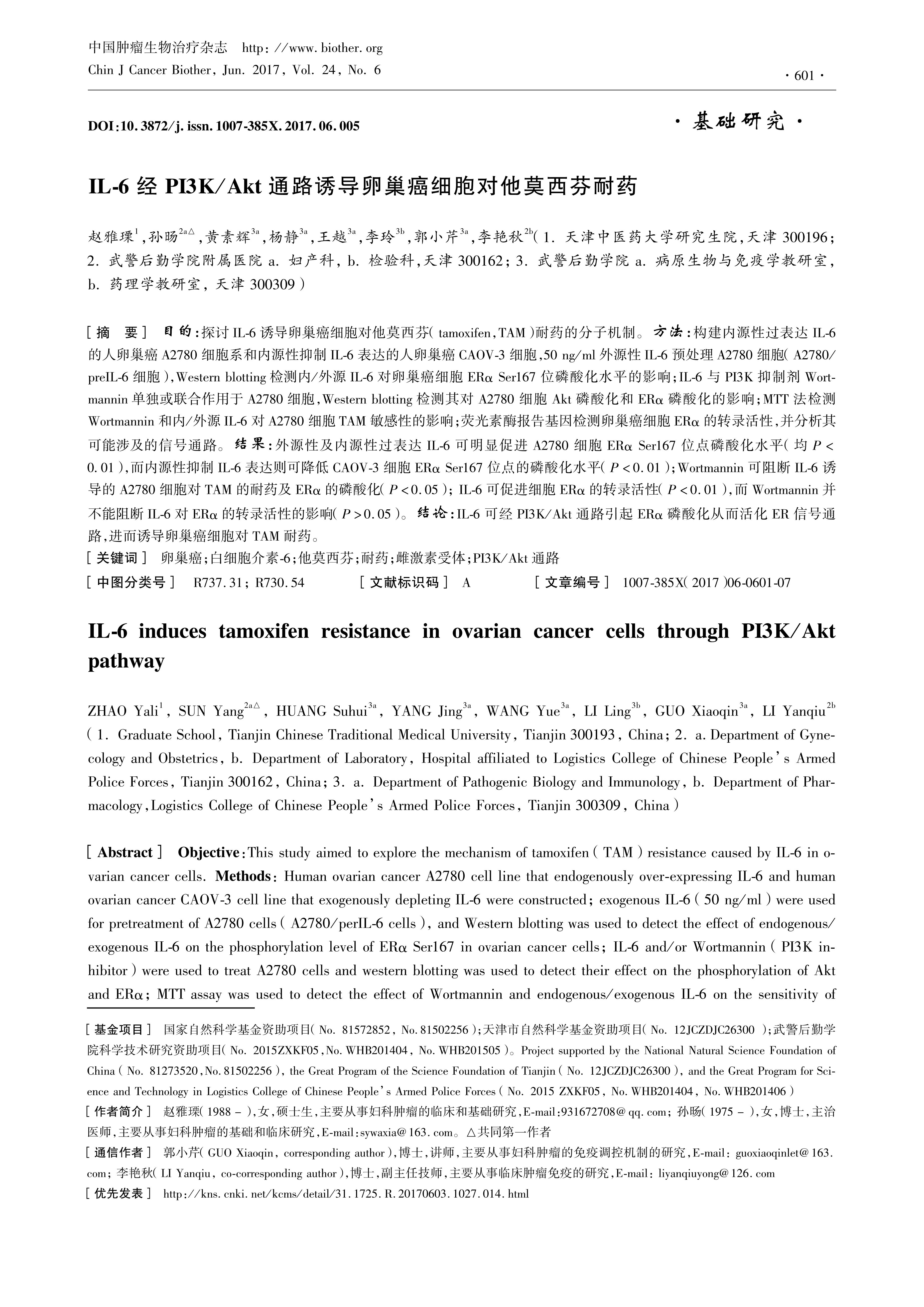 目的:探讨IL6诱导卵巢癌细胞对他莫西芬(tamoxifen,TAM)耐药的分子机制。方法:构建内源性过表达IL6的人卵巢癌A2780细胞系和内源性抑制IL6表达的人卵巢癌CAOV3细胞,50 ng/ml外源性IL6预处理A2780细胞(A2780/preIL6细胞),Western blotting检测内/外源IL6对卵巢癌细胞ERα Ser167位磷酸化水平的影响;IL6与PI3K抑制剂Wortmannin单独或联合作用于A2780细胞,Western blotting检测其对A2780细胞Akt磷酸化和ERα磷酸化的影响;MTT法检测Wortmannin和内/外源IL6对A2780细胞TAM敏感性的影响;荧光素酶报告基因检测卵巢癌细胞ERα的转录活性,并分析其可能涉及的信号通路。结果:外源性及内源性过表达IL6可明显促进A2780细胞ERα Ser167位点磷酸化水平(均P<001),而内源性抑制IL6表达则可降低CAOV3细胞ERα Ser167位点的磷酸化水平(P<0.01);Wortmannin可阻断IL6诱导的A2780细胞对TAM的耐药及ERα的磷酸化(P<0.05); IL6可促进细胞ERα的转录活性(P<0.01),而Wortmannin并不能阻断IL6对ERα的转录活性的影响(P>0.05)。结论:IL6可经PI3K/Akt通路引起ERα磷酸化从而活化ER信号通路,进而诱导卵巢癌细胞对TAM耐药。