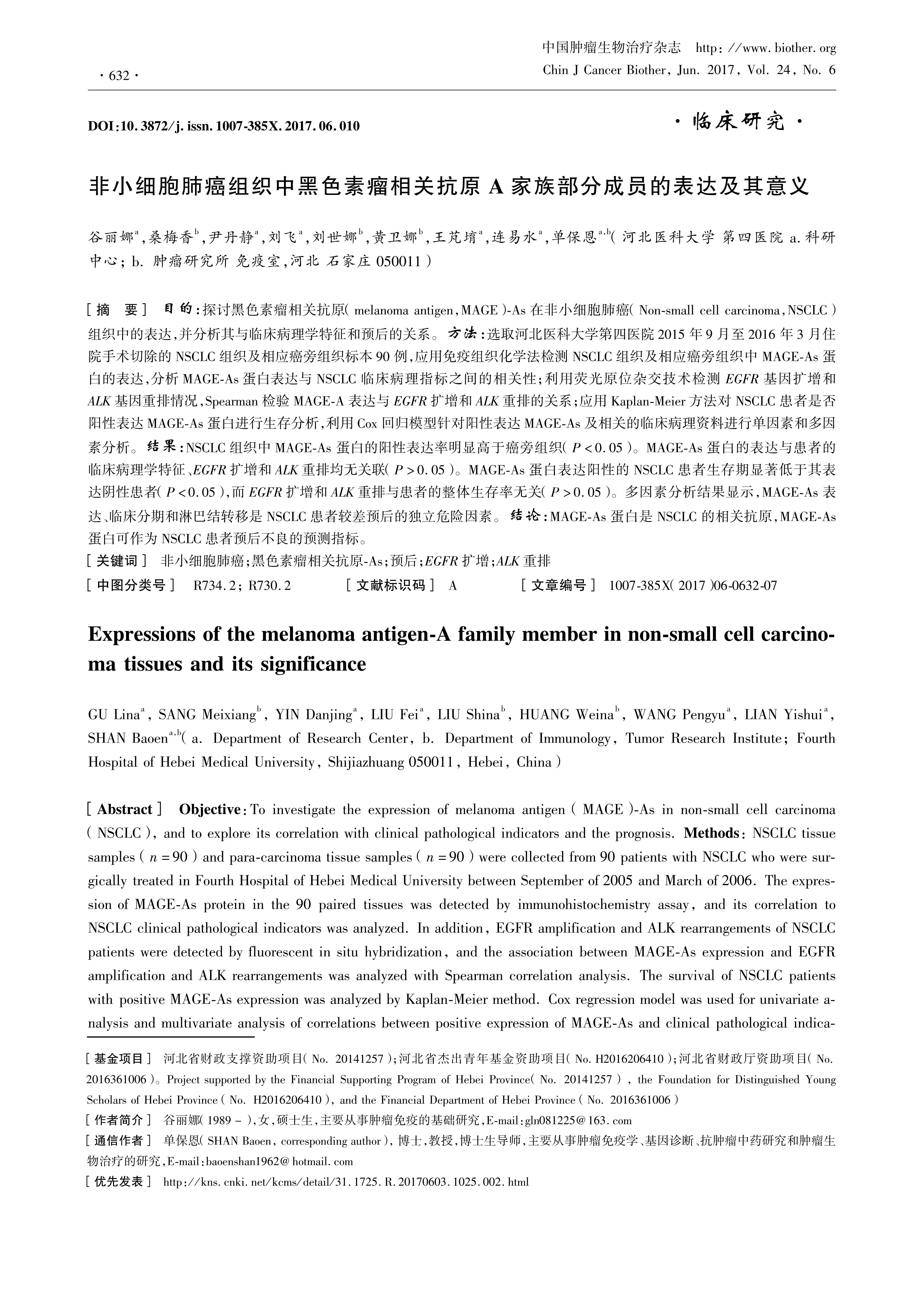 目的:探讨黑色素瘤相关抗原(melanoma antigen,MAGE)As在非小细胞肺癌(Nonsmall cell carcinoma,NSCLC)组织中的表达,并分析其与临床病理学特征和预后的关系。方法:选取河北医科大学第四医院2015年9月至2016年3月住院手术切除的NSCLC组织及相应癌旁组织标本90例,应用免疫组织化学法检测NSCLC组织及相应癌旁组织中MAGEAs蛋白的表达,分析MAGEAs蛋白表达与NSCLC临床病理指标之间的相关性;利用荧光原位杂交技术检测EGFR基因扩增和ALK基因重排情况,Spearman检验MAGEA表达与EGFR扩增和ALK重排的关系;应用KaplanMeier方法对NSCLC患者是否阳性表达MAGEAs蛋白进行生存分析,利用Cox回归模型针对阳性表达MAGEAs及相关的临床病理资料进行单因素和多因素分析。结果:NSCLC组织中MAGEAs 蛋白的阳性表达率明显高于癌旁组织(P<0.05)。MAGEAs蛋白的表达与患者的临床病理学特征、EGFR扩增和ALK重排均无关联(P>0.05)。MAGEAs蛋白表达阳性的NSCLC患者生存期显著低于其表达阴性患者(P<0.05),而EGFR扩增和ALK重排与患者的整体生存率无关(P>0.05)。多因素分析结果显示,MAGEAs表达、临床分期和淋巴结转移是NSCLC患者较差预后的独立危险因素。结论:MAGEAs蛋白是NSCLC的相关抗原,MAGEAs蛋白可作为NSCLC患者预后不良的预测指标。