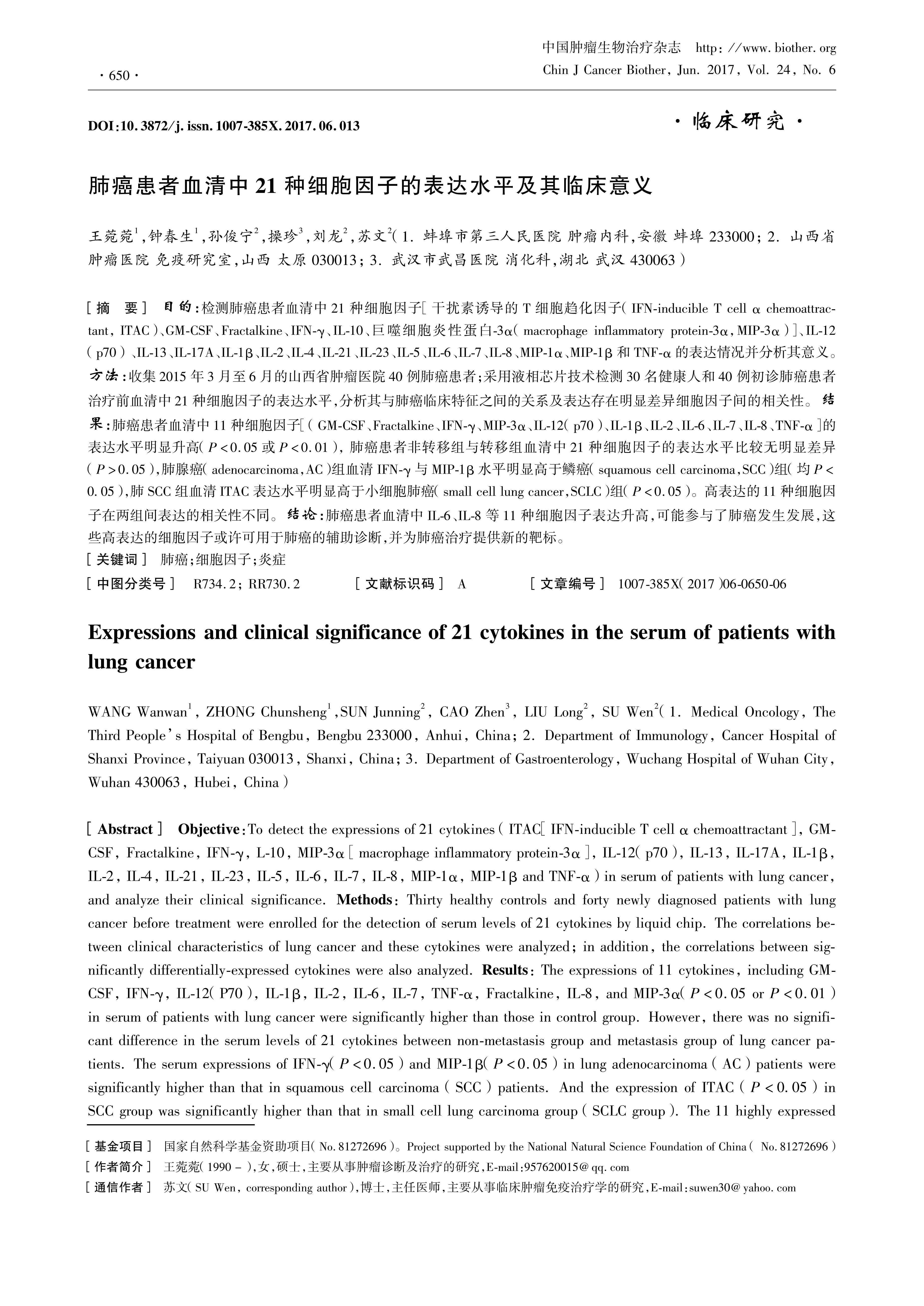 目的:检测肺癌患者血清中21种细胞因子\[干扰素诱导的T细胞趋化因子(IFNinducible T cell α chemoattractant, ITAC)、GMCSF、Fractalkine、IFNγ、IL10、巨噬细胞炎性蛋白3α(macrophage inflammatory protein3α,MIP3α)\]、IL12(p70) 、IL13、IL17A、IL1β、IL2、IL4、IL21、IL23、IL5、IL6、IL7、IL8、MIP1α、MIP1β和TNFα的表达情况并分析其意义。方法:收集2015年3月至6月的山西省肿瘤医院40例肺癌患者;采用液相芯片技术检测30名健康人和40例初诊肺癌患者治疗前血清中21种细胞因子的表达水平,分析其与肺癌临床特征之间的关系及表达存在明显差异细胞因子间的相关性。结果:肺癌患者血清中11种细胞因子\[(GMCSF、Fractalkine、IFNγ、MIP3α、IL12(p70)、IL1β、IL2、IL6、IL7、IL8、TNFα\]的表达水平明显升高(P<0.05或P<0.01), 肺癌患者非转移组与转移组血清中21种细胞因子的表达水平比较无明显差异(P>0.05),肺腺癌(adenocarcinoma,AC)组血清IFNγ与MIP1β水平明显高于鳞癌(squamous cell carcinoma,SCC)组(均P<005),肺SCC组血清ITAC表达水平明显高于小细胞肺癌(small cell lung cancer,SCLC)组(P<0.05)。高表达的11种细胞因子在两组间表达的相关性不同。结论:肺癌患者血清中IL6、IL8等11种细胞因子表达升高,可能参与了肺癌发生发展,这些高表达的细胞因子或许可用于肺癌的辅助诊断,并为肺癌治疗提供新的靶标。
